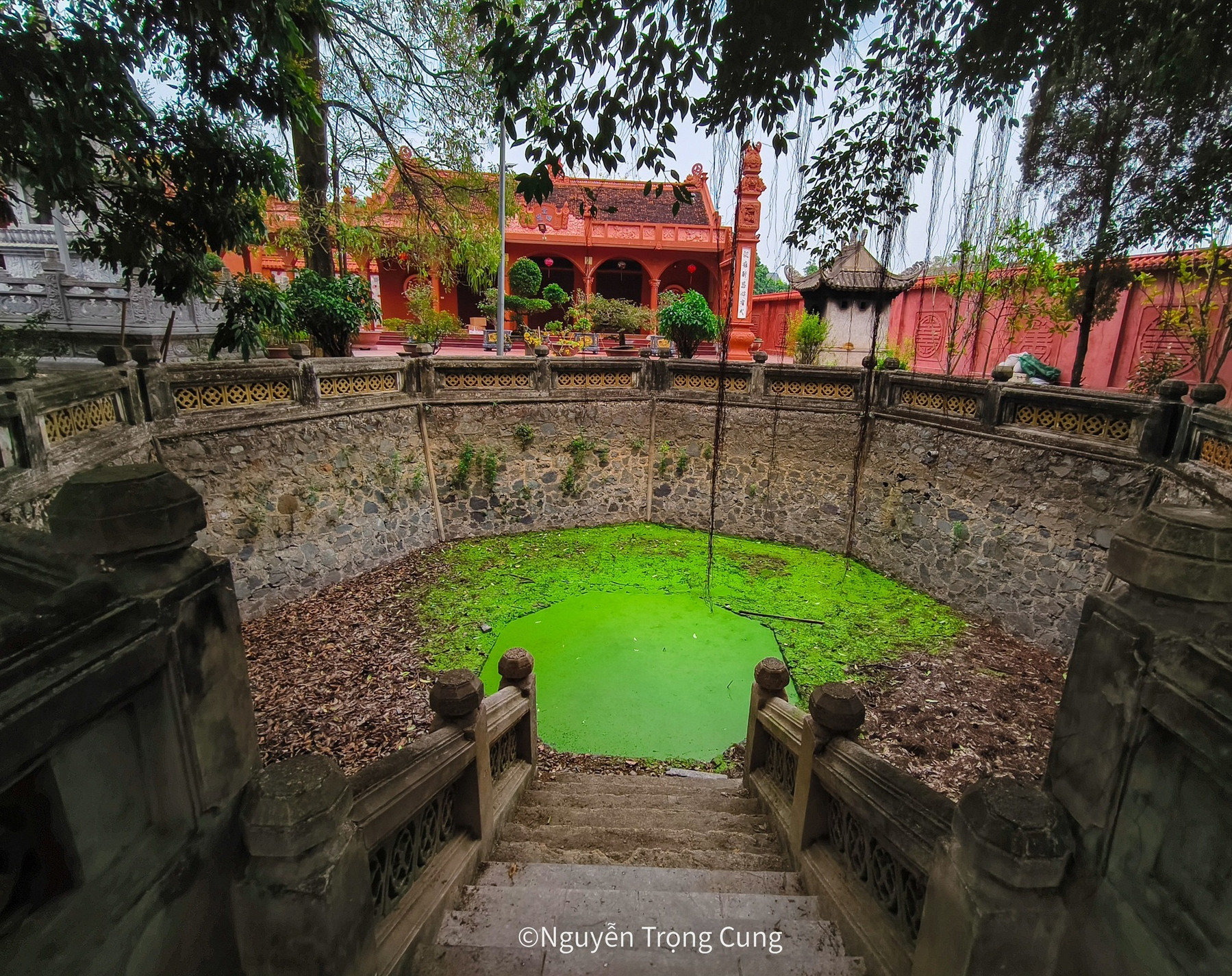 Giữa sân chùa là một đầm hoa súng nước xanh biếc như ngọc bích. Vào mùa, hoa súng nở rộ đủ màu xanh, vàng, hồng, tạo điểm nhấn thẩm mỹ cho không gian.