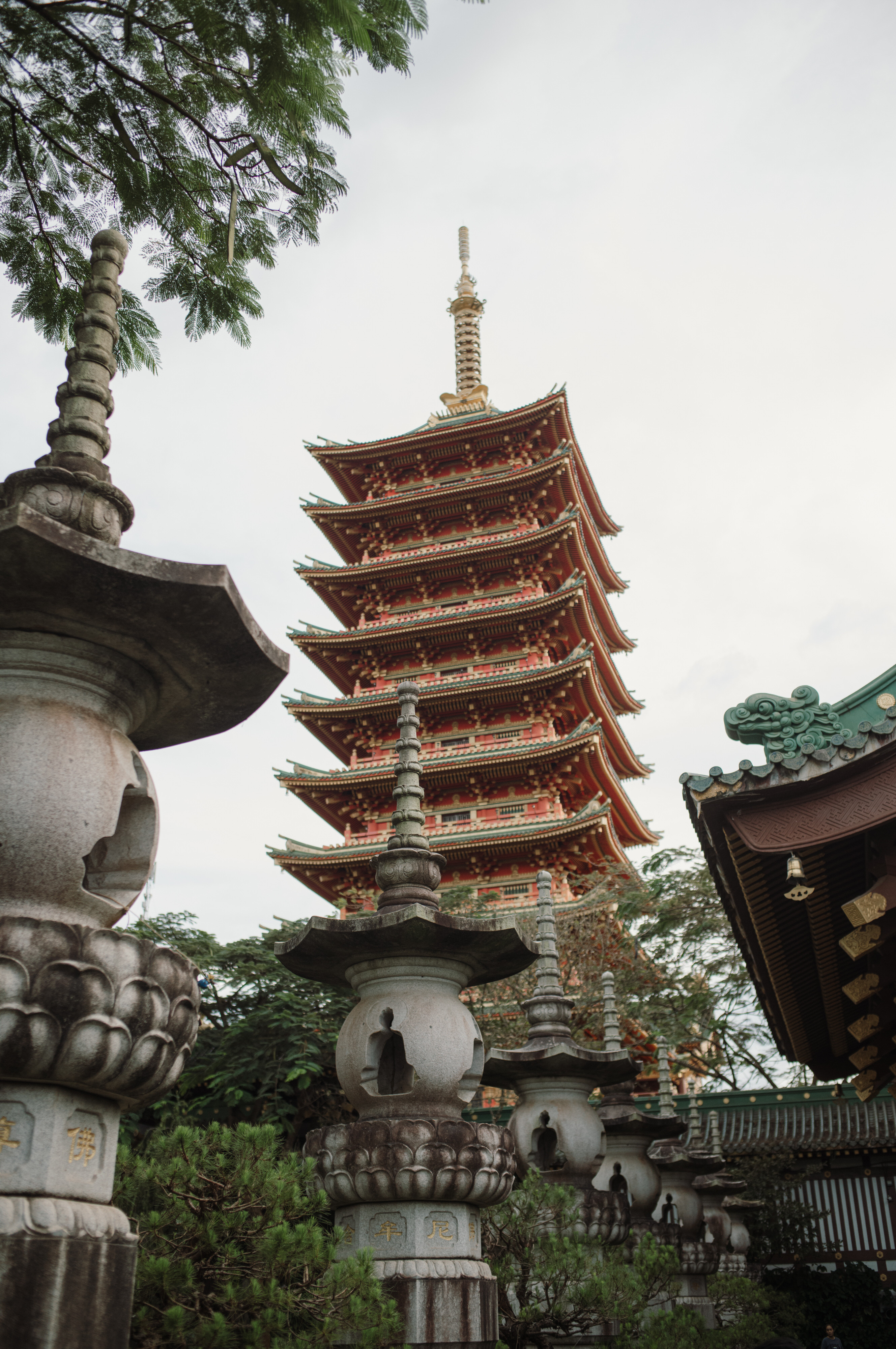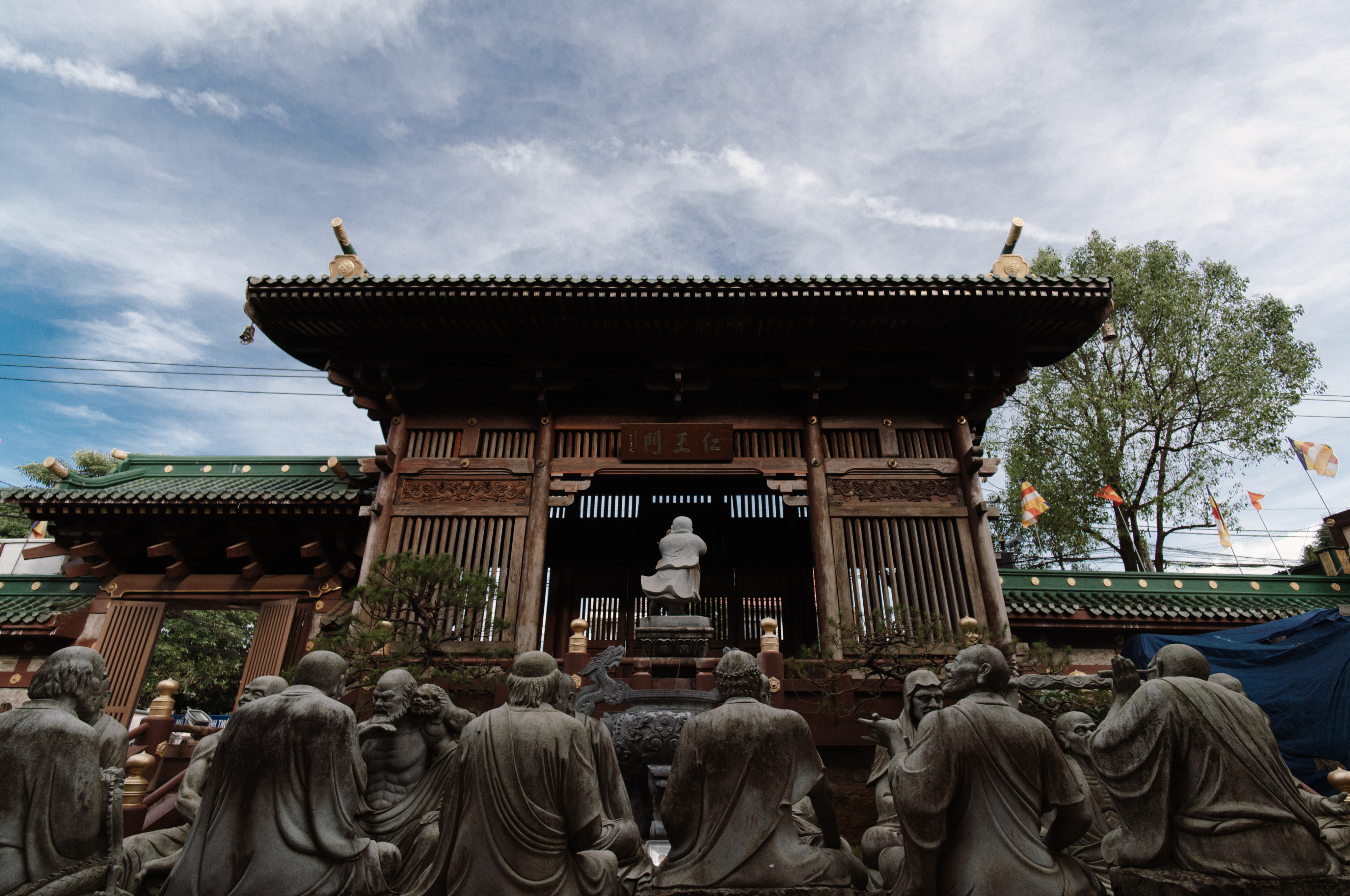 Trước mặt chánh điện là tượng đá 18 vị la hán bề thế nhuốm màu rêu phong của thời gian. Khu tăng phường nằm bên phải chánh điện có diện tích hàng ngàn mét vuông bao gồm trai đường, giảng đường, thiền đường và tàng kinh cát.