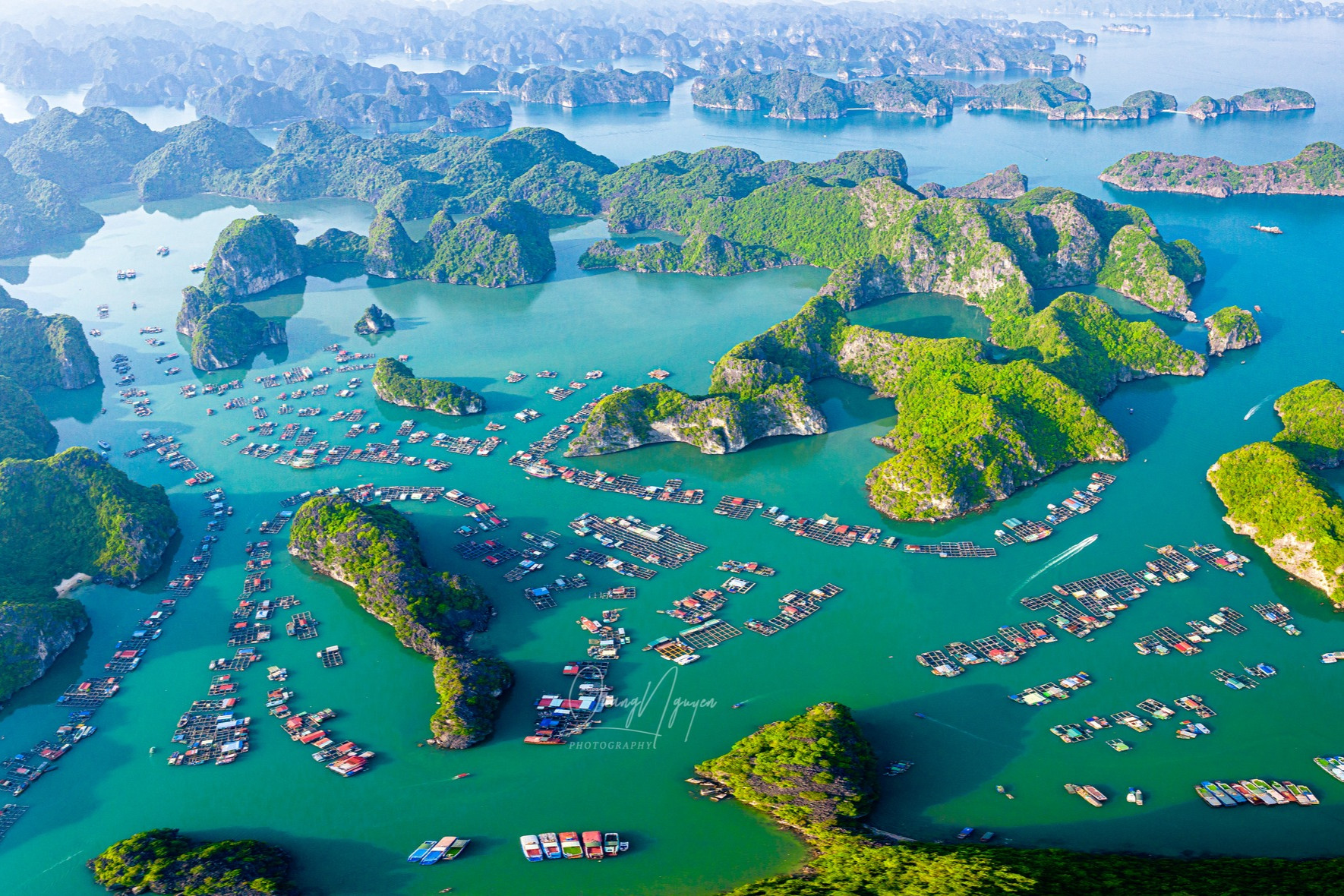 Vẻ đẹp mê hoặc của ngôi làng nổi yên bình nằm giữa vịnh Lan Hạ khi nhìn từ trên cao (Ảnh: Quang Nguyễn, Tú Trần).