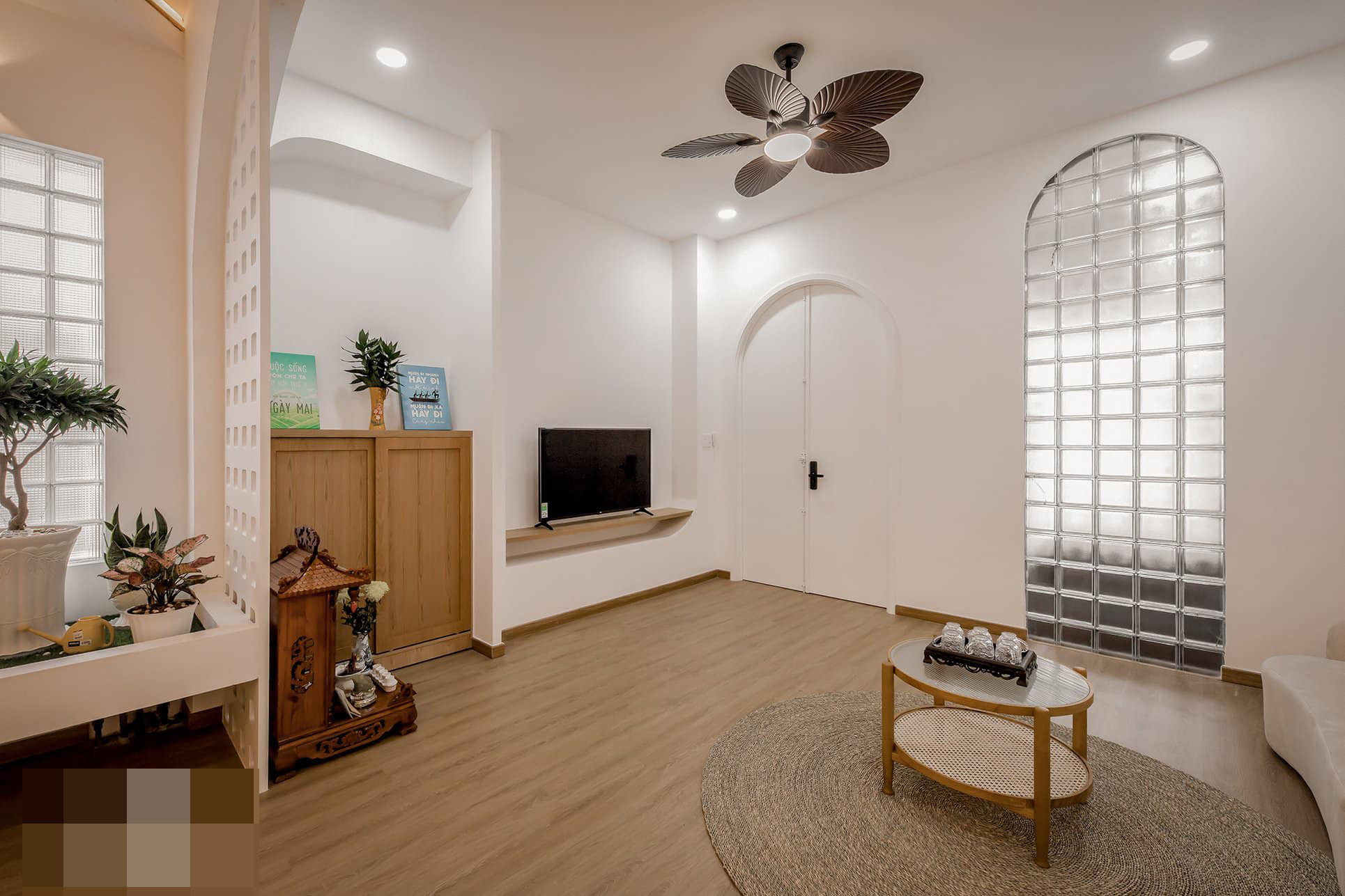 Tầng 1 gồm phòng khách, phòng bếp, bàn ăn, phòng ngủ người già và 1 phòng vệ sinh. Mảng tường giáp với sân cổng, anh Quý dùng gạch kính lấy sáng tạo điểm nhấn đồng thời giúp nhà có nhiều ánh sáng tự nhiên hơn.