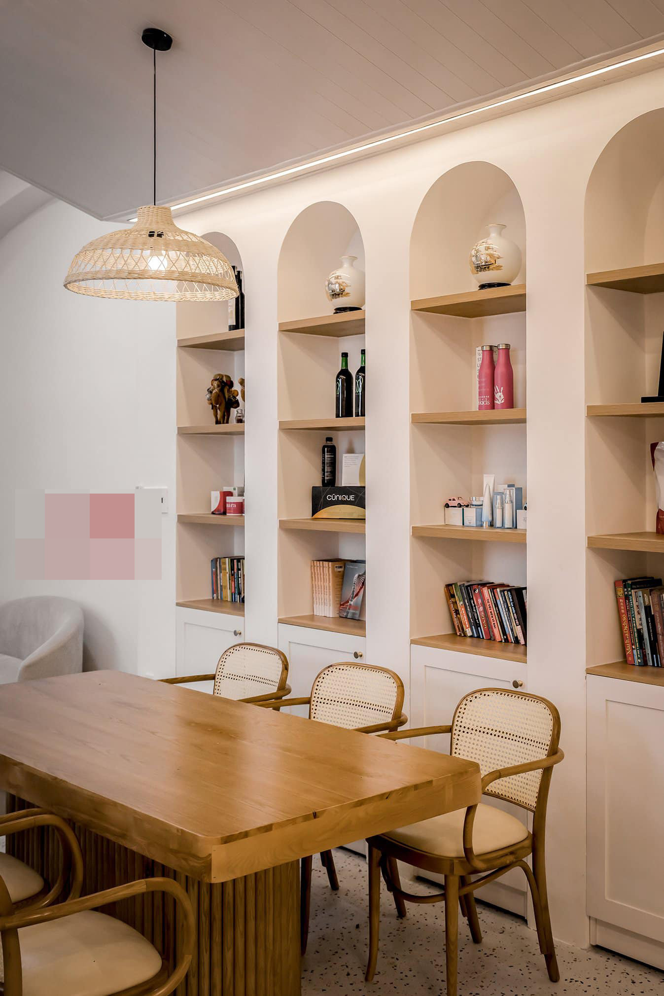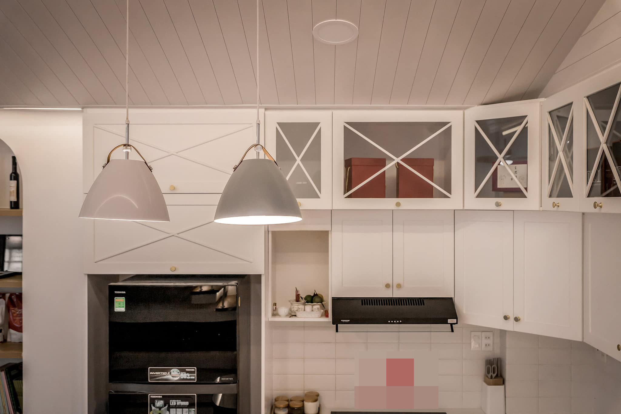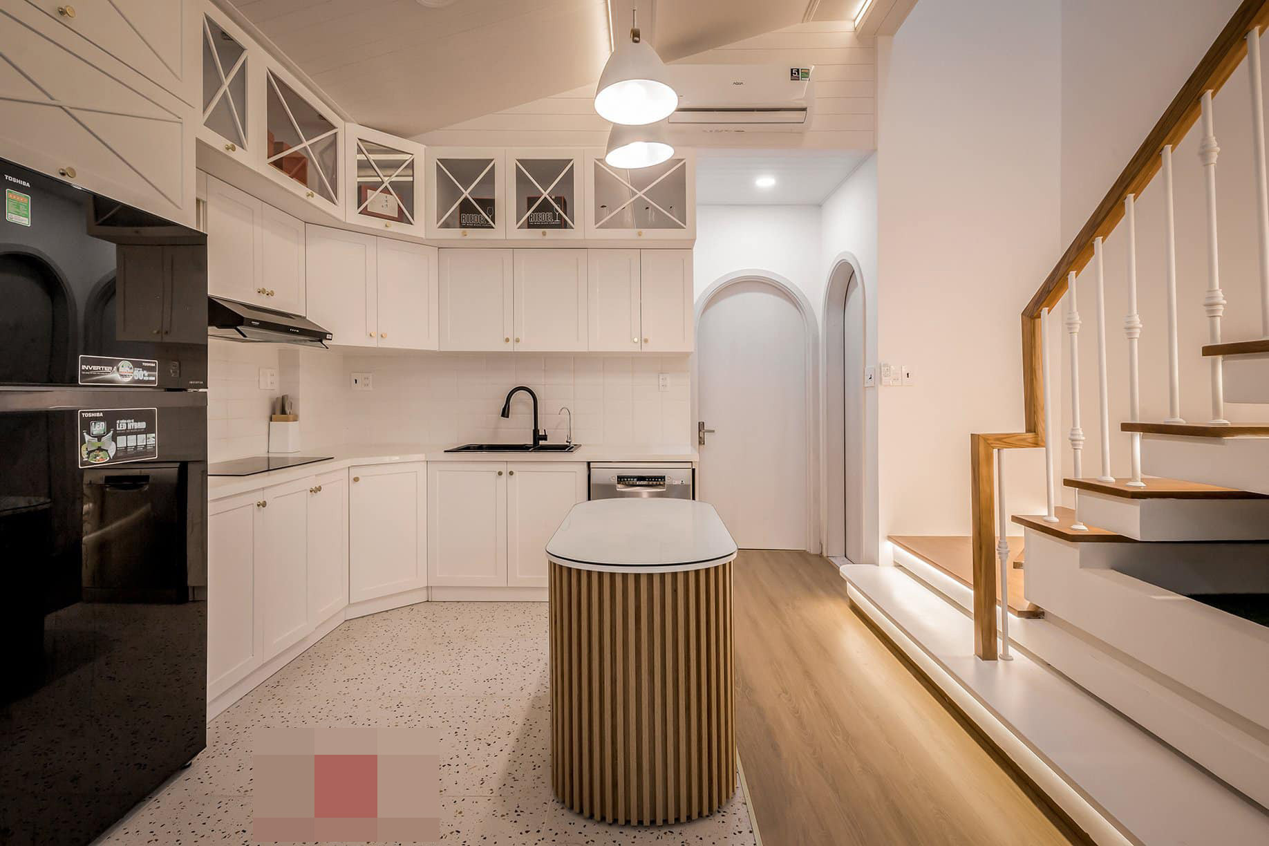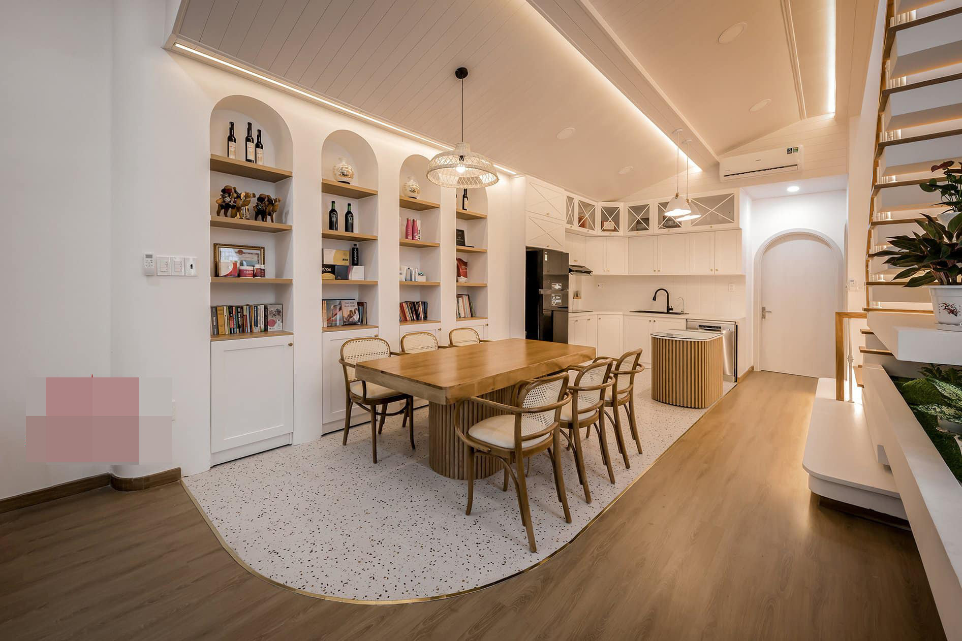 Phòng bếp và khu vực bàn ăn rộng rãi. Phía sau bàn ăn, anh Quý bố trí những tủ kệ nhỏ trưng bày sách và đồ kỷ niệm, đồ decor. Không gian nhờ đó trở nên sang trọng hơn. Tủ bếp màu trắng nổi bật trên nền sàn đá mài và sàn gỗ vàng ấm. Bàn đảo là nơi sơ chế, bày biện đồ ăn. Phía sau tủ bếp là cánh cửa dẫn đến phòng ngủ cho người lớn tuổi và phòng vệ sinh.