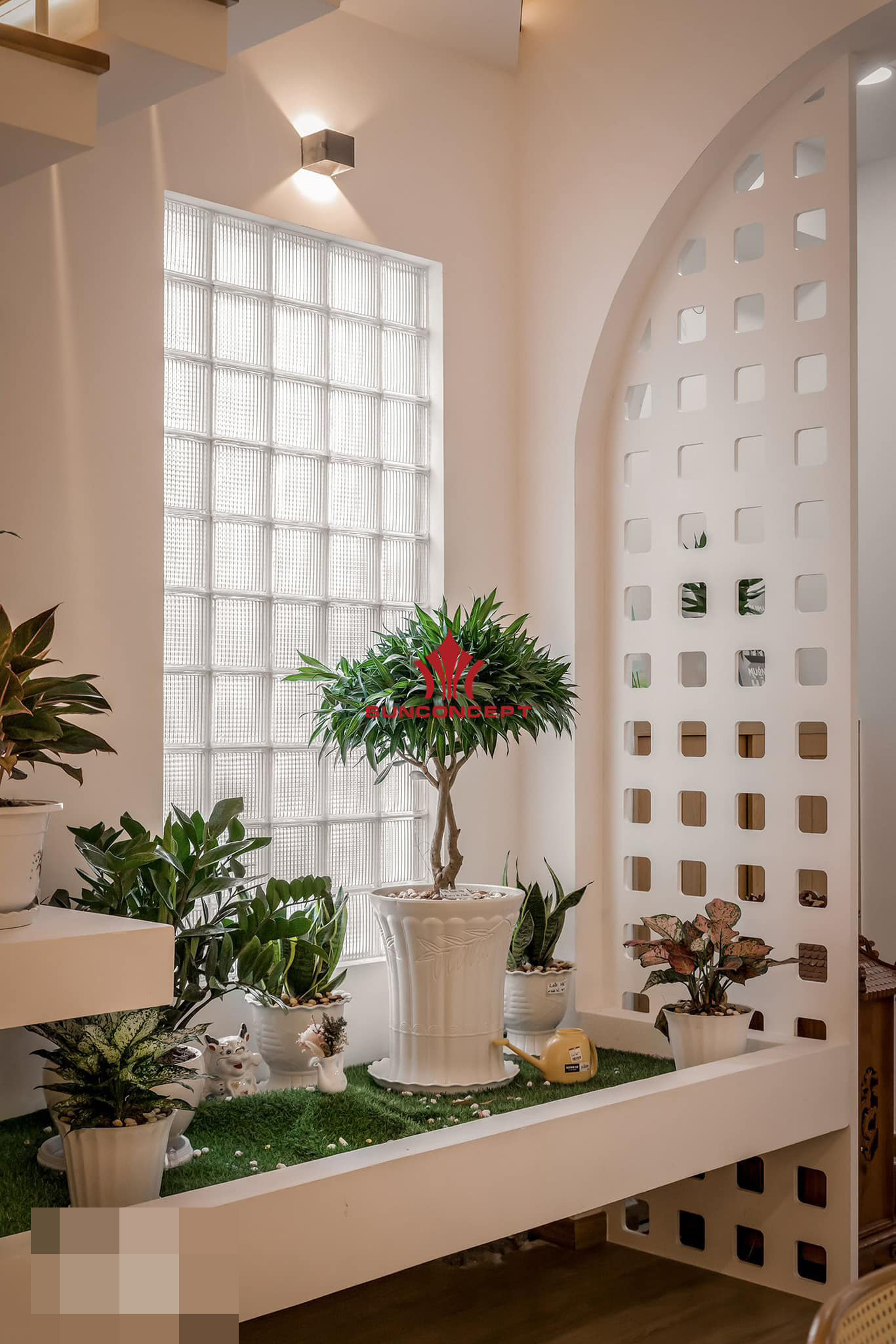 Chi tiết nhỏ trong nhà nhưng đủ để không gian mang nét riêng biệt, ghi dấu ấn khó phai. Phần tường gần cầu thang, anh Quý dùng gạch lộ. Cách làm này giúp che được cầu thang lại tạo được góc nhà nghệ thuật với cây xanh và thảm cỏ.