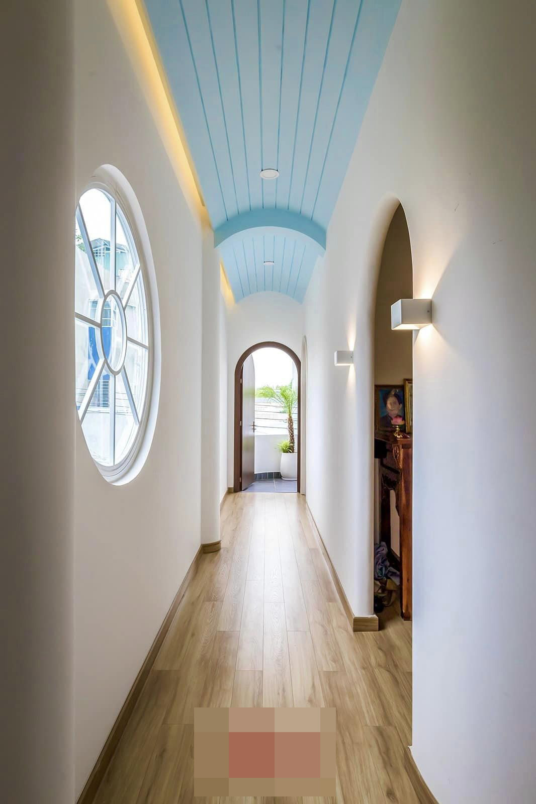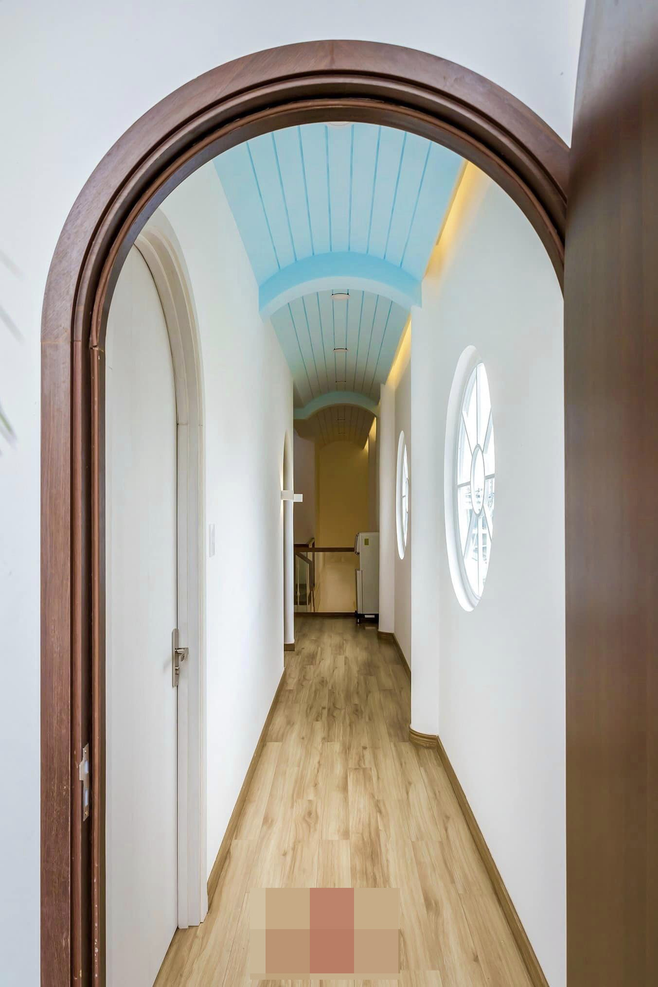 Sảnh tầng 2 dẫn vào các phòng ngủ, trần gỗ xanh uốn cong, kết hợp với các cánh cửa vòm tạo cảm giác như một khoang tàu thủy ngoài khơi.