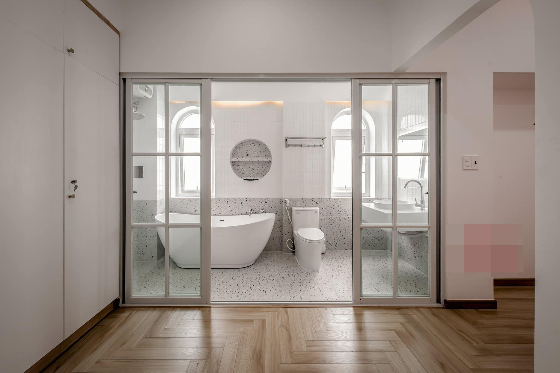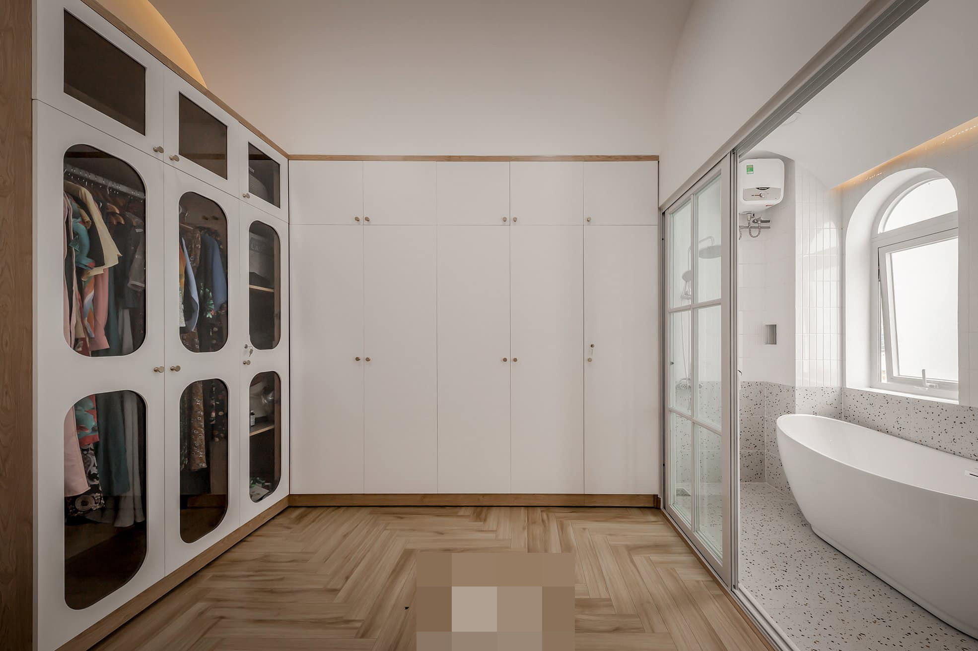 Khu thay đồ và phòng tắm trong phòng ngủ master. Sàn gỗ lát kiểu zích zắc lạ mắt.