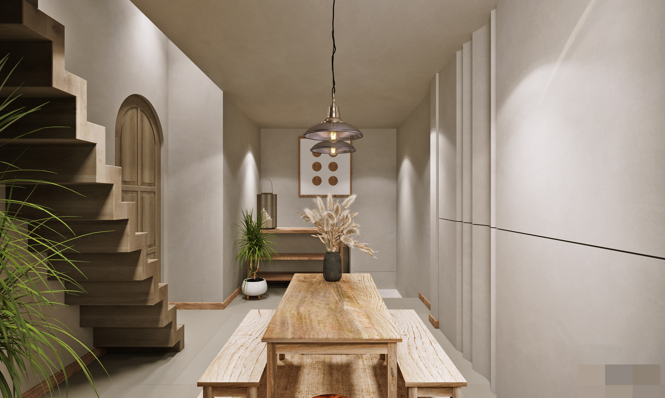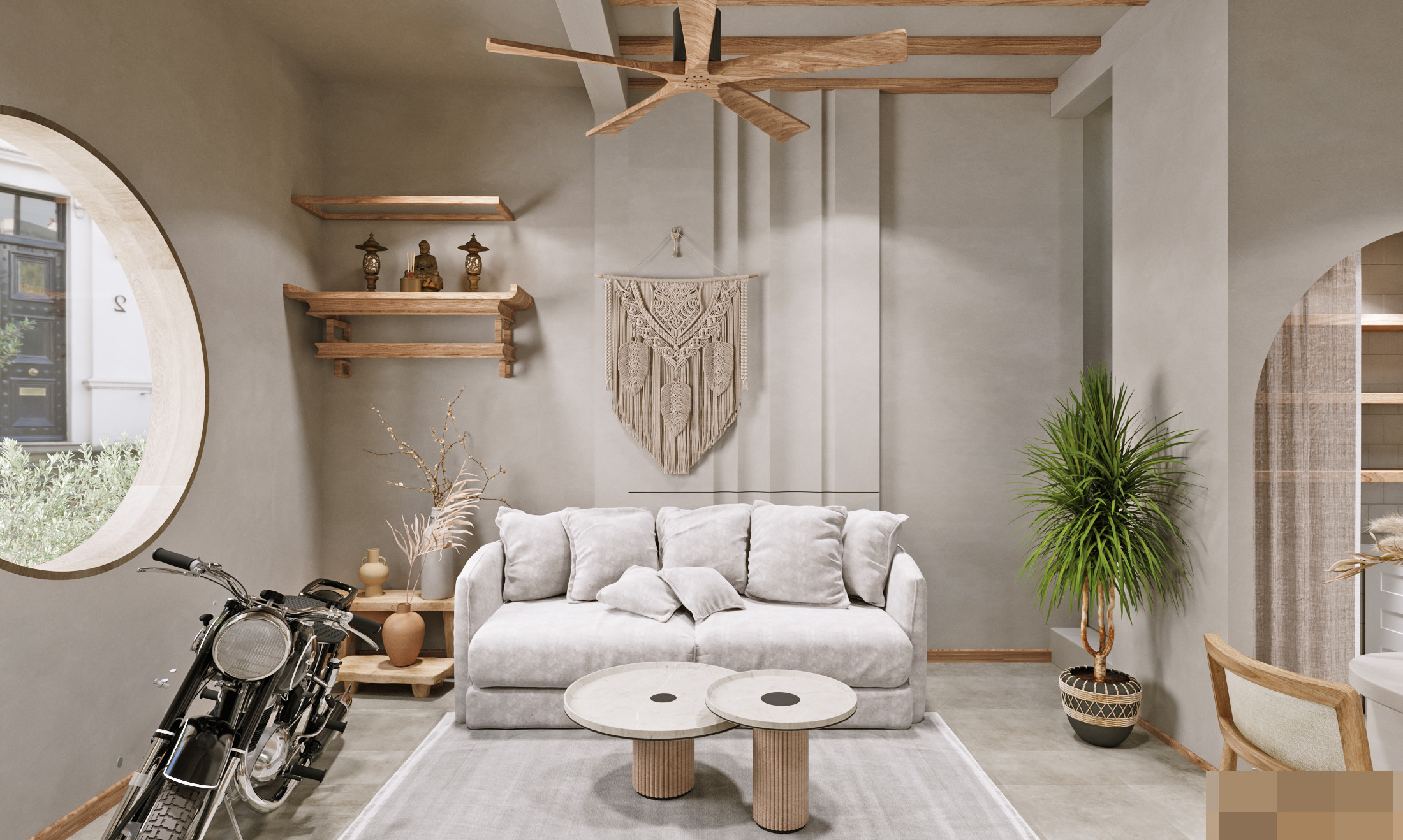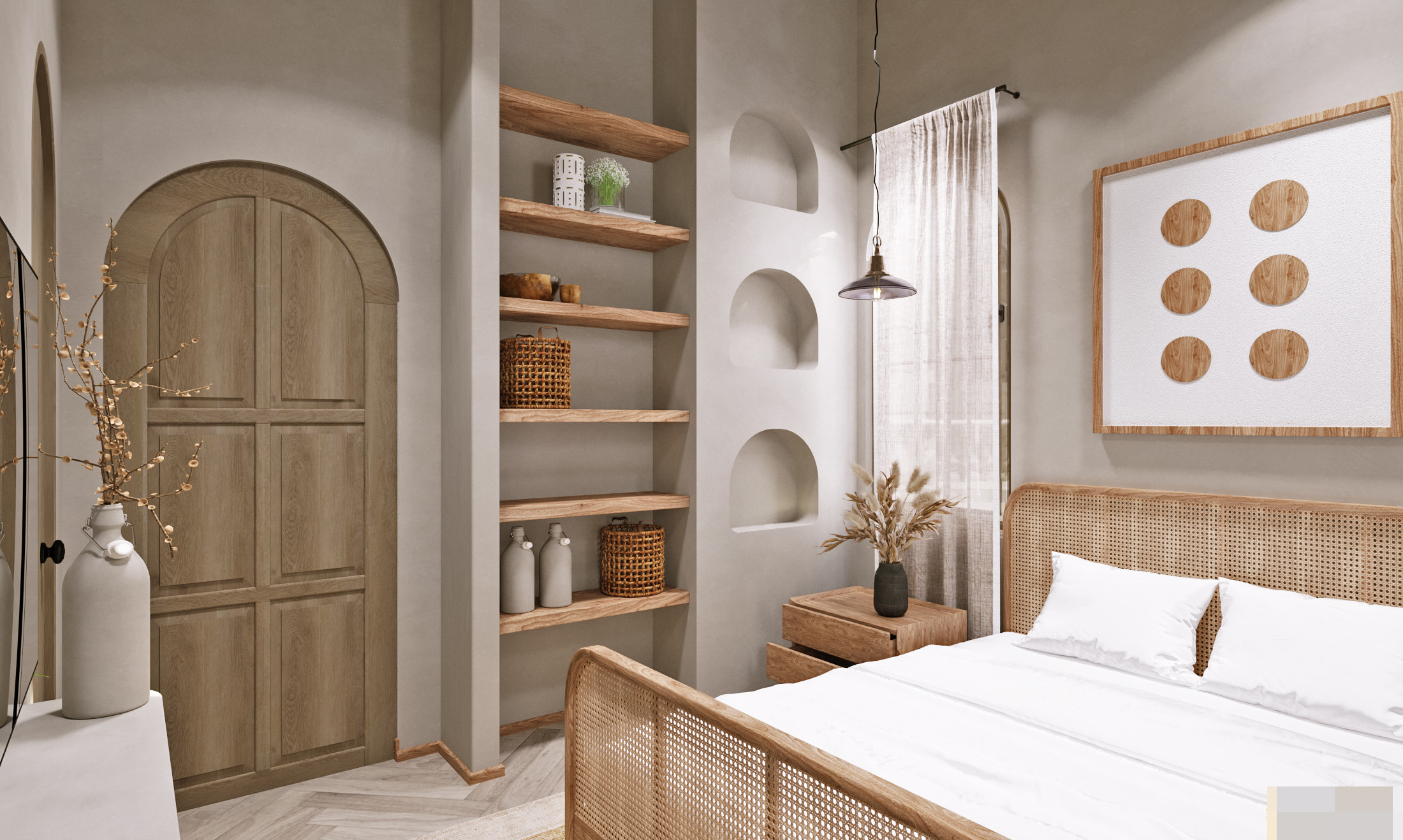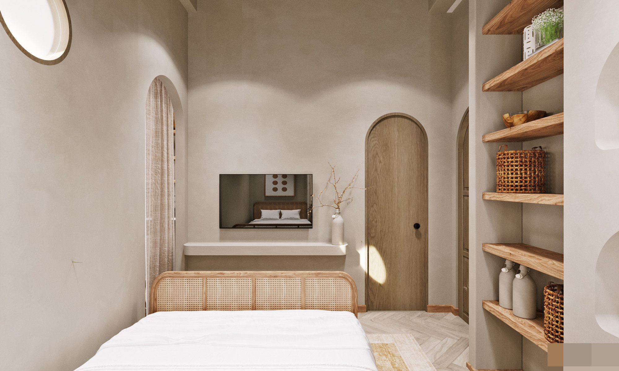 Phong cách chủ đạo là Wabi Sabi kết hợp hiện đại với tone màu chủ đạo trắng - gỗ. Đây là đặc trưng cho phong cách thiết kế này.