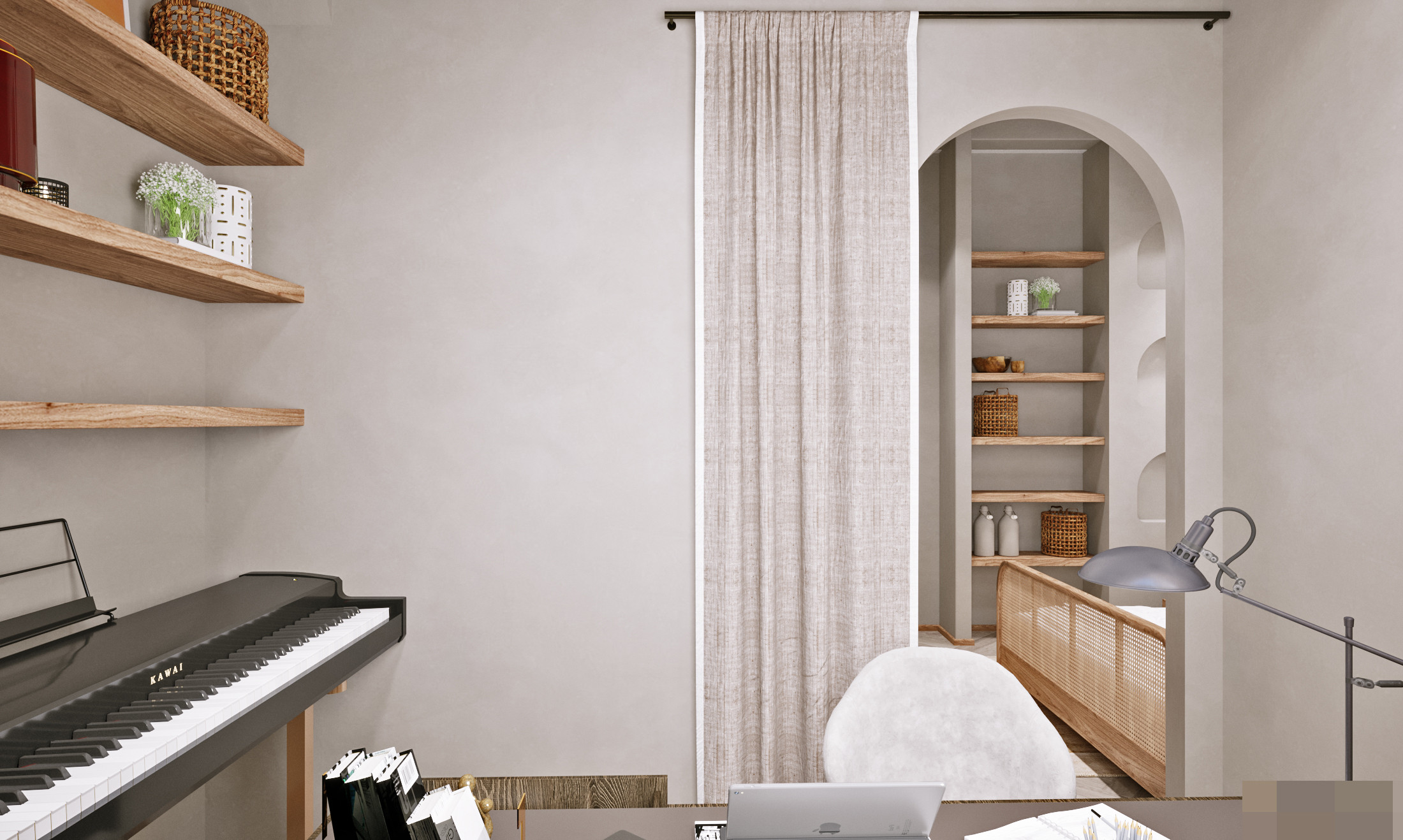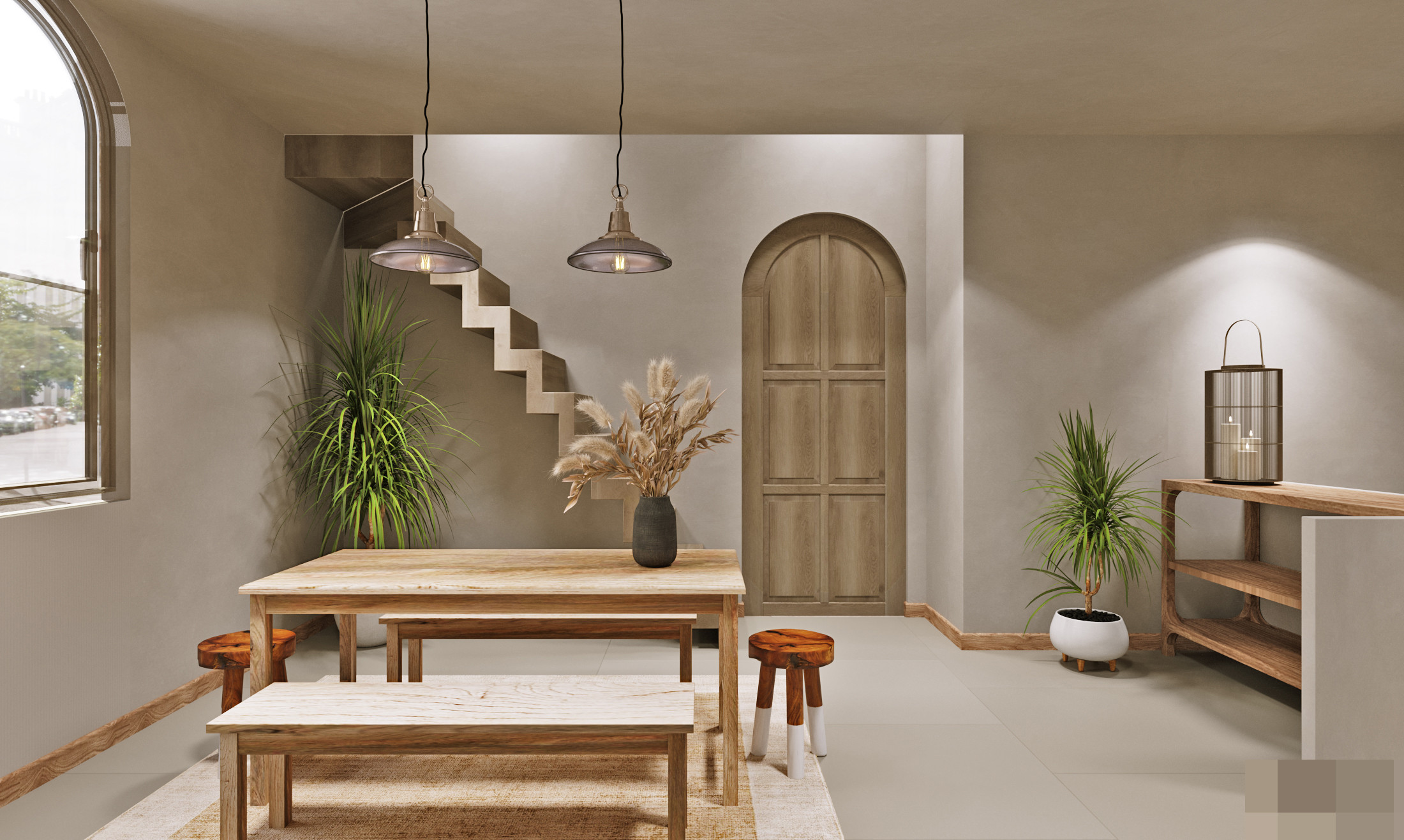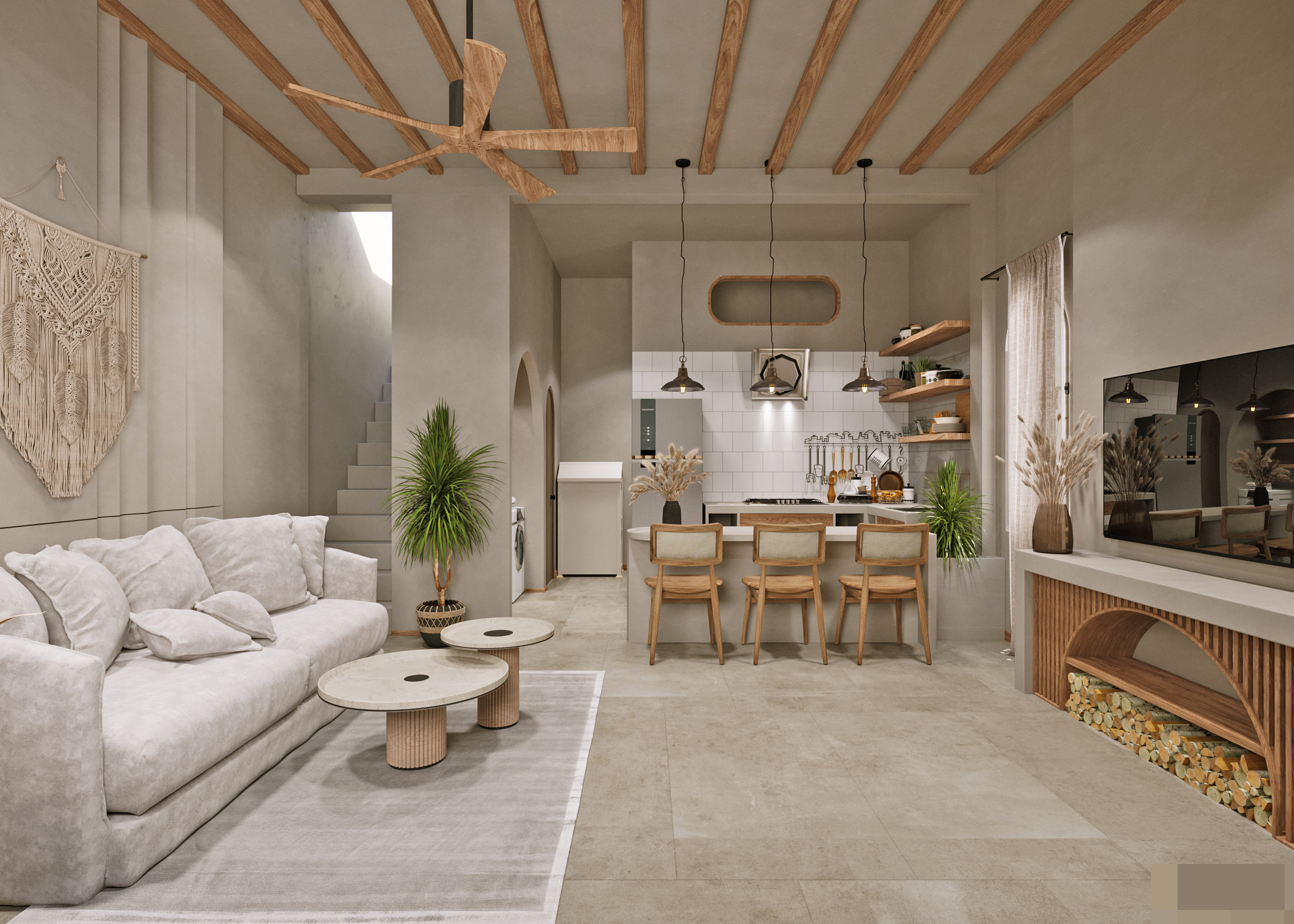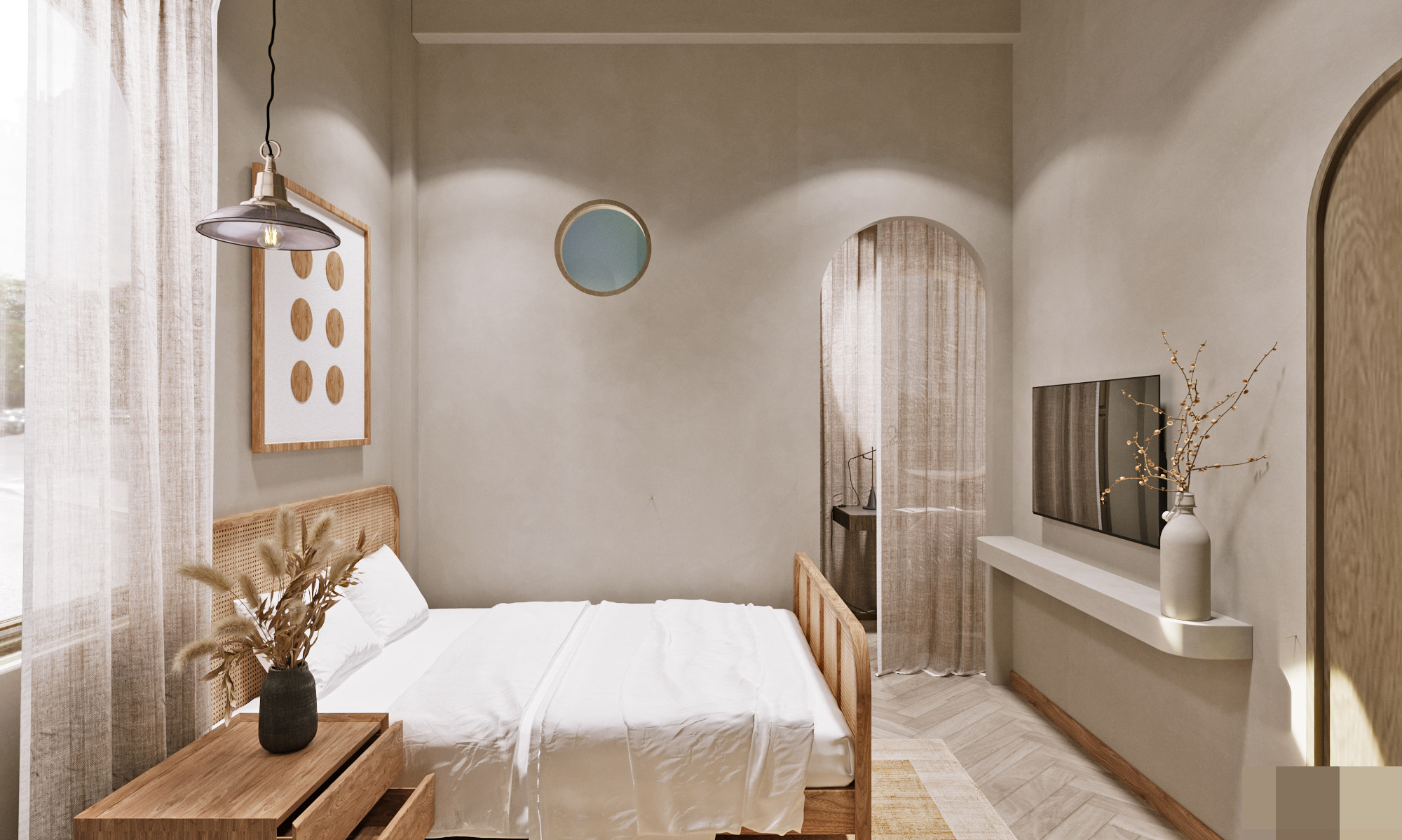 Phong cách chủ đạo là Wabi Sabi kết hợp hiện đại với tone màu chủ đạo trắng - gỗ. Đây là đặc trưng cho phong cách thiết kế này.