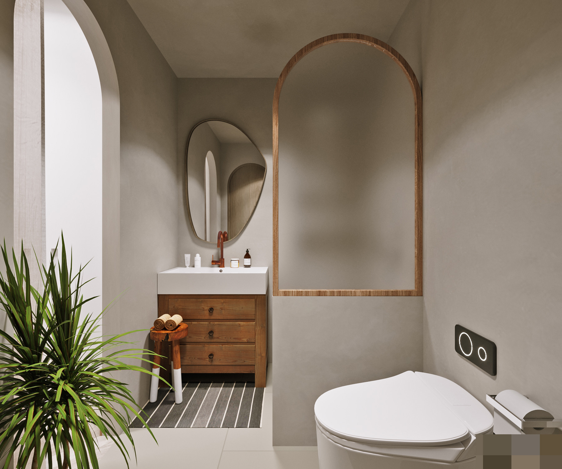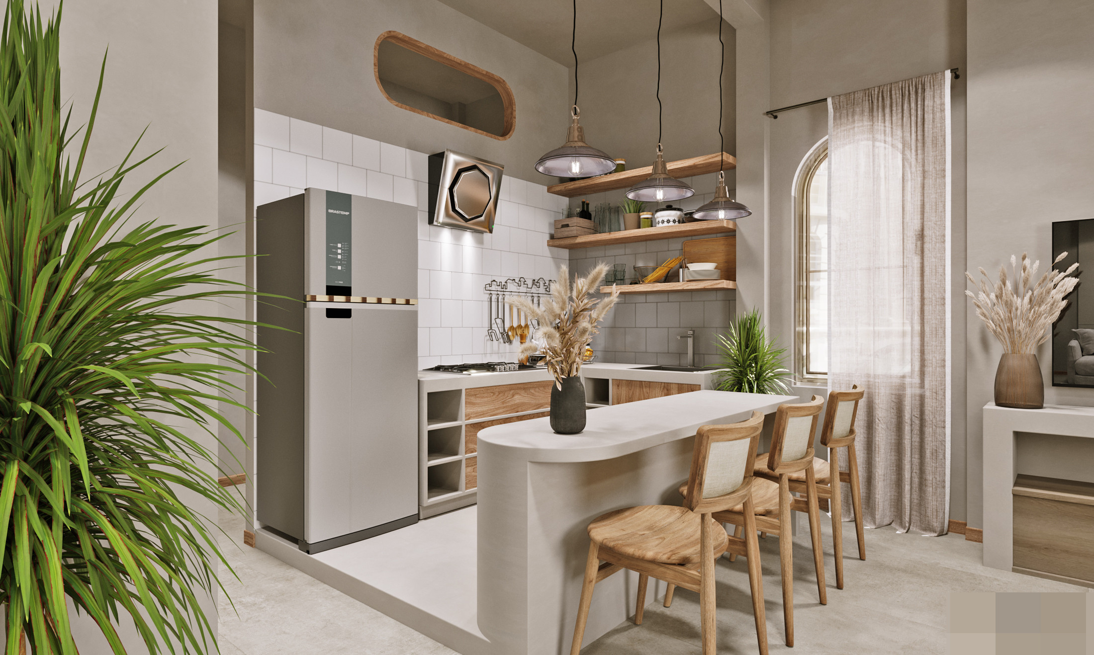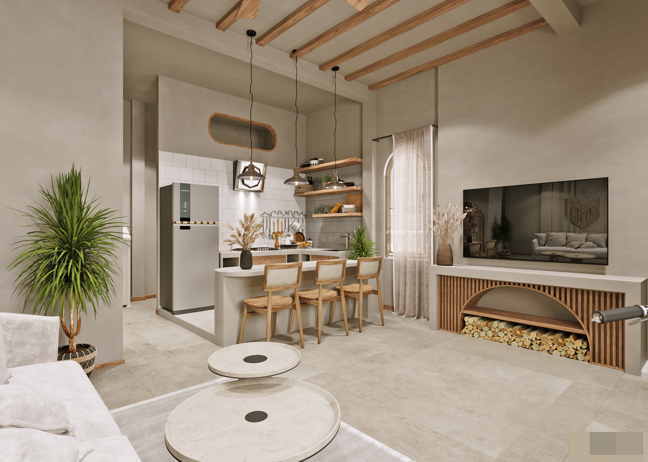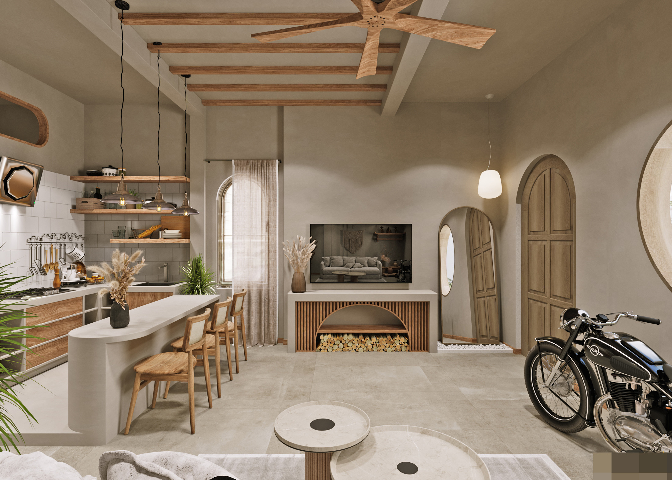 Phong cách chủ đạo là Wabi Sabi kết hợp hiện đại với tone màu chủ đạo trắng - gỗ. Đây là đặc trưng cho phong cách thiết kế này.