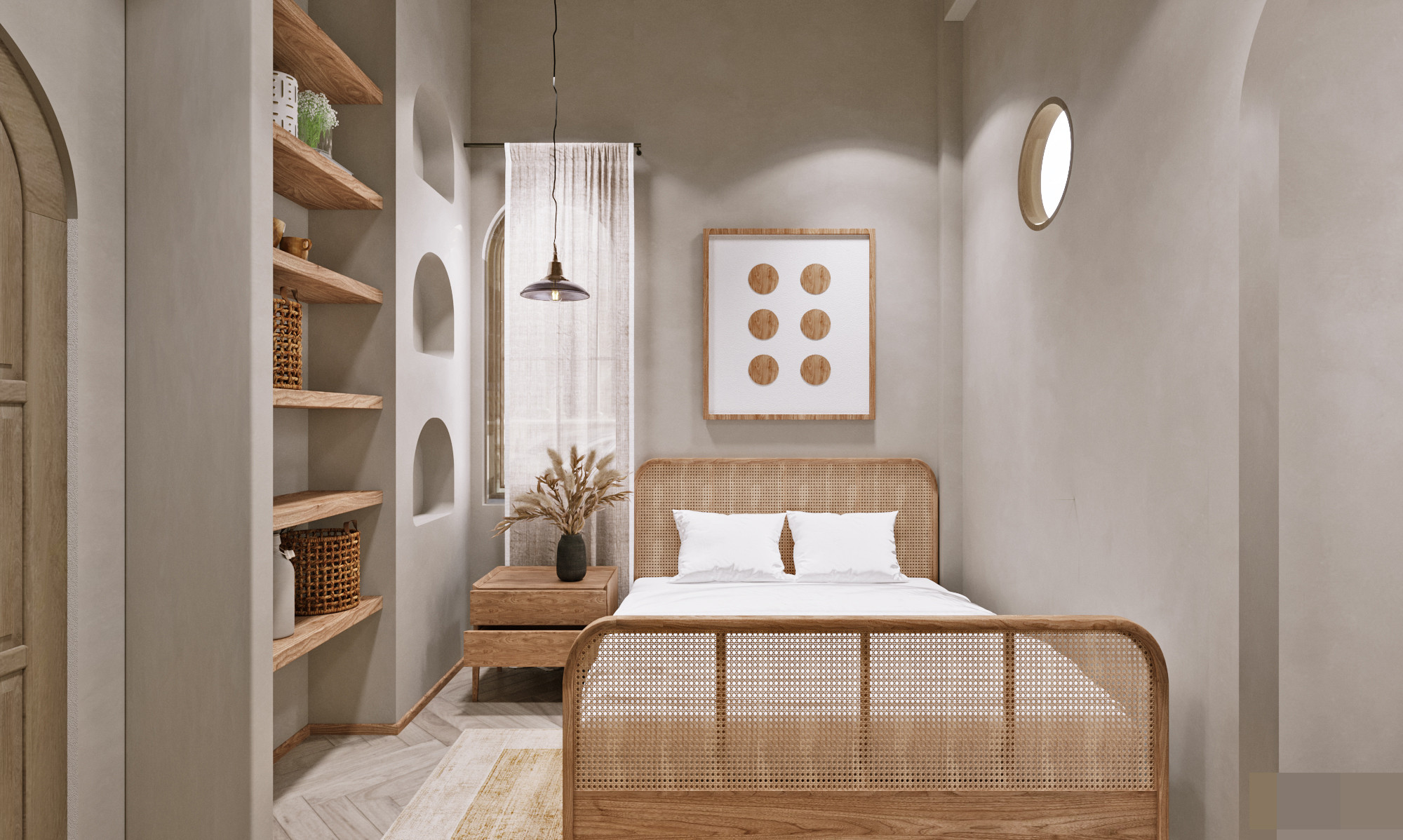 Không gian phòng ngủ tối giản, thoáng đãng với hệ tủ kệ mở trưng bày đồ gốm và đựng đồ lặt vặt. Nhóm thiết kế đã làm bức tường thạch cao, tạo ra các hộc tường trang trí ấn tượng.