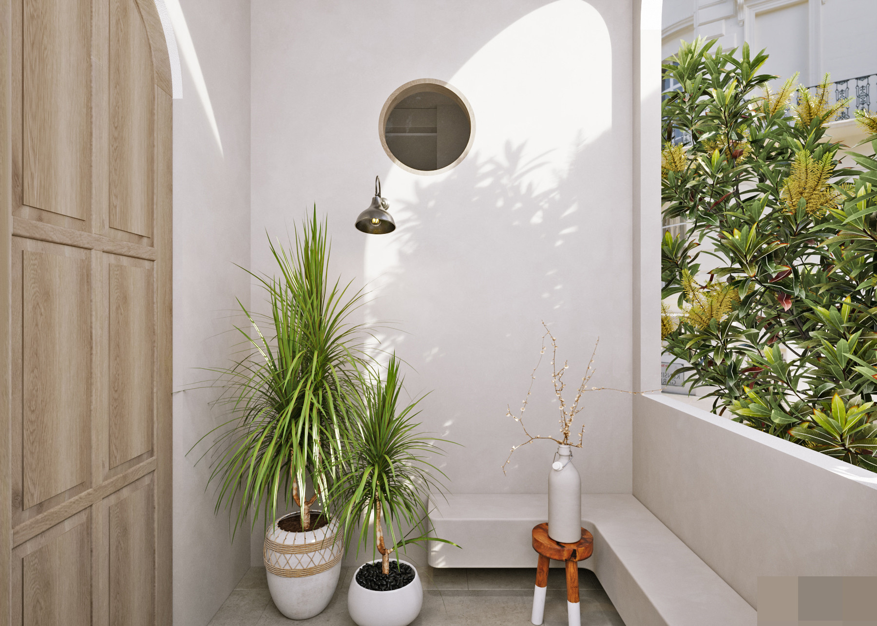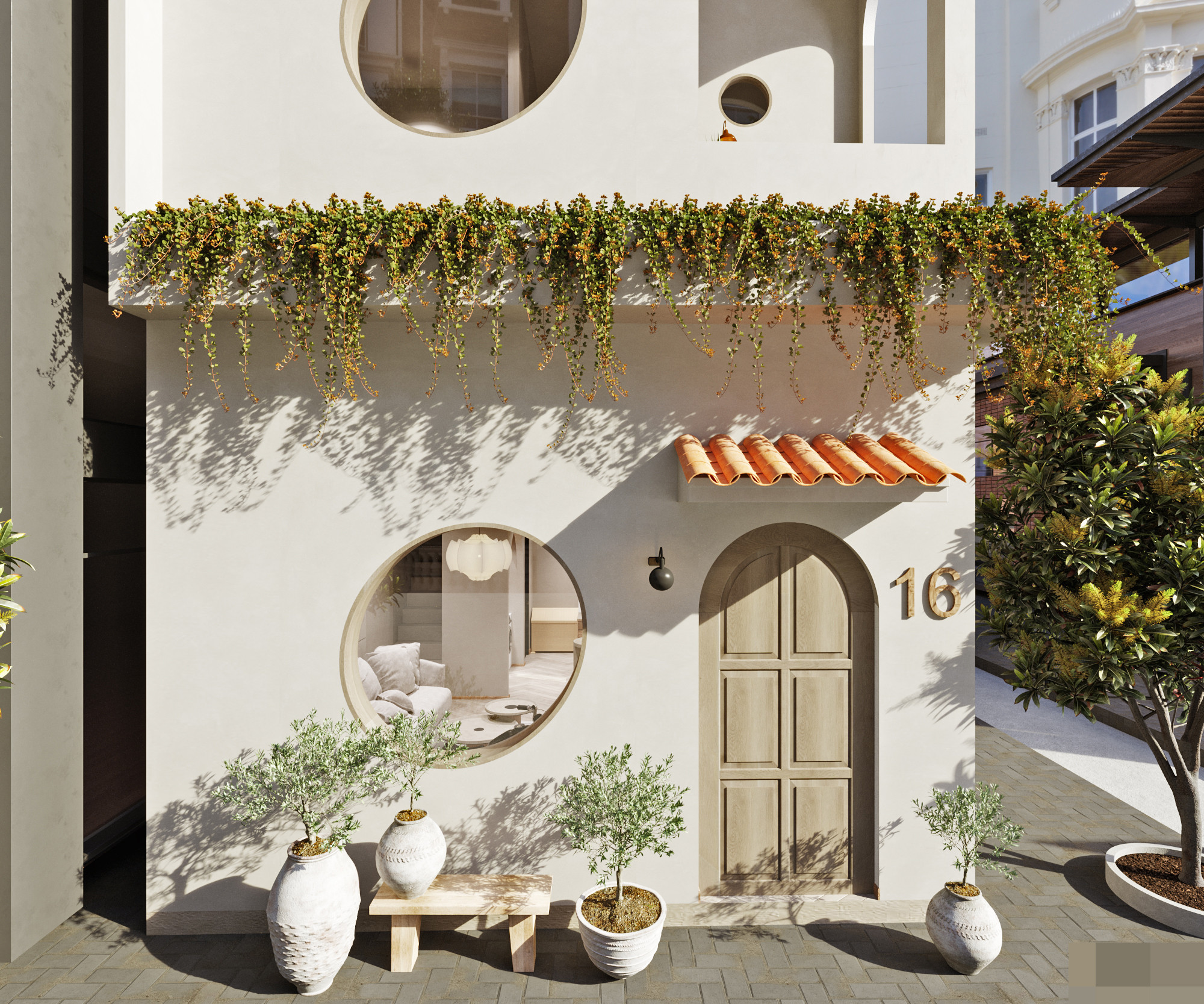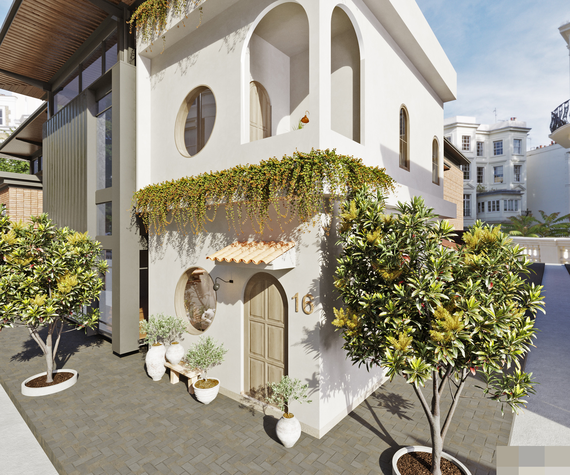 Mặt tiền xinh xinh, nổi bật trên khu phố với các khung cửa vòm và giàn cây leo xanh mướt.