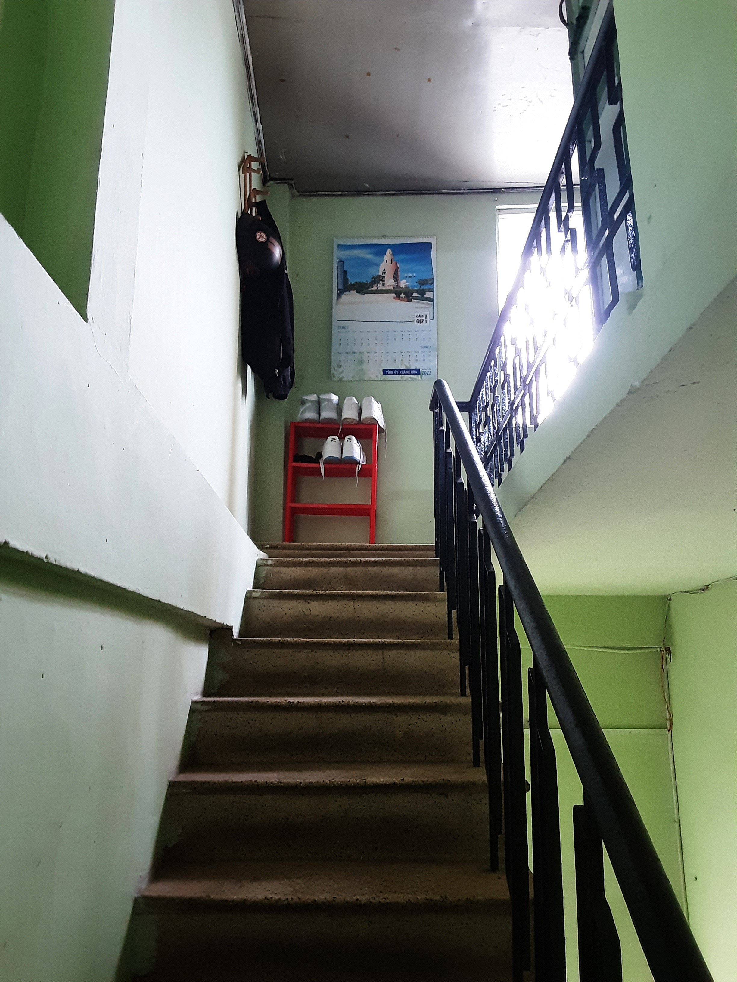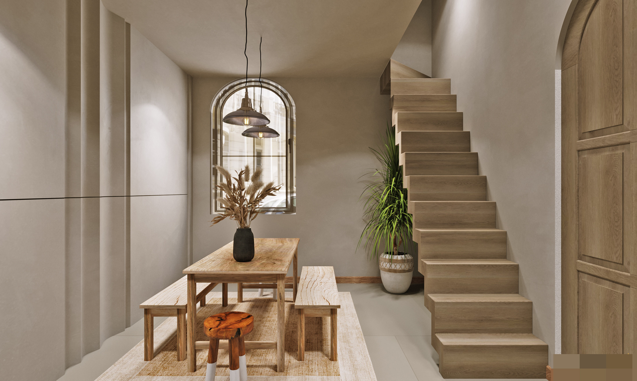 Cầu thang mới nhỏ gọn và độc đáo. Từ khu bàn ăn, có thể nhìn ra ngoài đường qua cửa vòm mềm mại.