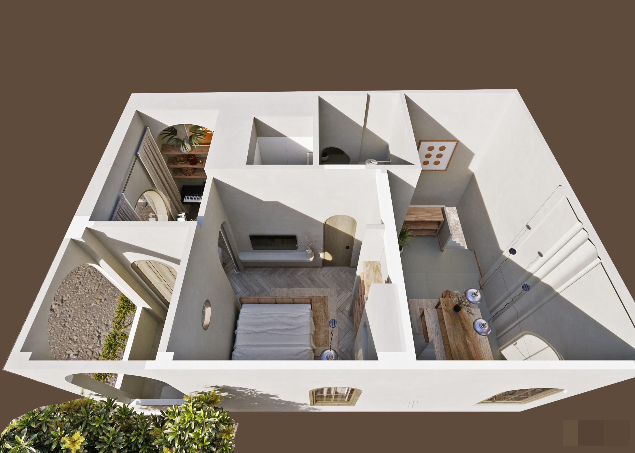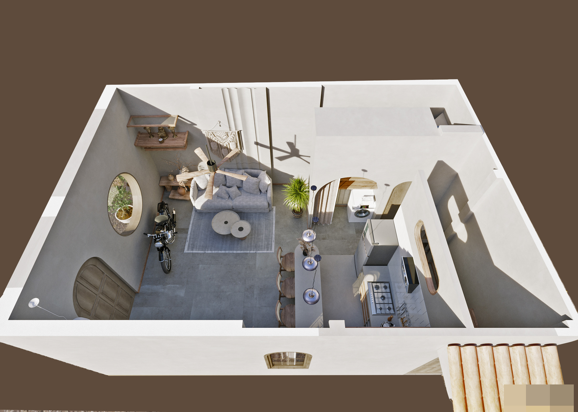 Phối cảnh bóc mái của công trình. Tổng thể nhà dùng màu sơn trắng sáng và nội thất màu gỗ.