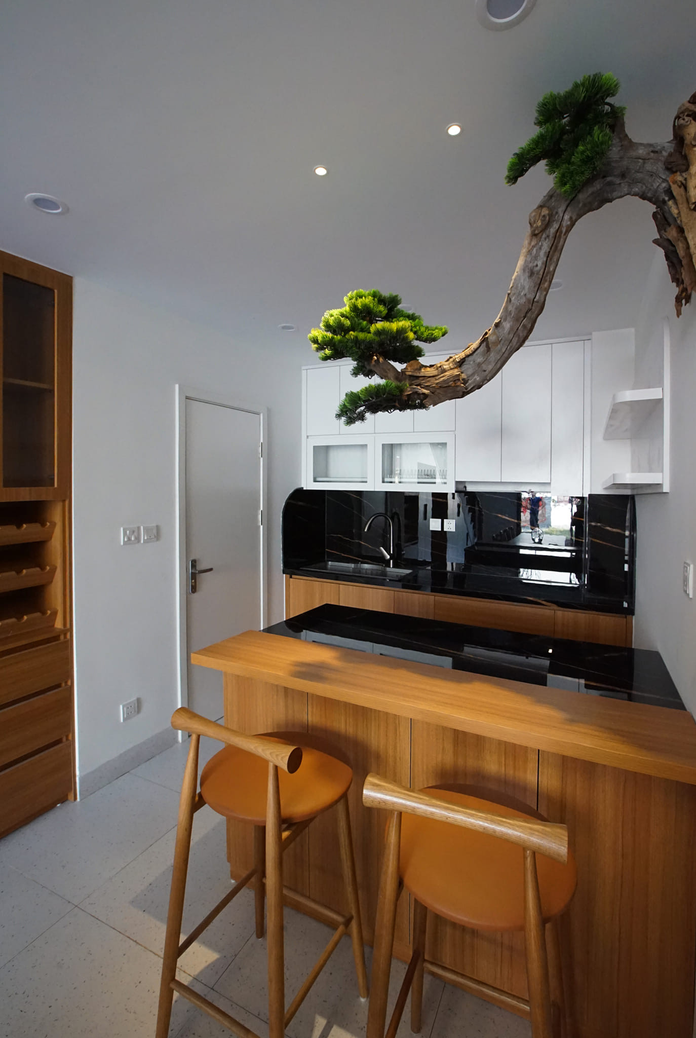Phòng sinh hoạt chung có tiểu cảnh sinh động, hút được gió từ giếng trời mát lịm.