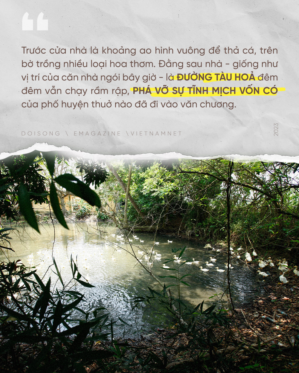 Trước cửa nhà là khoảng ao hình vuông để thả cá, trên bờ trồng nhiều loại hoa thơm. Đằng sau nhà - giống như vị trí của căn nhà ngói bây giờ - là đường tàu hoả đêm đêm vẫn chạy rầm rập, phá vỡ sự tĩnh mịch vốn có của phố huyện thuở nào đã đi vào văn chương.