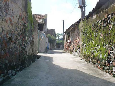 Ngõ dẫn vào nhà ông Tùng với hai bên tường rêu phong.