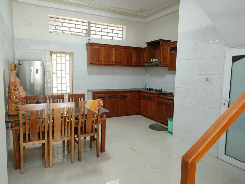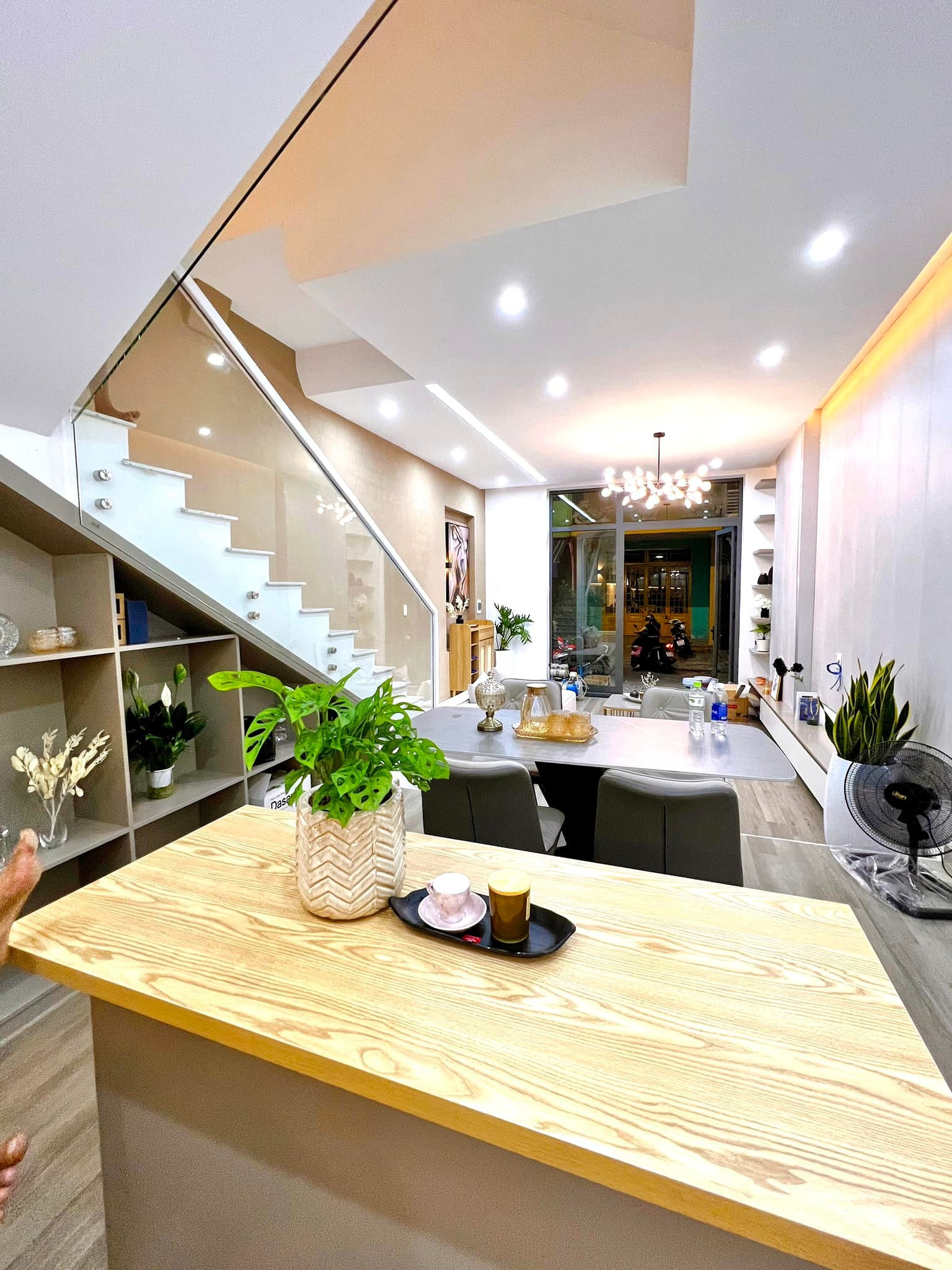 Bàn đảo rộng với mặt bằng gỗ đẹp mắt. Bàn ăn tiếp giáp bàn đảo và bếp, tạo sự tiện nghi khi nấu nướng cho gia chủ. Cây cảnh nhỏ giúp không gian sạch và thẩm mỹ hơn.