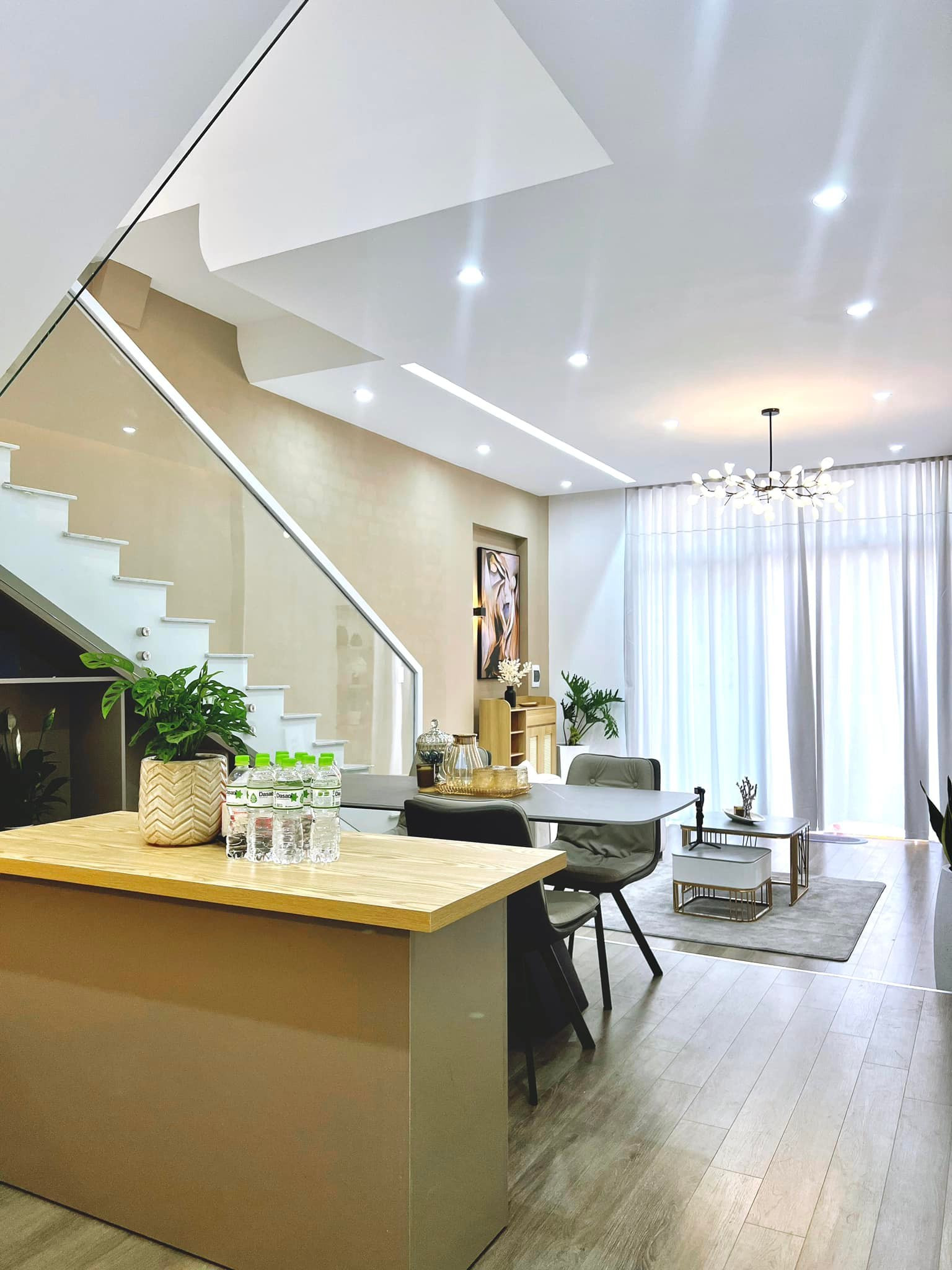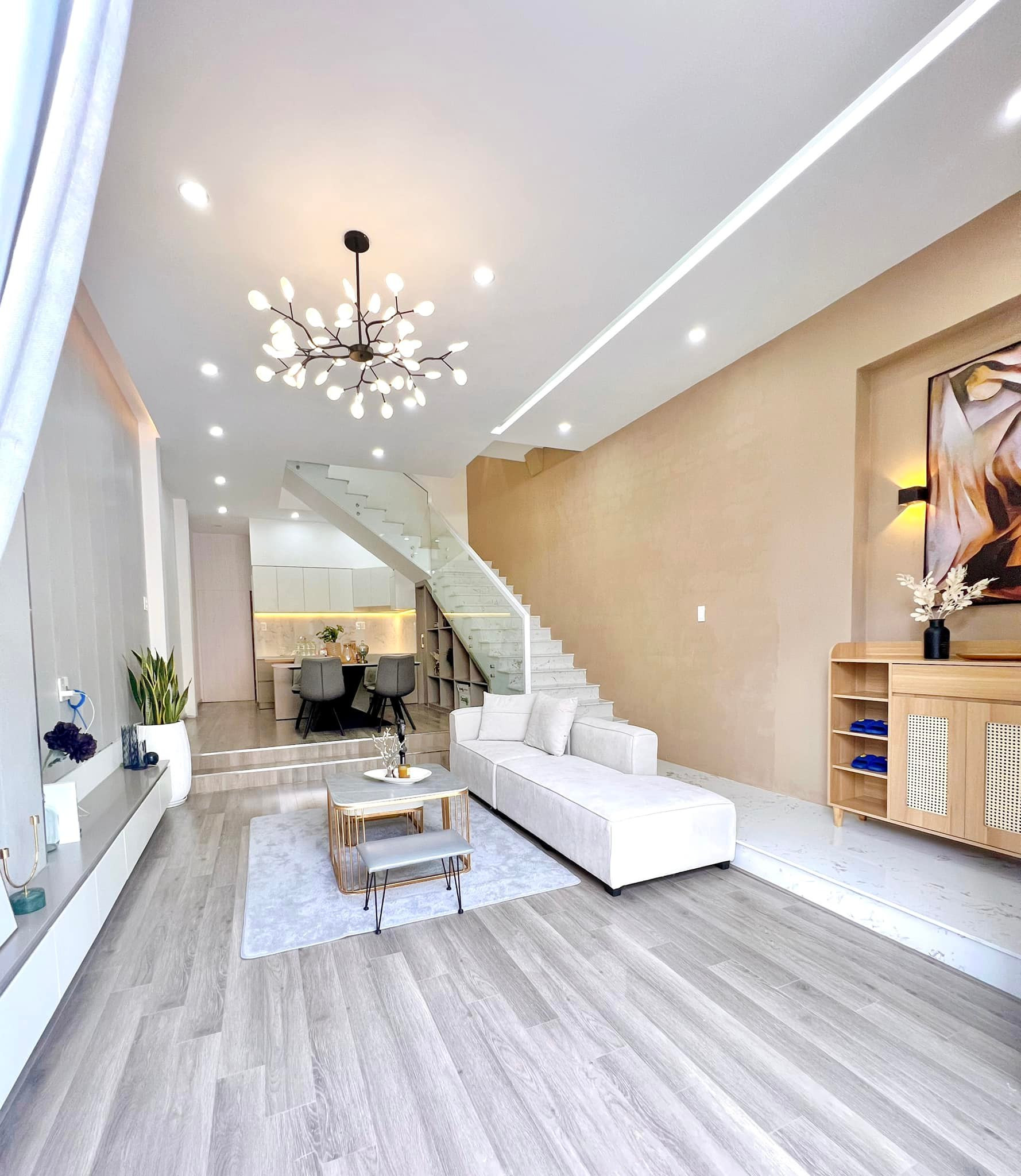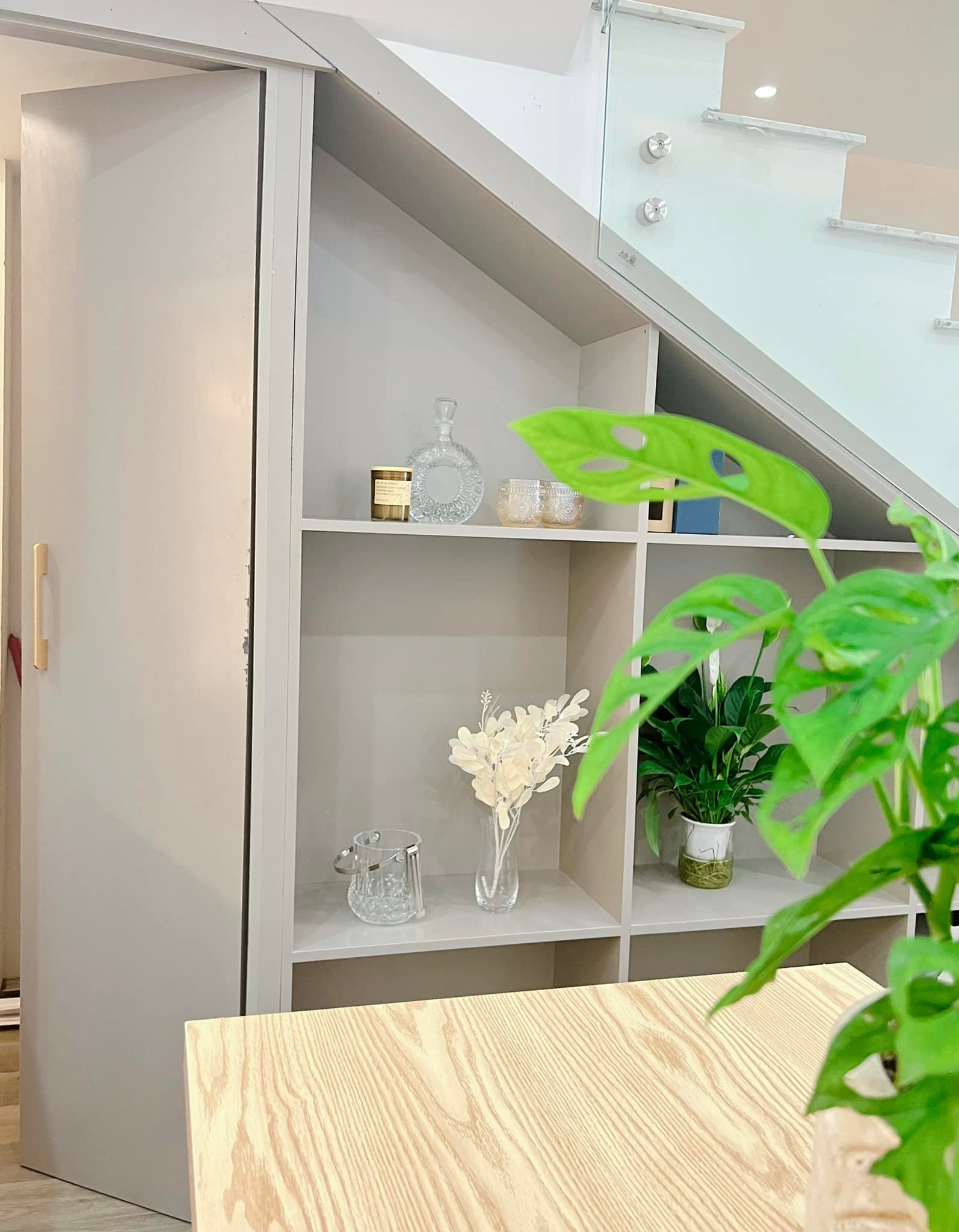 Anh Sony Trương thay đổi bố cục cầu thang, từ giữa nhà thành cầu thang góc giúp mở rộng không gian. Đồng thời bức vách ngăn phòng khách và bếp được bỏ đi, tạo thành sự liền mạch thoáng đãng.