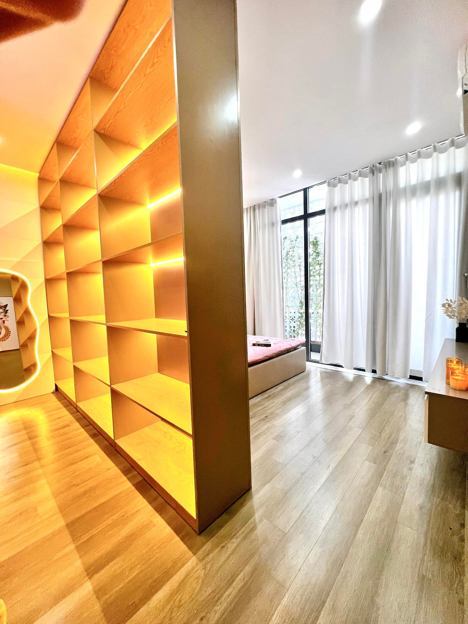 Mỗi công trình anh thực hiện đều mang một màu sắc riêng, tránh sự lặp lại, lối mòn. Ngôi nhà này cũng vậy. Với diện tích 59m2 , bề ngang 4m5 và nhịp cầu thang chia đôi ngôi nhà, tạo ra sự bức bí khó tả.