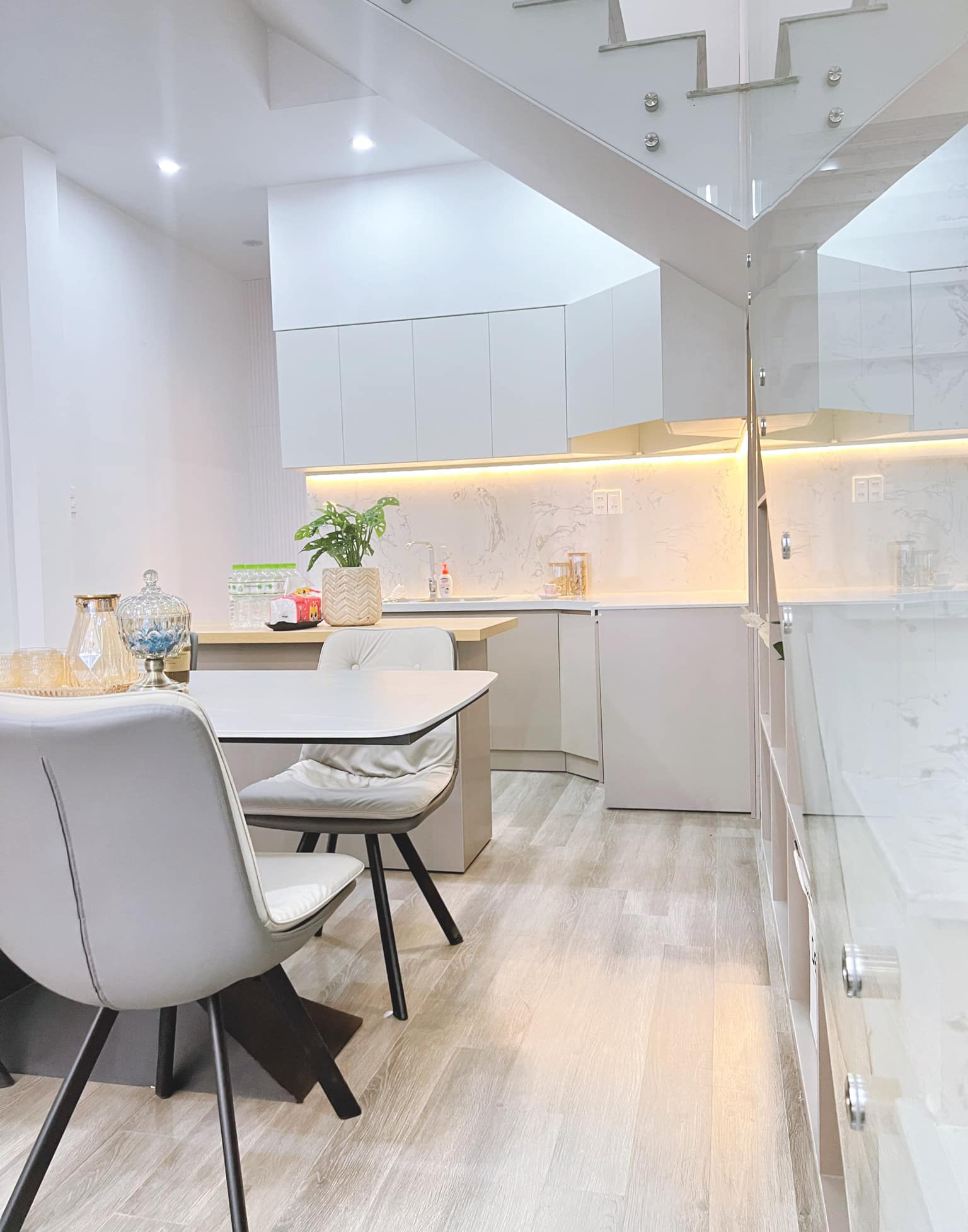 Bếp dùng màu trắng và ghi mang đến vẻ đẹp thanh lịch. Chi tiết decor bằng các chai, lọ, cốc thủy tinh rất cuốn hút.