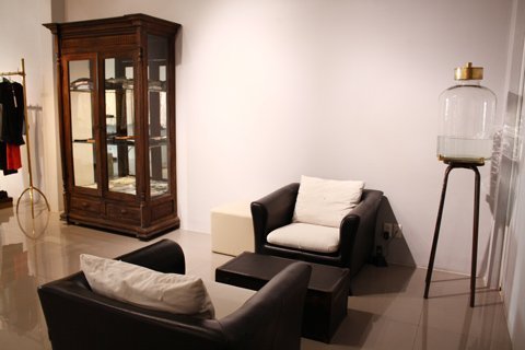 Bộ bàn ghế được đặt cạnh nơi trưng bày với phong cách giản dị. Đây là nơi dành cho những cuộc trao đổi về những ý tưởng giữa nhà thiết kế và người mẫu. Chiếc bình đựng nước cũng khá độc đáo và lạ mắt.