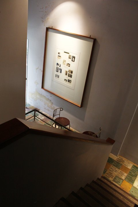 Một góc cầu thang lên tầng lại được đặt trong không gian hơi tối tách biệt hẳn với không gian sáng bên cạnh được treo những bức tranh mang tính hoài niệm.