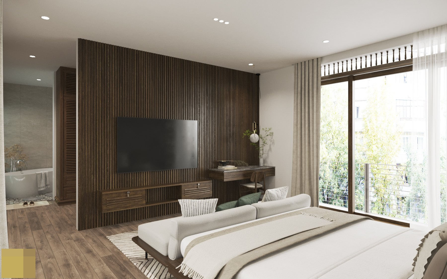 Phòng ngủ master bố trí hai cửa sổ hai bên, tạo ra sự luân chuyển ánh sáng, gió trời nhịp nhàng.