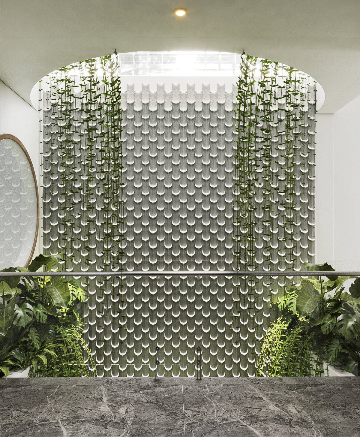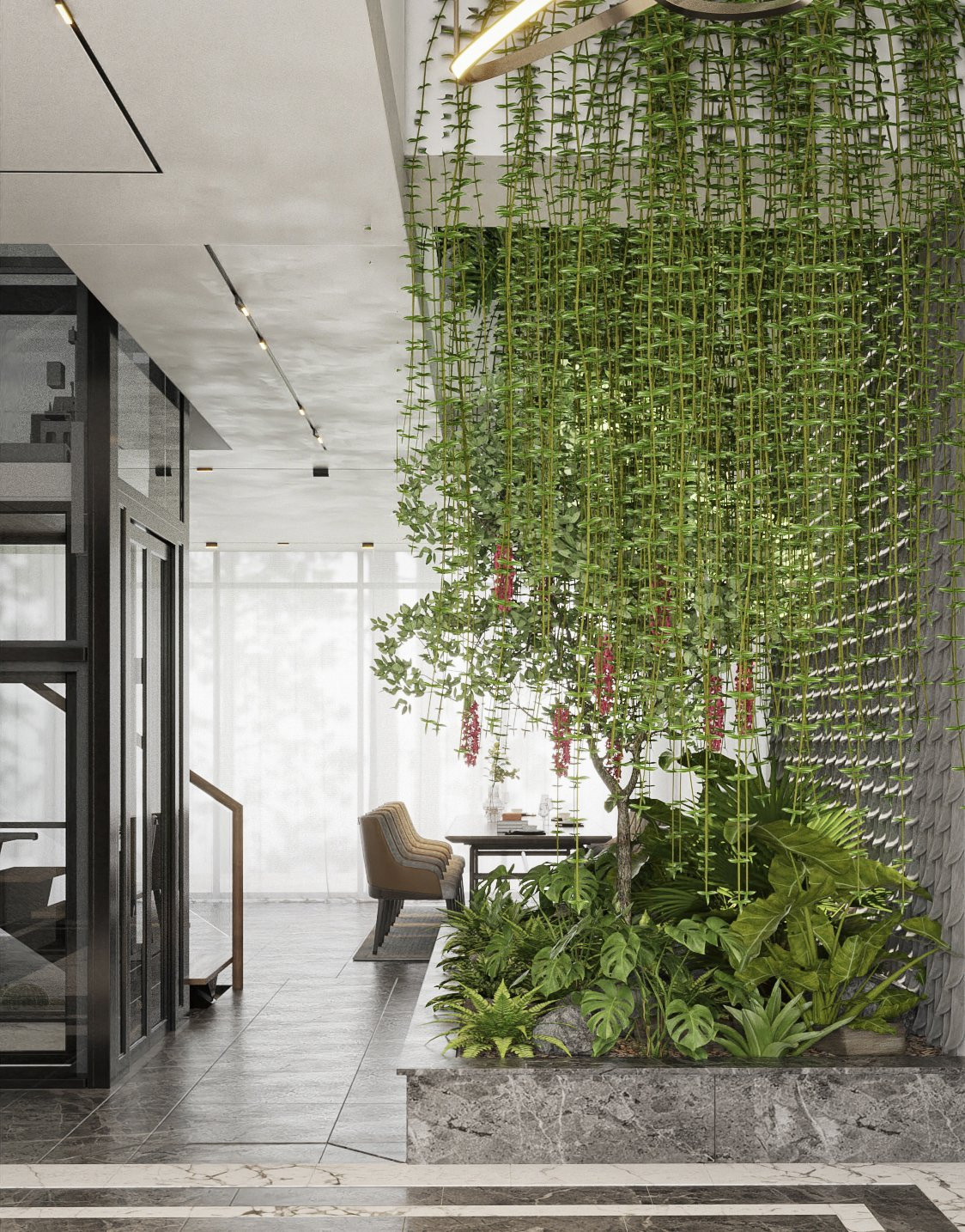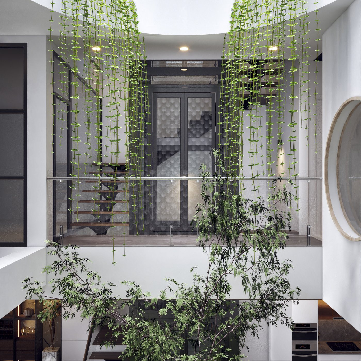 Dòng "thác" cây xanh đổ xuống từ giếng trời trong trẻo.