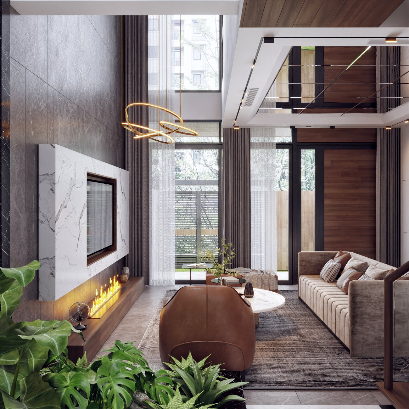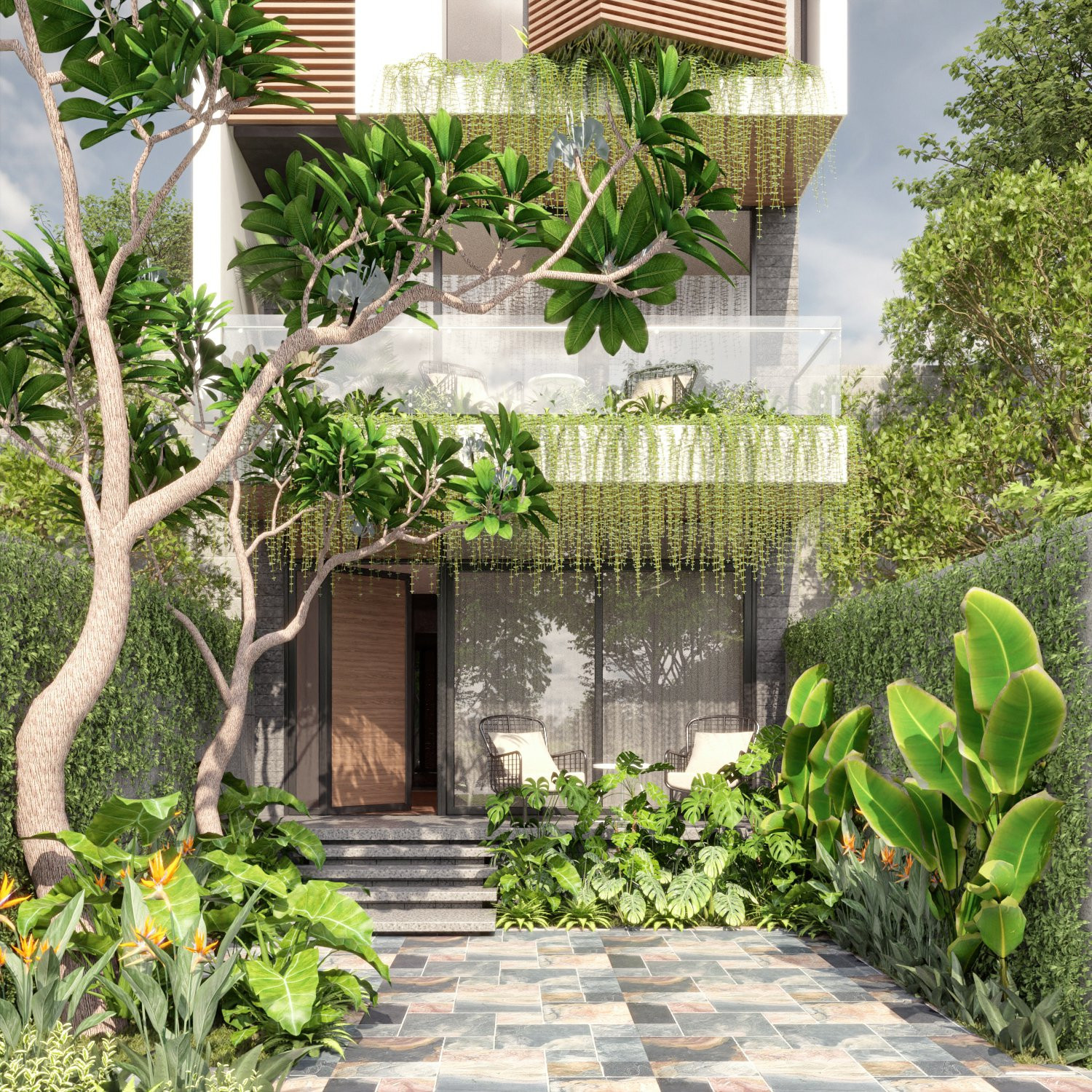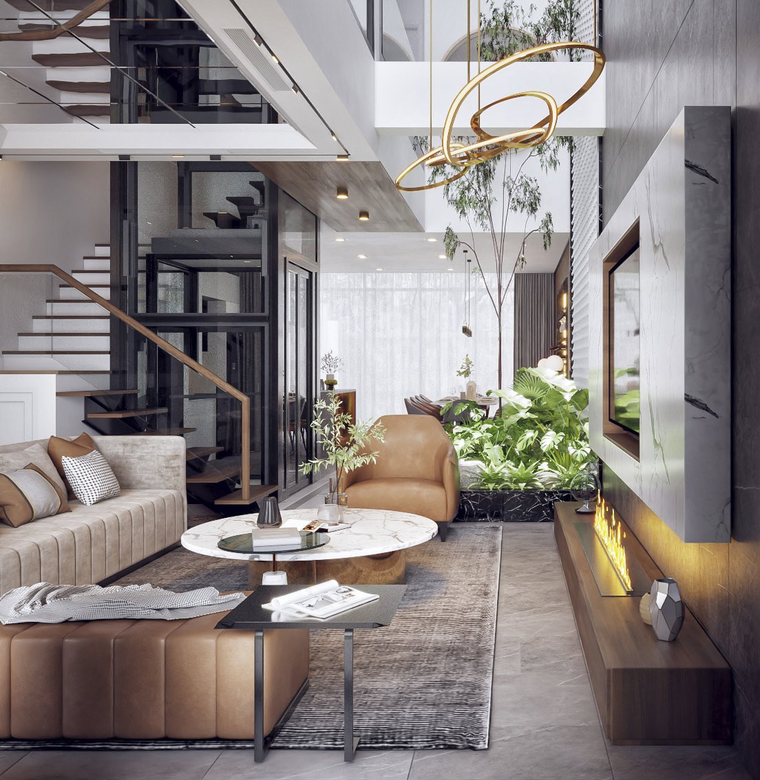 Dòng "thác" cây xanh đổ xuống từ giếng trời trong trẻo.