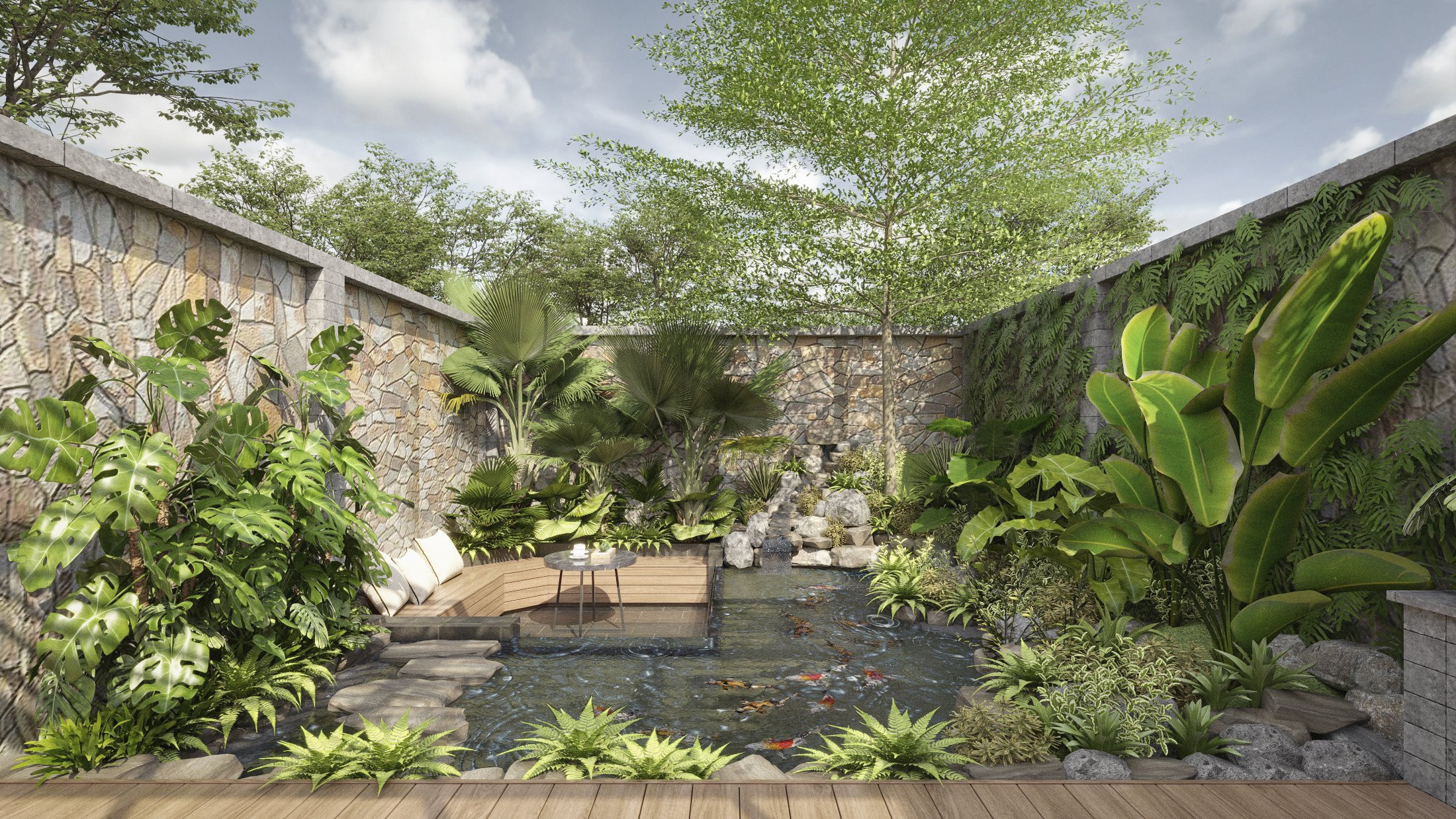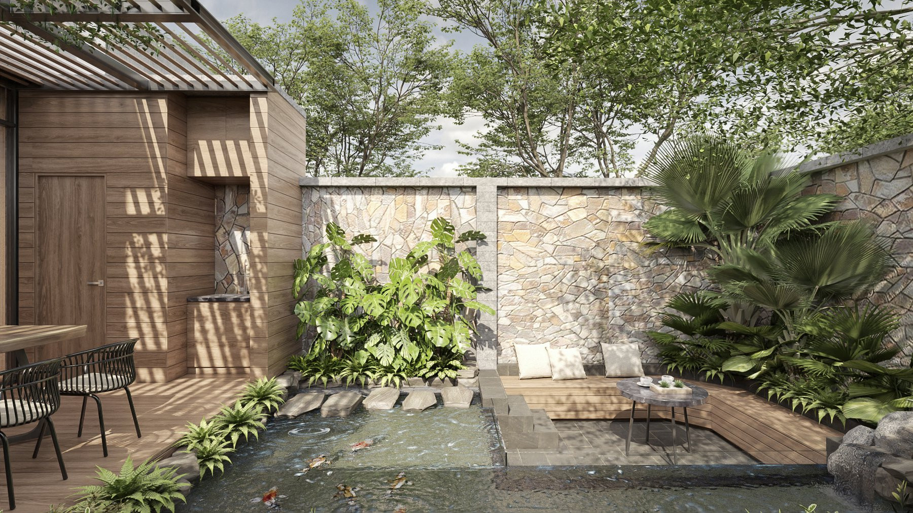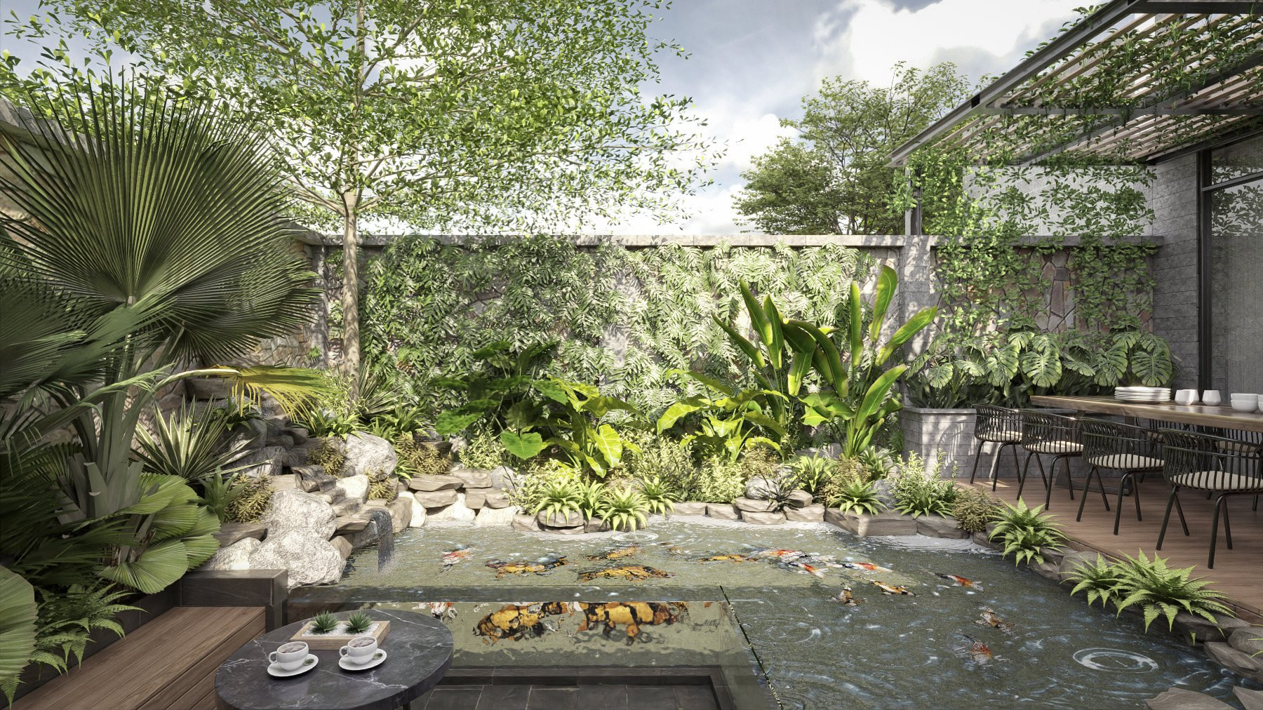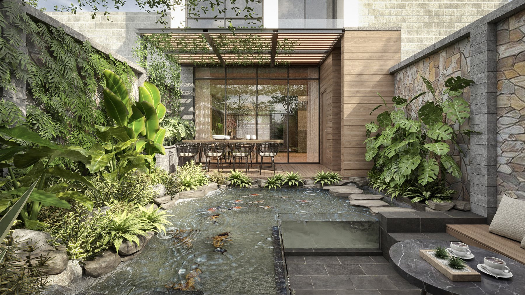 Sân vườn thư giãn, có hồ điều hòa, nuôi cá Koi và bàn trà nổi trên mặt nước độc đáo.