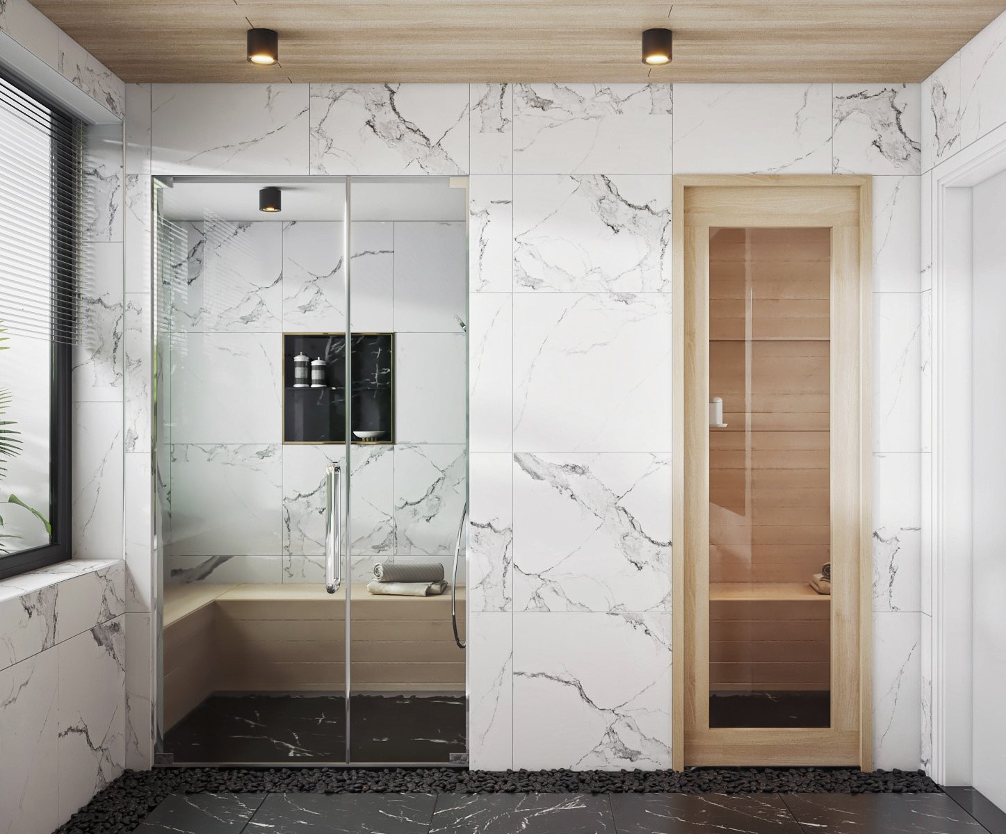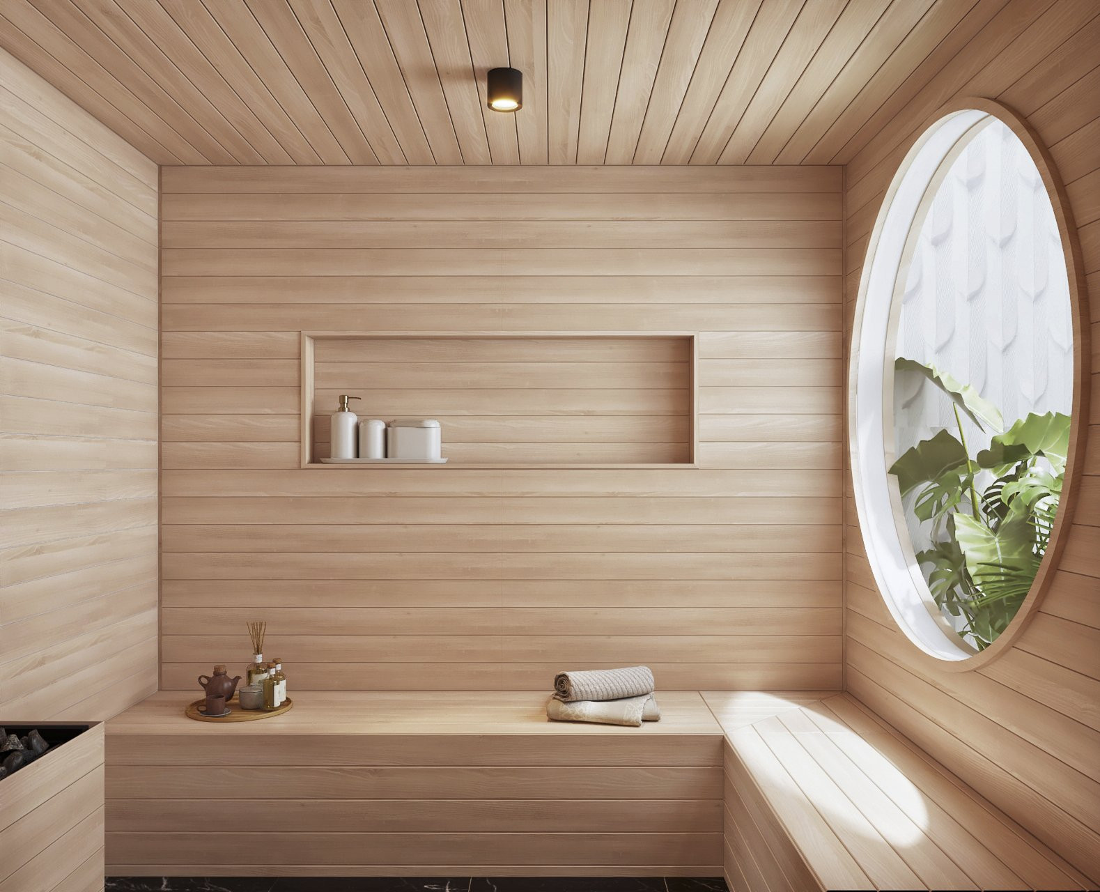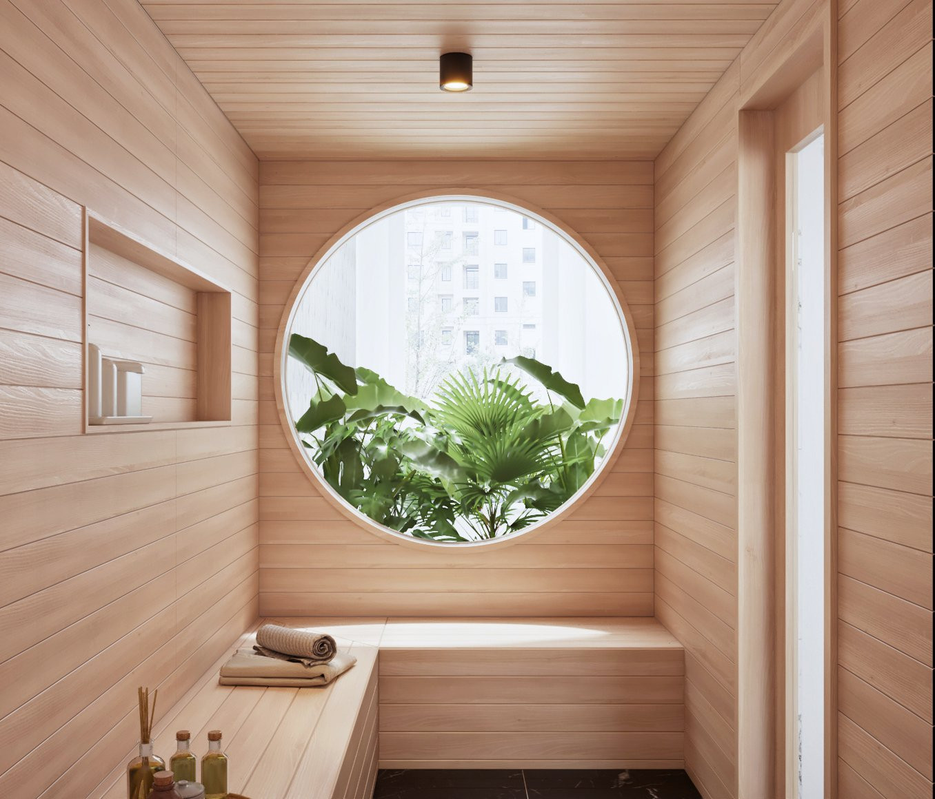 Phòng xông hơi cao cấp, ốp gỗ với khung cửa sổ tròn nhìn ra giếng trời thật chill. Cạnh phòng xông là phòng tắm hiện đại.