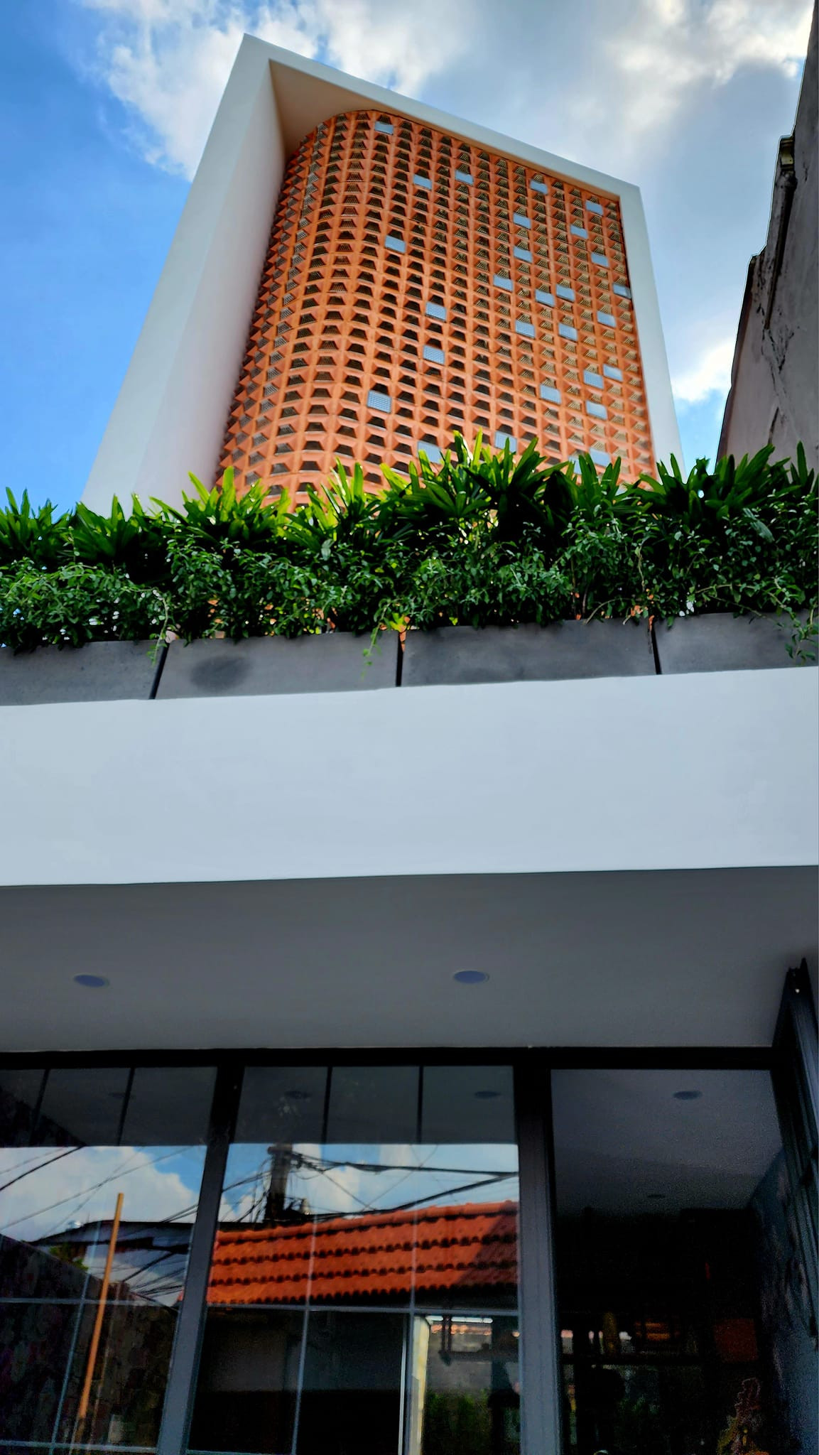 Ngôi nhà có nét nổi bật, khác lạ nằm ở kiến trúc mặt tiền. Mặt tiền gần như hoàn toàn là gạch nung thông gió (gạch bánh ú) được gia cố bởi khung xương thép. Kiểu dùng gạch thông gió khá phổ biến, nhưng ở đây, gia chủ dùng gạch này cho toàn bộ mặt tiền từ trên xuống, lại có cách điệu uốn cong, điểm thêm gạch thủy tinh lấy sáng. Loại gạch này giúp lưu thông không khí, cách nhiệt tốt, lại chắn mưa. Kiểu dáng gạch đơn giản, mộc mạc, giản dị. Màu đỏ gạch nung cũng là màu phong thủy của gia chủ. Một chi tiết trong quá trình làm nhà, gây khó khăn khi thực hiện, tuy nhỏ nhưng nếu không giải quyết được, gia chủ sẽ phải hủy luôn ý tưởng này, đó là gạch bánh ú có lỗ thông gió rất lớn bên dưới. Bên cạnh ưu điểm, nhược điểm là côn trùng, bụi dễ bay vào. Để khắc phục, ban đầu anh định làm lưới chống muỗi bên trong nhưng như vậy sẽ mất thẩm mỹ. Anh nghĩ ra ý tưởng là sẽ làm một miếng inox đục lỗ bịt bên dưới để vừa không mất đi ưu điểm nhưng vẫn giải quyết được vấn đề. Gia chủ đi một số nơi, đặt người ta gia công nhưng họ từ chối hoặc đòi chi phí cao vì họ phải làm khuôn mới, mà làm xong thì cũng không sử dụng, trong khi số lượng anh cần thì cũng không quá nhiều. Lúc này, anh tưởng chừng phải thay đổi phương án, định chuyển sang gạch kính lấy sáng thay thế và chỉ xen kẽ gạch thông gió. Giữa lúc chán nản, anh tìm trên mạng thấy có nơi bán miếng bịt inox ở Phan Thiết, liền liên hệ và đặt ship về TP.HCM với chi phí 6 triệu đồng. Khi mang về lắp vào thì có viên khớp đẹp, viên thì hở vênh vì gạch bánh ú này làm thủ công nên không phải viên nào cũng đều như nhau. Gia chủ cho lắp thử, nếu mưa lớn tạt thẳng trực diện nước vẫn có thể chảy theo kẽ miếng inox vào, hoặc viên nào lỏng lẻo quá gió thổi dễ bị rơi ra. Giải pháp đưa ra là dán silicon viền mép để cố định miếng inox và hiệu quả gần như 99%. Nhà anh hạn chế được muỗi/côn trùng bay vào dù cả mặt tiền đều rất thông thoáng.Cửa cuốn vân gỗ, thời điểm anh lắp chưa nhiều người dùng vì còn khá mới ở Việt Nam. Đây là loại cửa cuốn công nghệ mới của Nhật, bản to, màu sắc đẹp, khá chắc chắn.