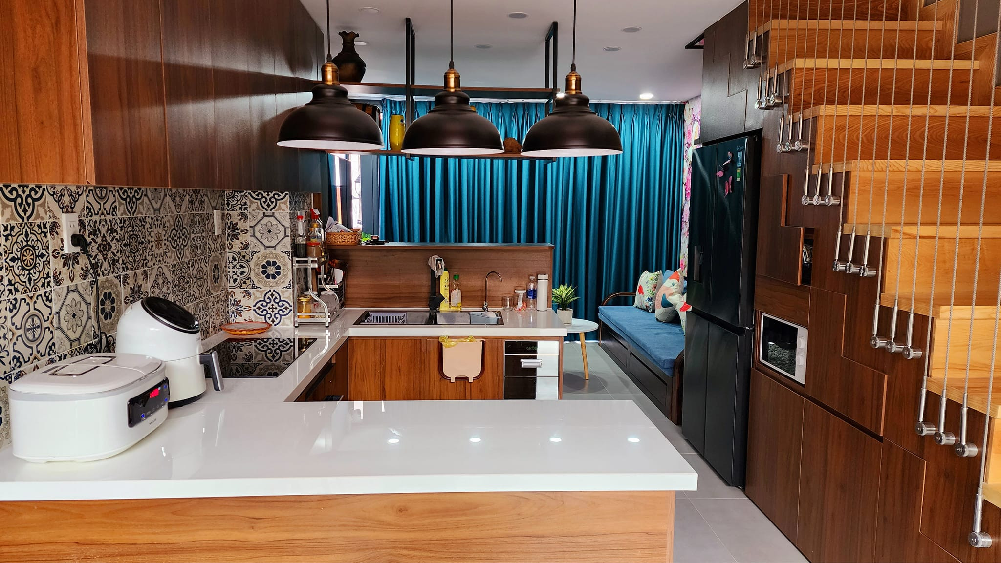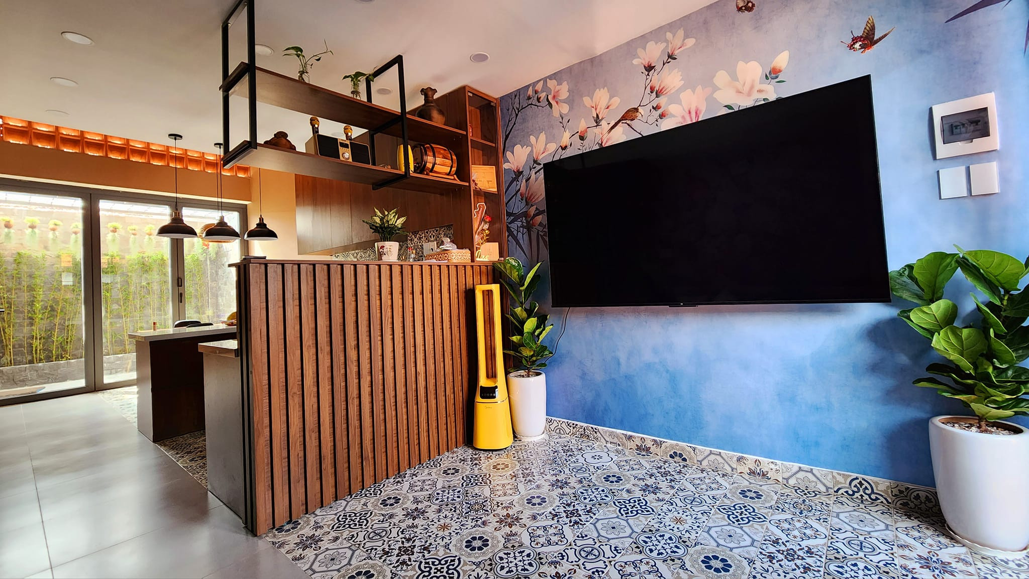 Vườn sau nhà nhìn từ bàn đảo và bàn ăn. Một bụi trúc Nhật xanh mướt, mang hàm ý phúc - lộc dồi dào.