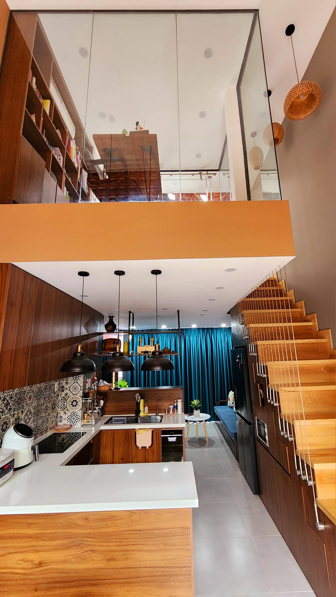 Cầu thang với gầm được tận dụng làm các hộc tủ tiện lợi, gọn gàng. Phía trên tầng lửng là bàn làm việc với tường kính trong suốt nhìn ra mảng tường gạch bánh ú.