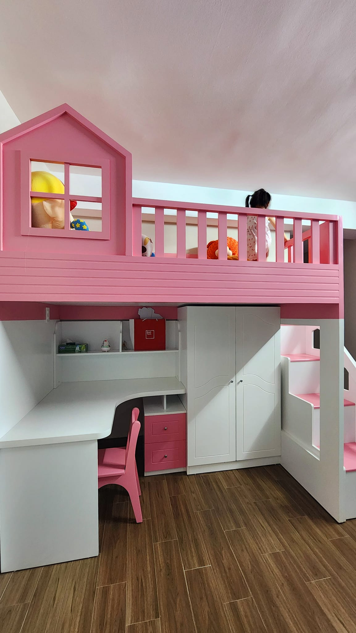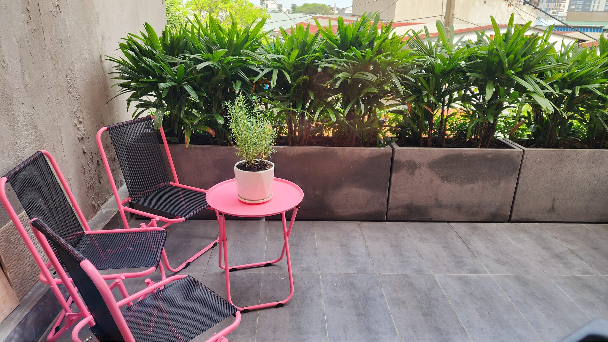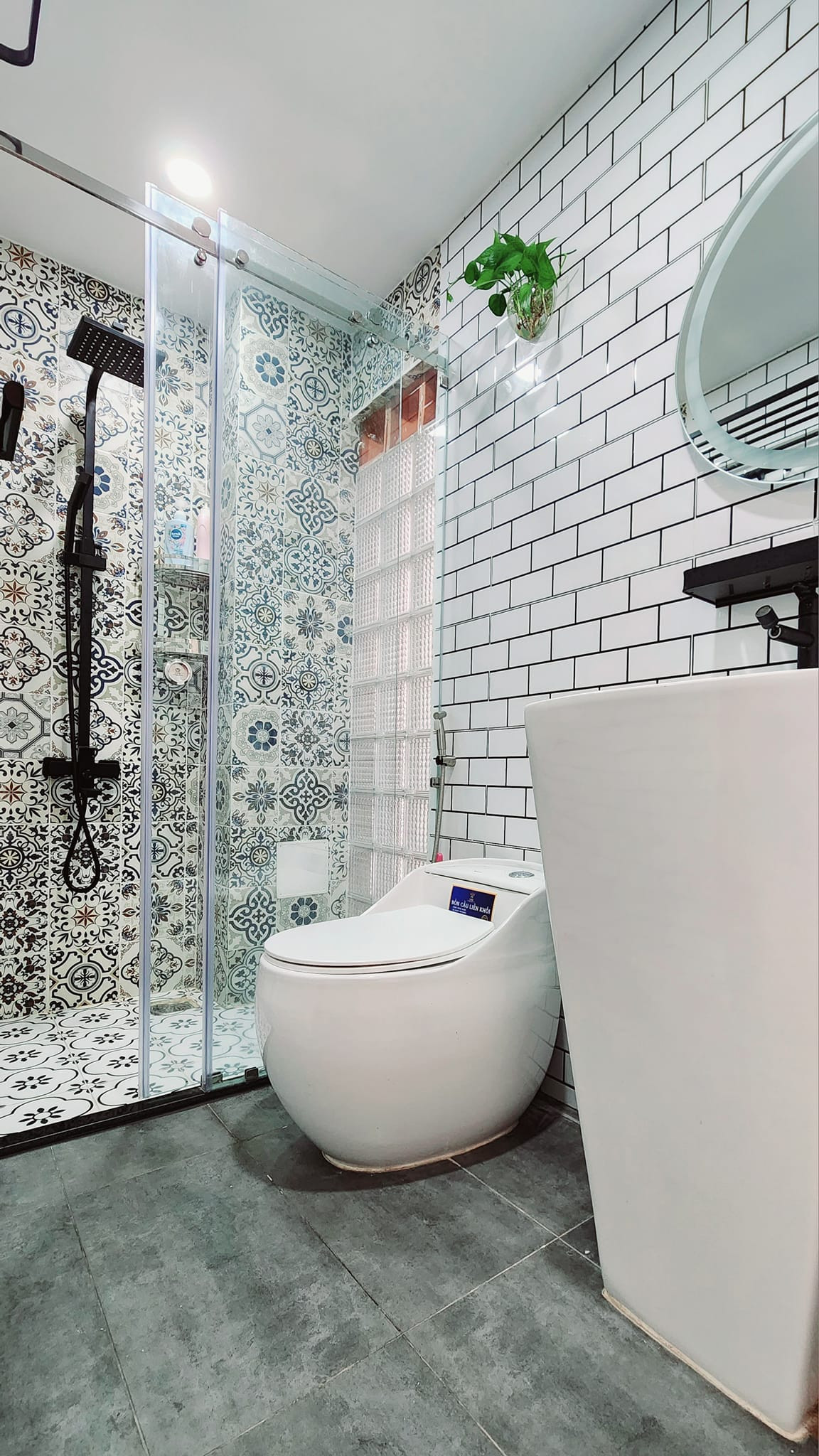Phòng ngủ cho con gái với gam hồng đáng yêu. Phòng vệ sinh được dùng gạch kính lấy sáng, giảm lượng tiêu thụ điện năng vào ban ngày, sàn lát gạch giả bê tông, hài hòa với bức tường gạch thông gió mộc mạc. Diện tích nhà tuy khiêm tốn nhưng gia chủ vẫn cố gắng tạo một góc chill ở ban công với nhiều cây xanh cho cả gia đình.