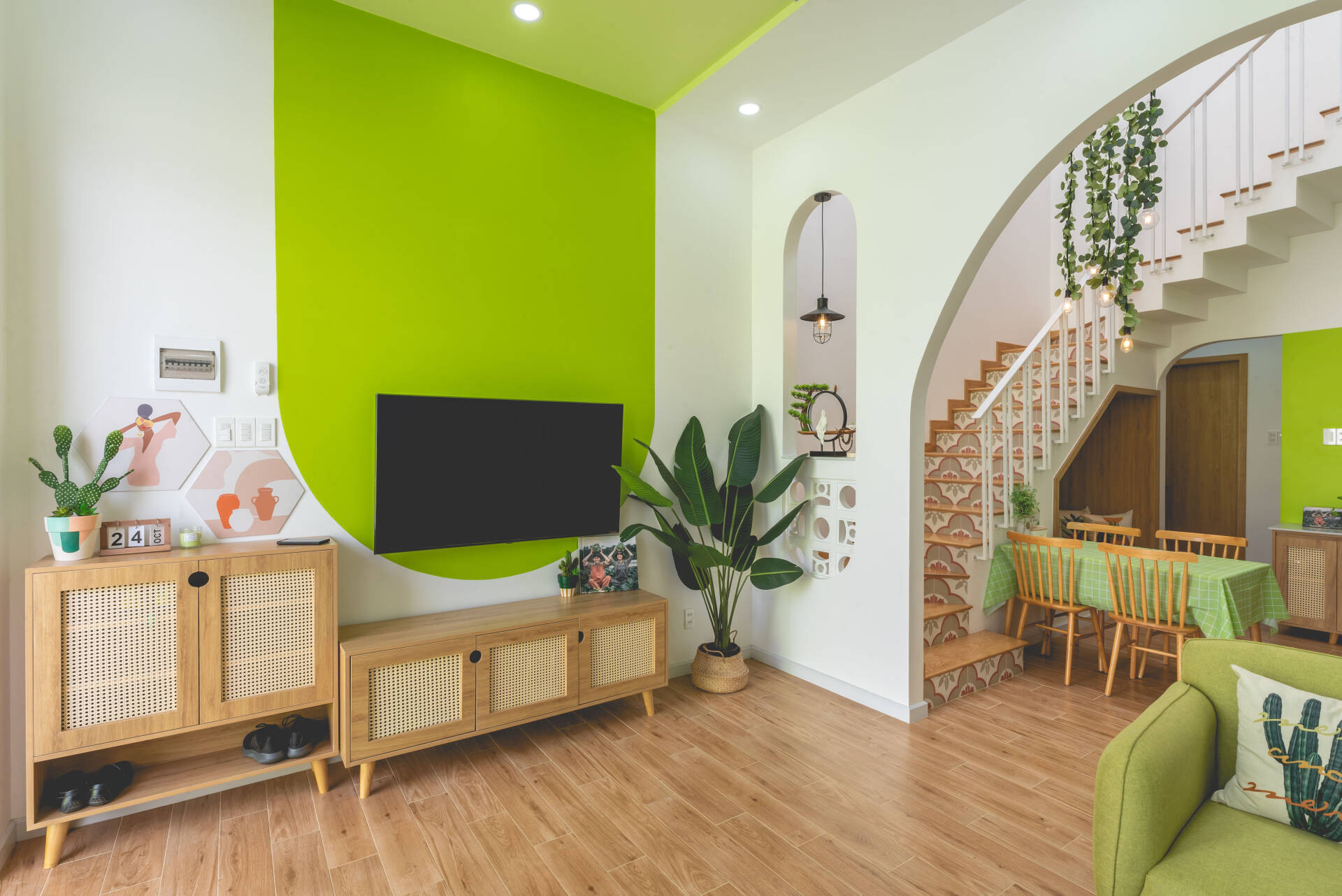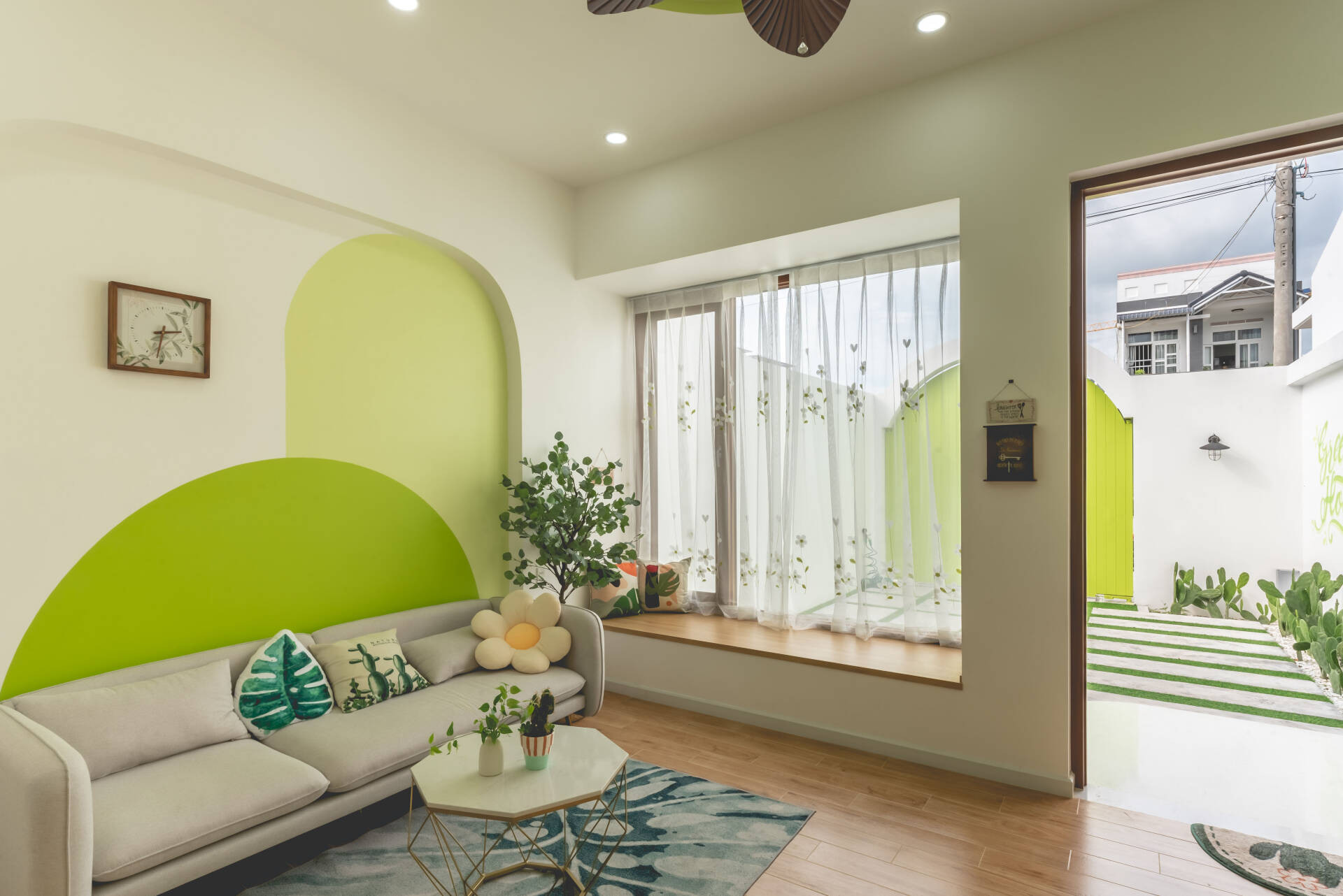 Phòng khách mở rộng với điểm nhấn chính là khu vực tường được sơn xanh tạo vòm cong mềm mại.