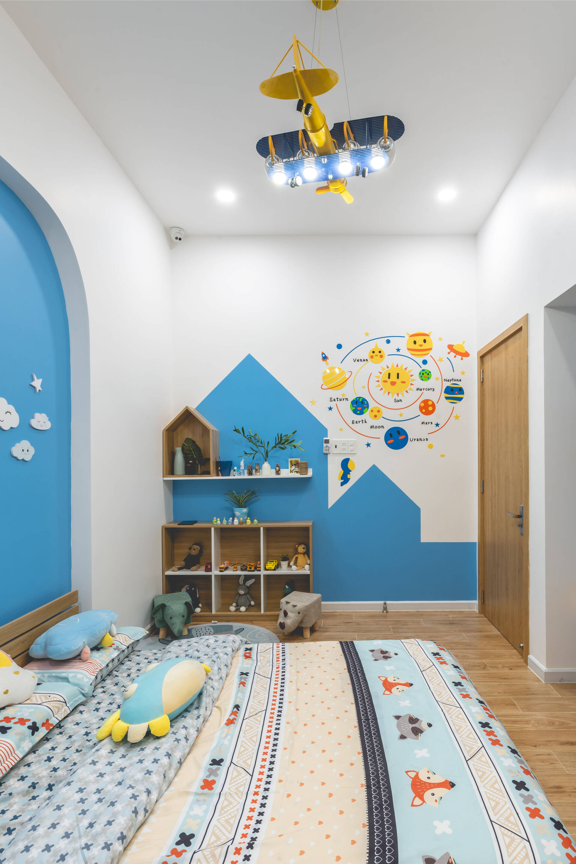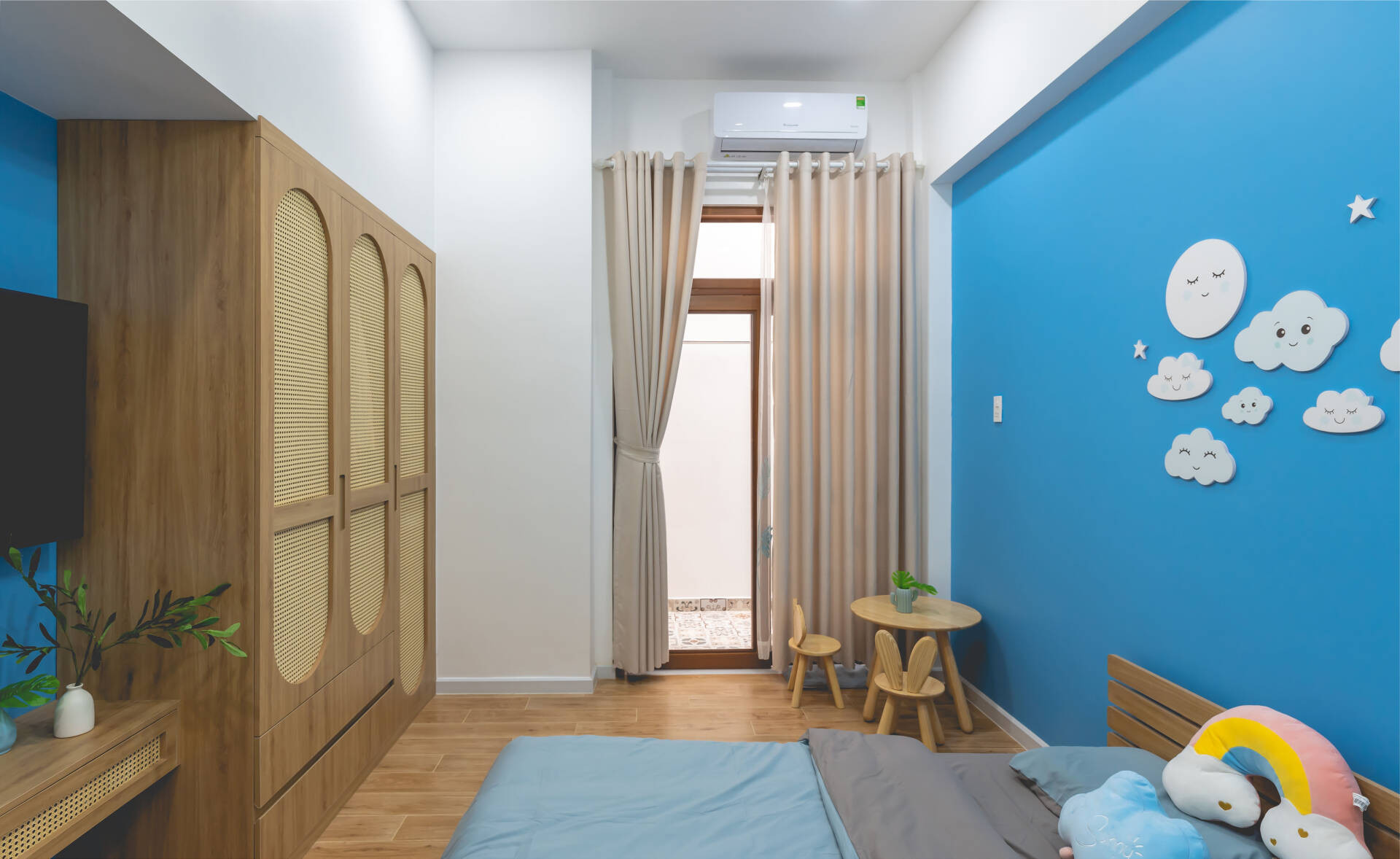 Phòng ngủ nhỏ dành cho bé trai của gia chủ nằm ở tầng 1 với gam màu chủ đạo là xanh dương, có cửa lùa ra sân sau nhằm khai thác ánh sáng tự nhiên.