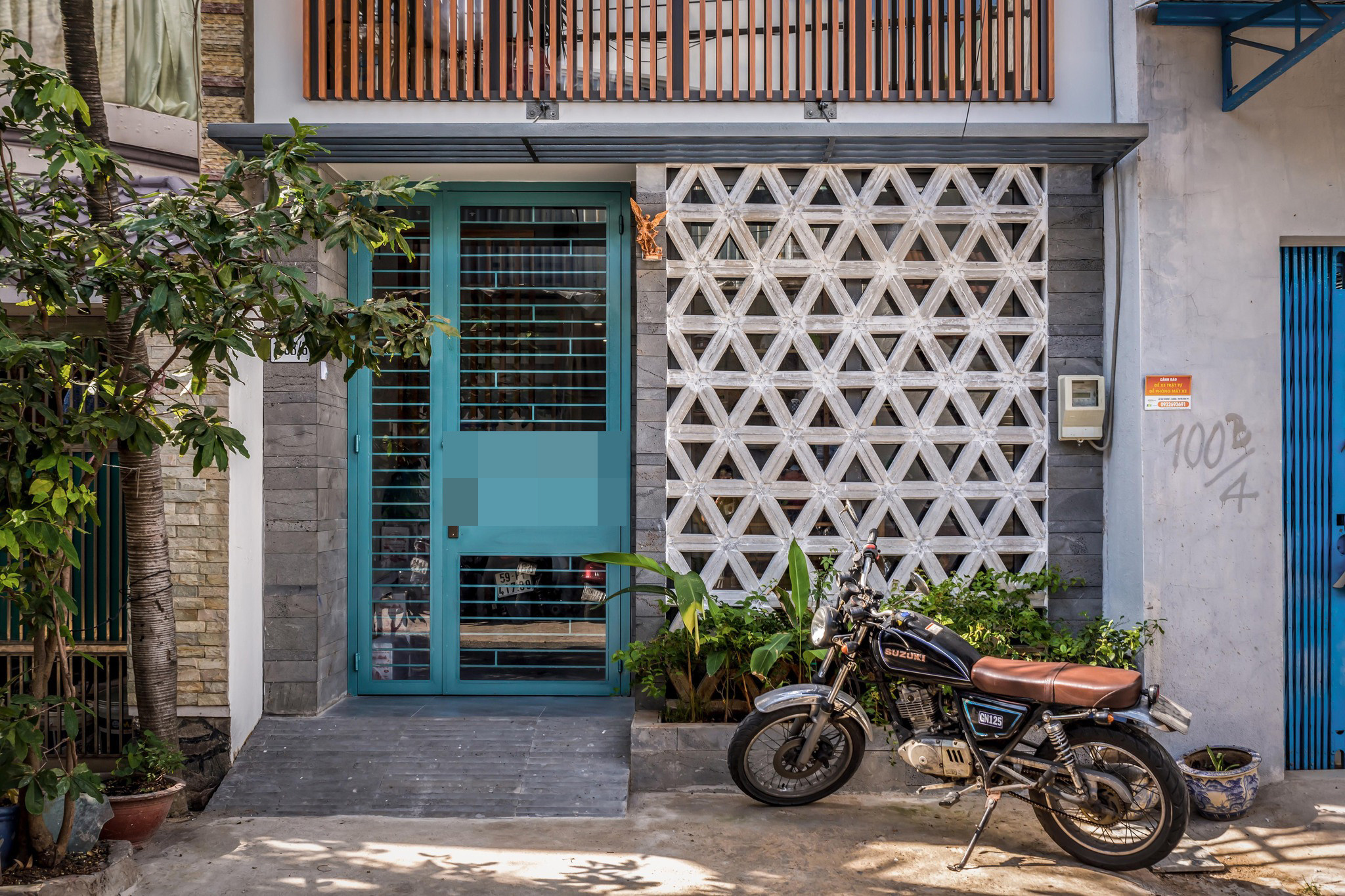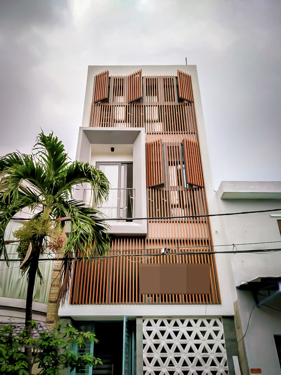 Mặt tiền nhà phố sử dụng hệ lam gỗ cản nắng, bụi mà vẫn hút gió, lấy sáng cho không gian nhà. Giải pháp này còn đảm bảo an toàn cho gia đình có trẻ nhỏ khi chơi đùa ở khu vực ban công. Ở tầng 1, kiến trúc sư dùng gạch bông gió tạo điểm nhấn, làm tường cho sân cổng.