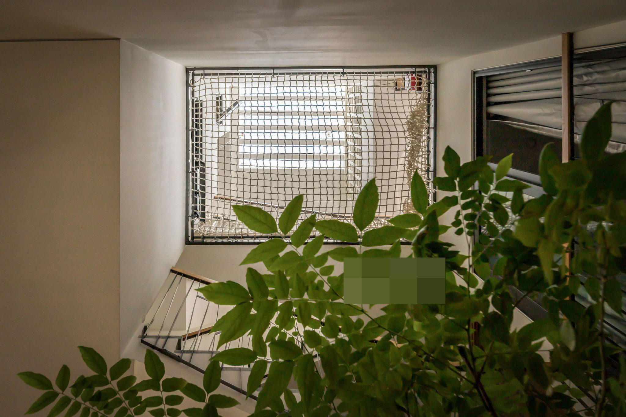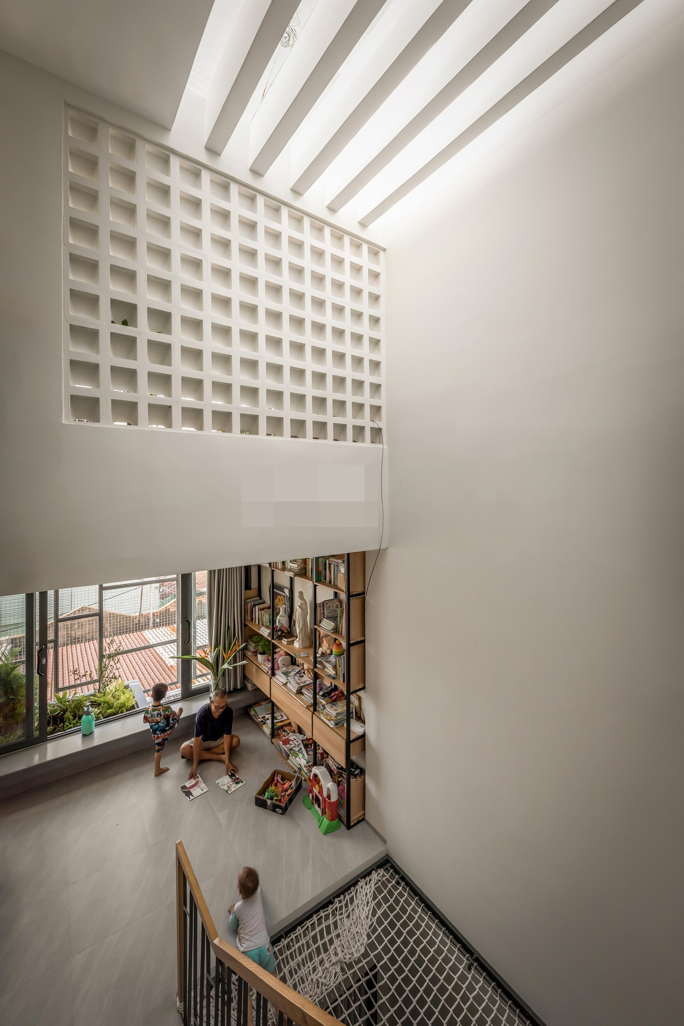 Các phòng ngủ được bố trí lệch nhau theo cấu trúc nhà. Ở giữa (tầng 3) là khu học tập, vui chơi và sinh hoạt gia đình. Kiến trúc sư đặt 1 tấm lưới rộng ngay chỗ thông tầng để nằm đọc sách, ngắm trời mây và những đêm trăng sáng.