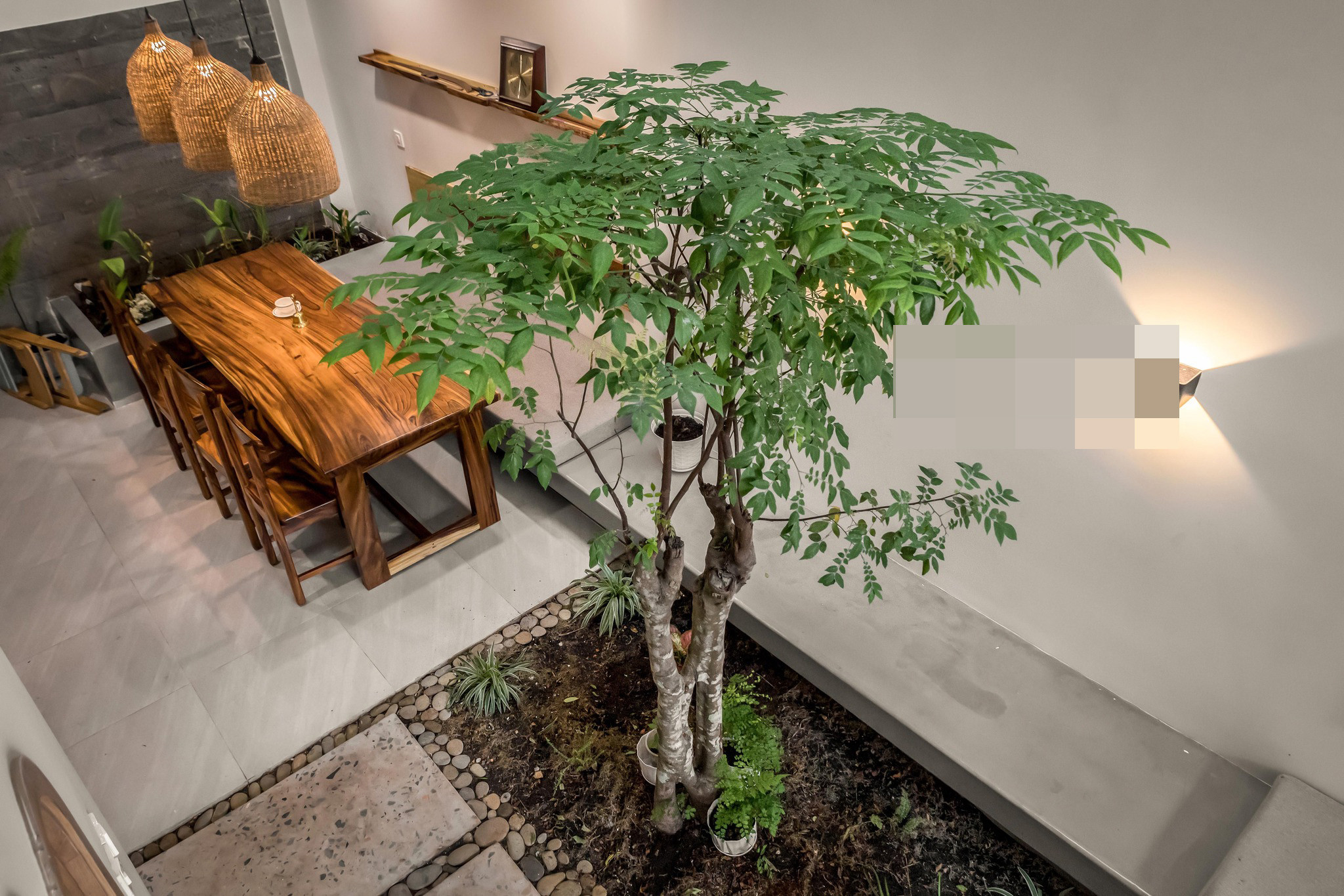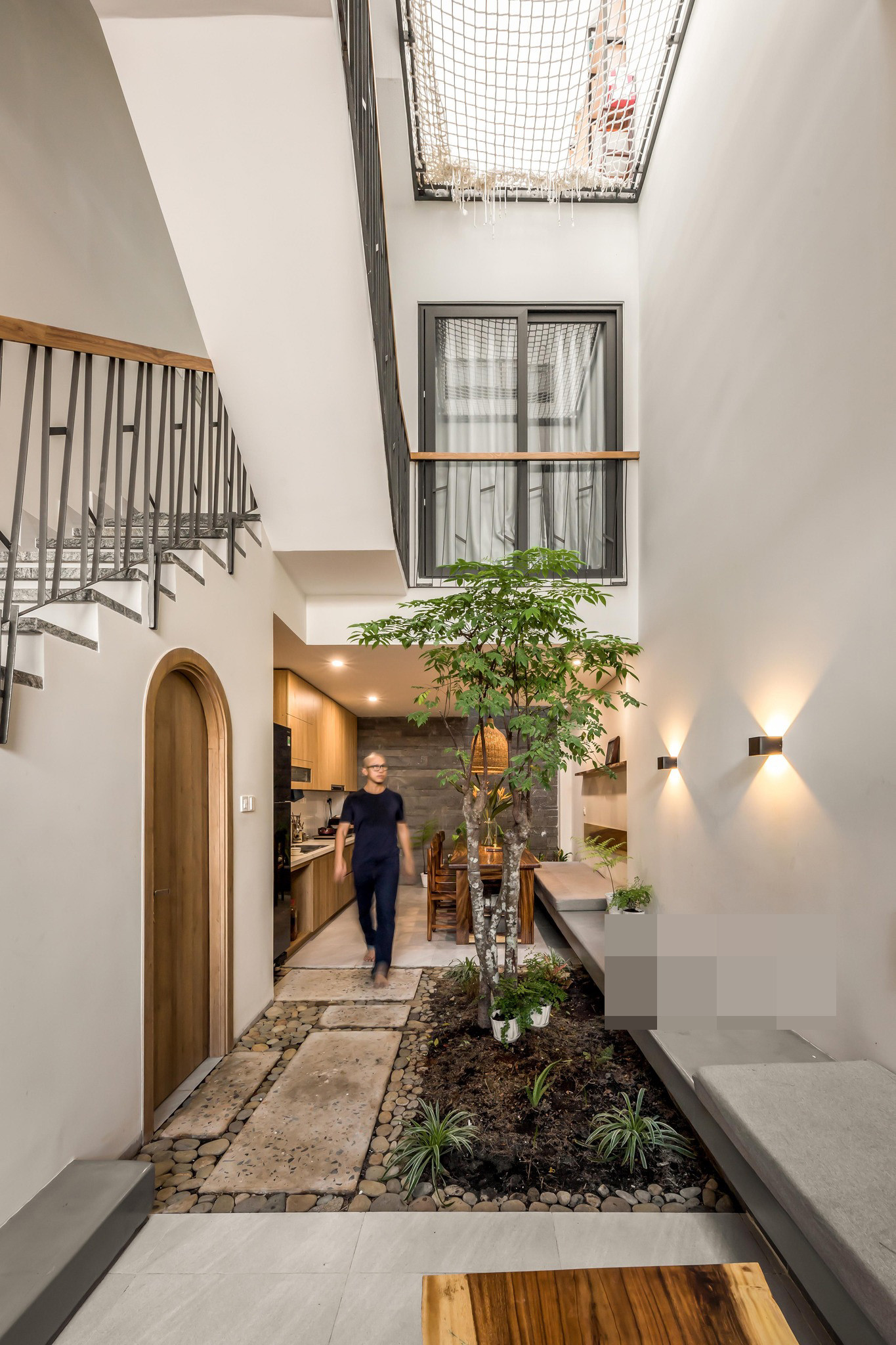 Cổng sắt màu xanh là sự kết nối giữa cũ và mới, nổi bật trên nền trắng của gạch bông gió hình tam giác. Thiên nhiên, cây cỏ và nắng gió ngập tràn trong phòng khách nhờ giếng trời ngăn cách khu vực khách và bếp. Phòng khách dùng hệ văng dài ốp tường và chiếc bàn bằng gỗ nhập khẩu nguyên khối, đầy mộc mạc. Cửa sổ từ các phòng hướng ra giếng trời nên ánh sáng được phân bổ rất đều, gió lưu thông mát lộng. Khu bếp nhỏ xinh nhưng có thể phục vụ được bữa cơm cho 10 người nhờ bàn ăn lớn và ghế dài. Ghế sofa phòng khách và ghế dài ở bàn ăn phòng bếp thực chất là tấm bế-tông lớn chạy dài, đặt đệm lên trên, rất độc đáo và bền vững. Phía sau ốp mảng gỗ trang trí, tượng trưng cho phần tựa lưng. Giếng trời thông suốt, luân chuyển khí tươi đều đặn. Tấm lưới như chiếc võng, chắc chắn, cho trẻ nhỏ chơi đùa. Đây cũng là khu vực sinh hoạt chung, đọc sách của cả gia đình. Nhà có sự kết nối xuyên suốt giữa các không gian, hạn chế nội thất, đề cao cuộc sống tối giản, gọn gàng. Mặc dù sống ở xứ nóng nhưng quanh năm nhà luôn mát mẻ, ít khi phải dùng đến máy lạnh.