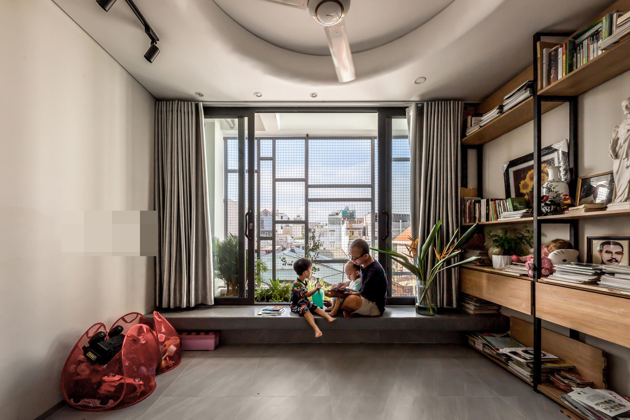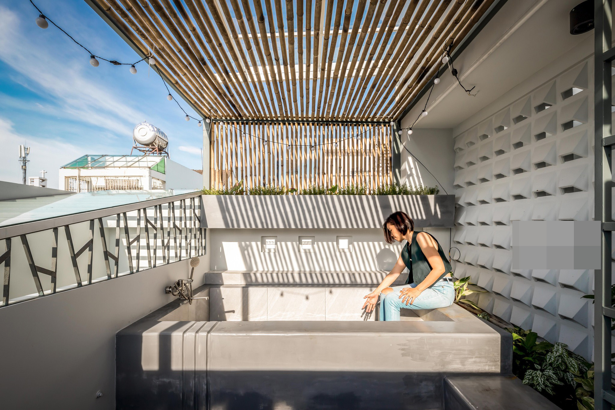 Những tấm bê tông dẻo được ứng dụng ở các phòng, làm ghế hoặc chỗ ngồi chơi, đọc sách cho trẻ. Mảng trần thạch cao bo cong ấn tượng, kết hợp đèn ray trượt ấm cúng. Một góc thú vị ngắm phố phường cho cả gia đình. Khu vườn ở sân trong mang đến sự thanh mát, dễ chịu. Bồn tắm ở sân thượng mang đến trải nghiệm cảm giác nghỉ dưỡng tại gia. Hệ lam làm trần cản nắng mà vẫn hút ánh sáng tối thiểu, cho mọi người tận hưởng sự thư giãn tuyệt vời.