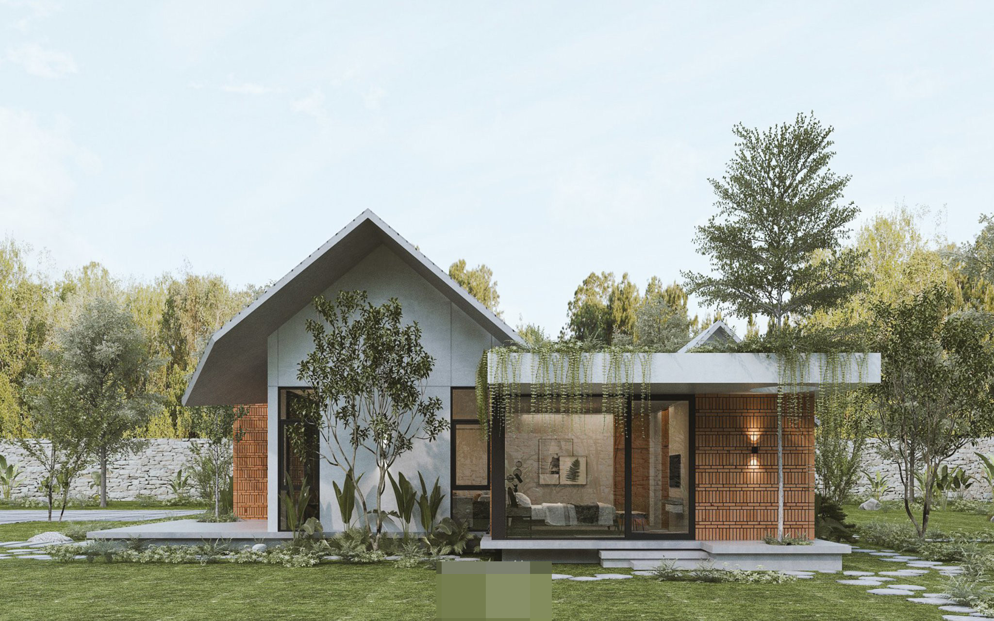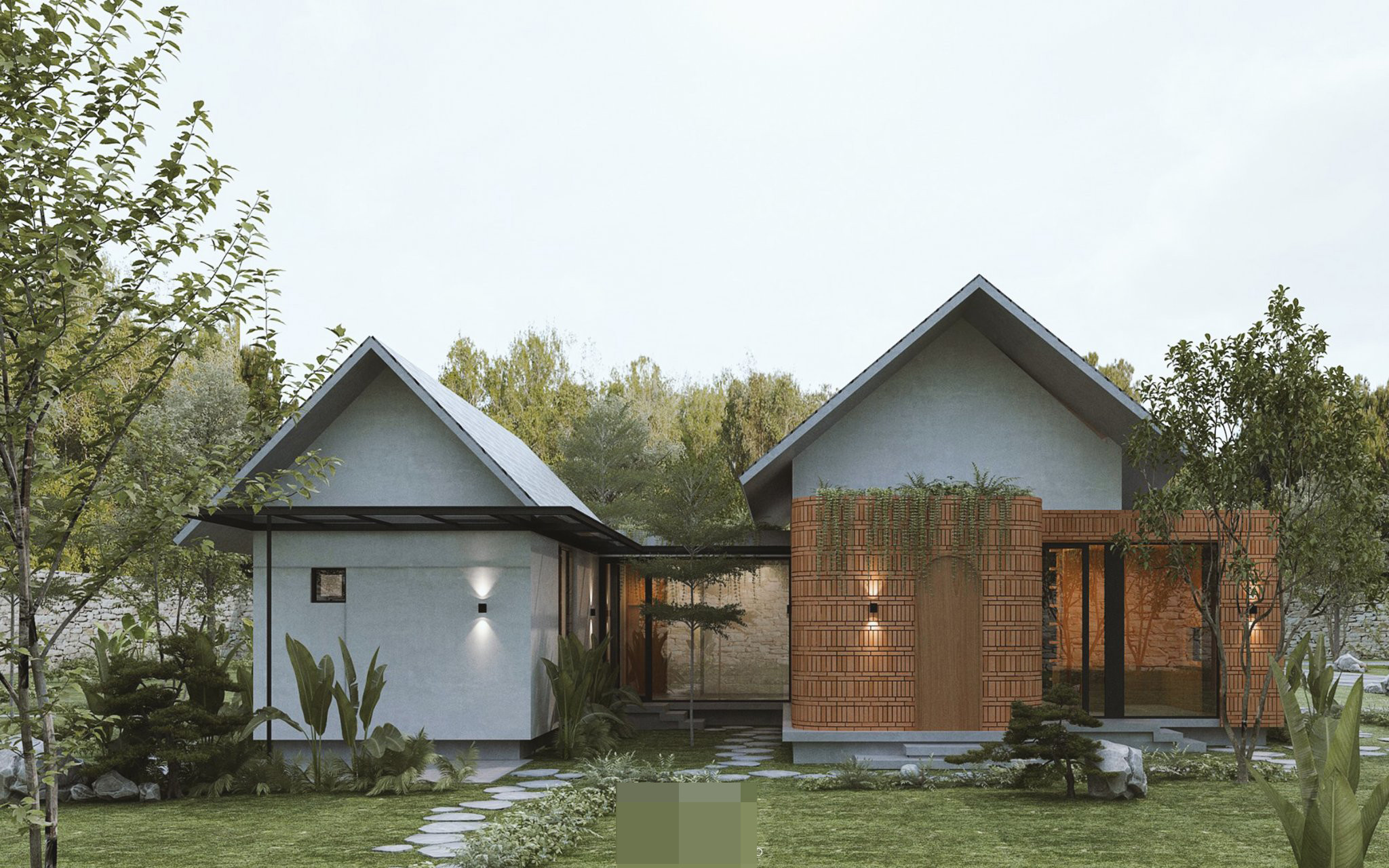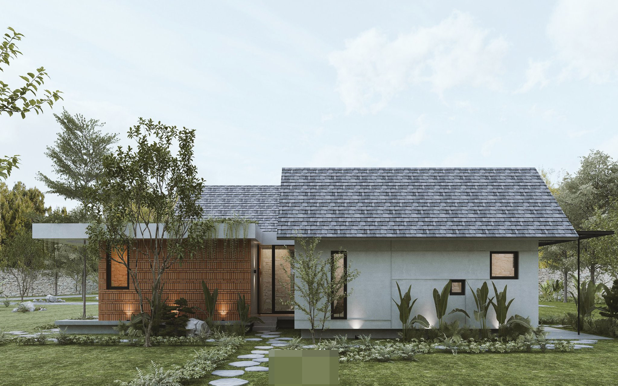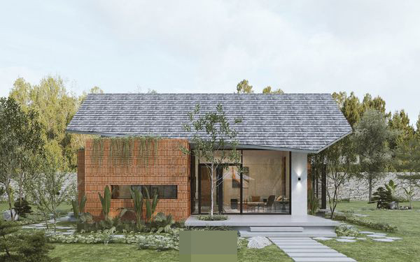 Nhà xây gạch, mái dốc độc đáo kết hợp khung cửa nhôm kính hiện đại, sang trọng. Gia chủ xây ngôi nhà nhằm mục đích tạo nơi chốn nghỉ dưỡng an lành cho vợ con.
