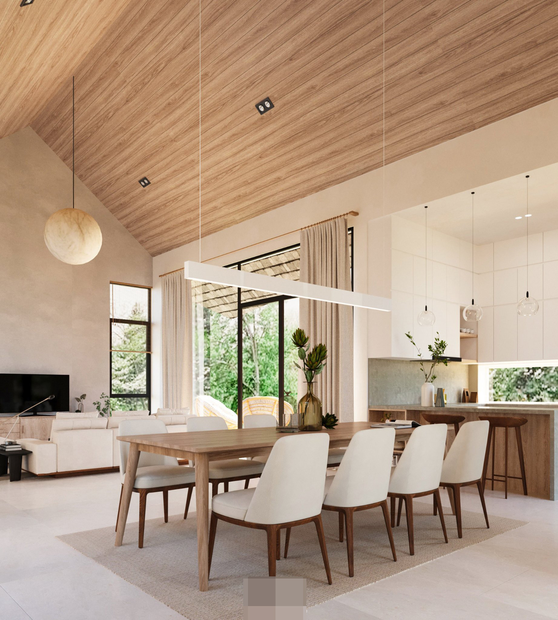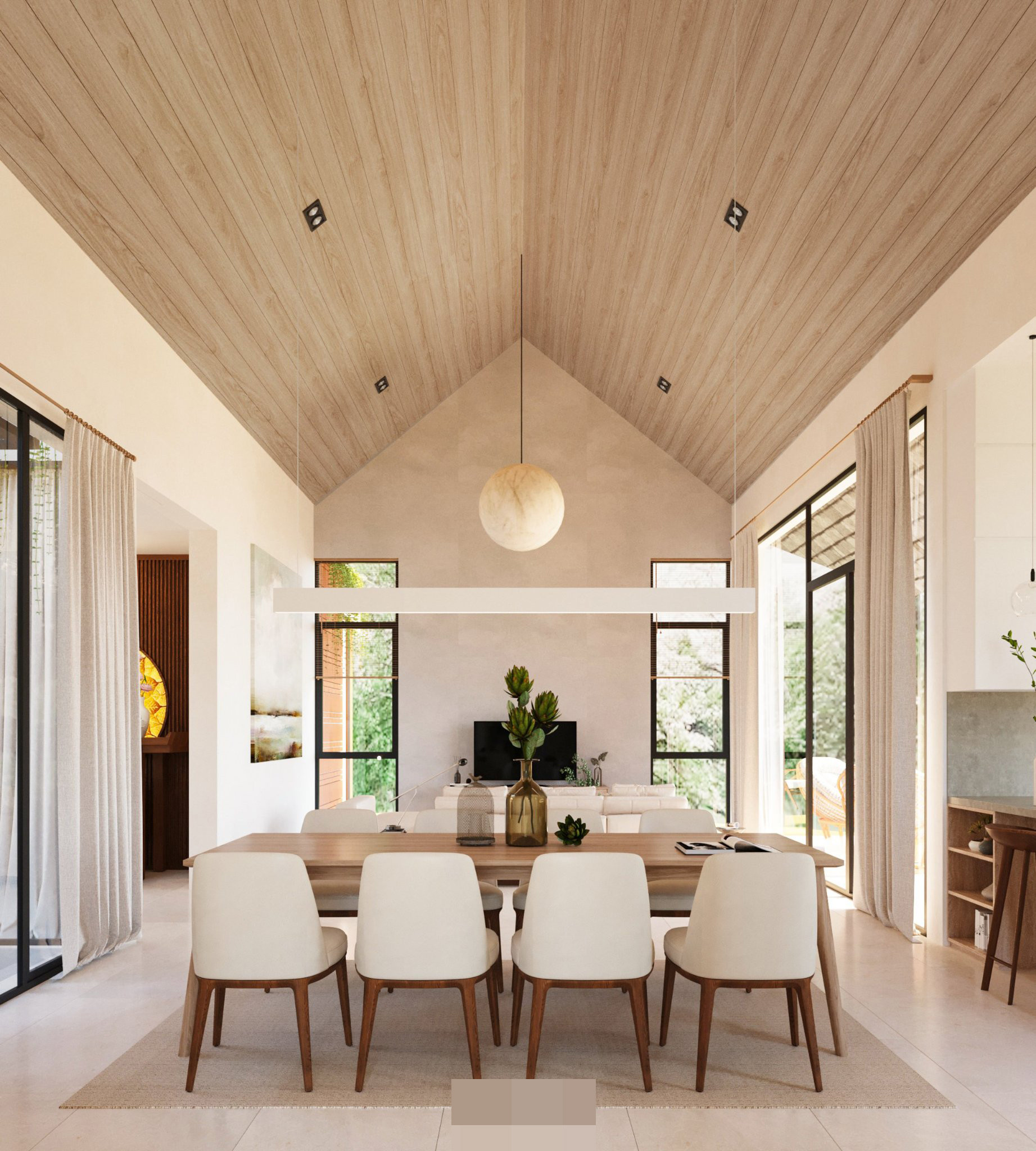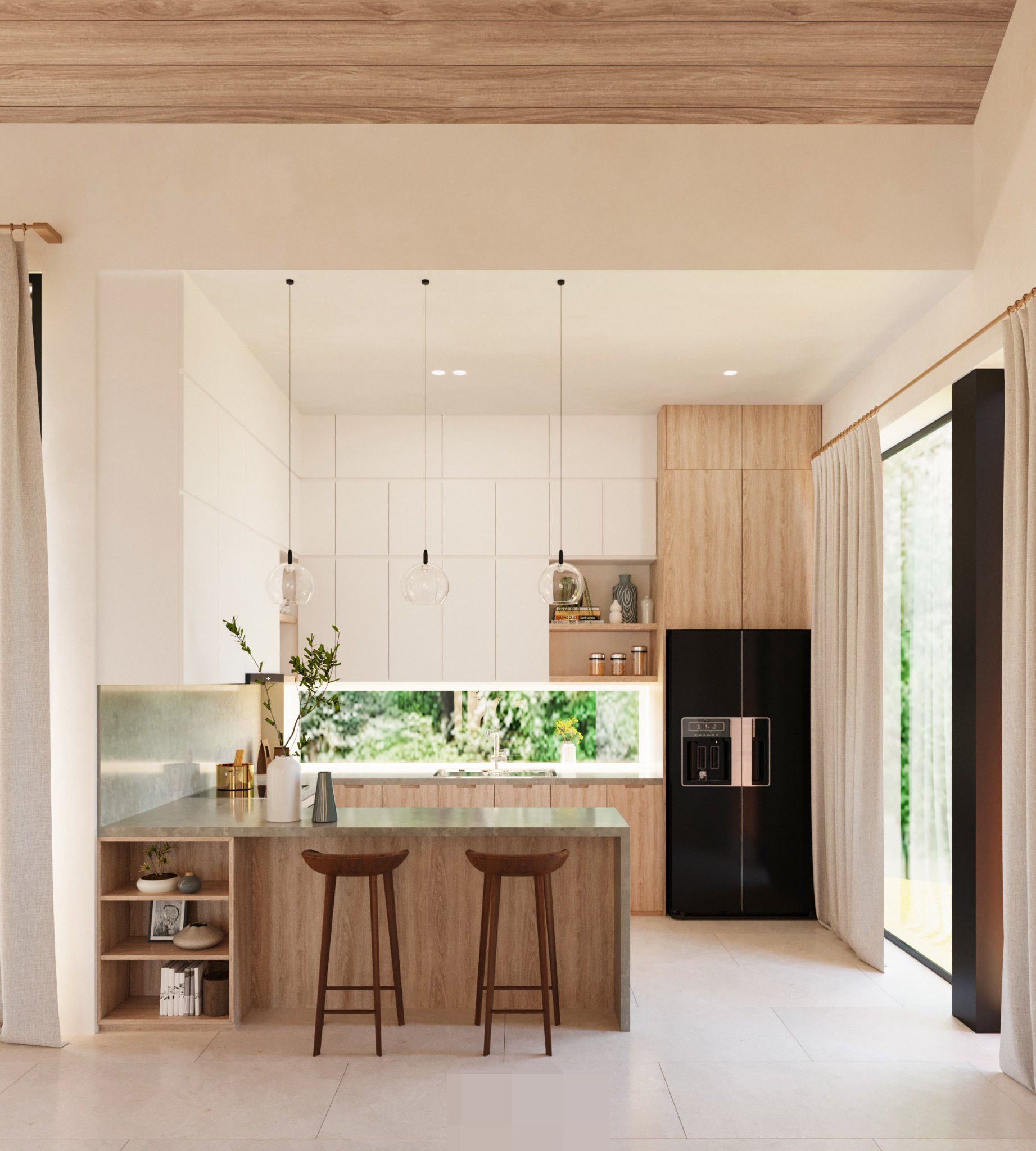 Bếp thông với phòng khách, bốn mặt đều có cửa lớn thoáng đãng. Thiết kế tối giản, giúp không gian thêm rộng rãi.