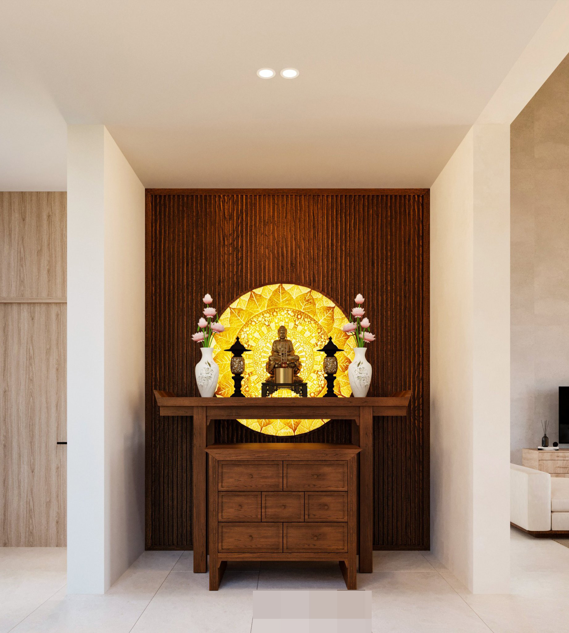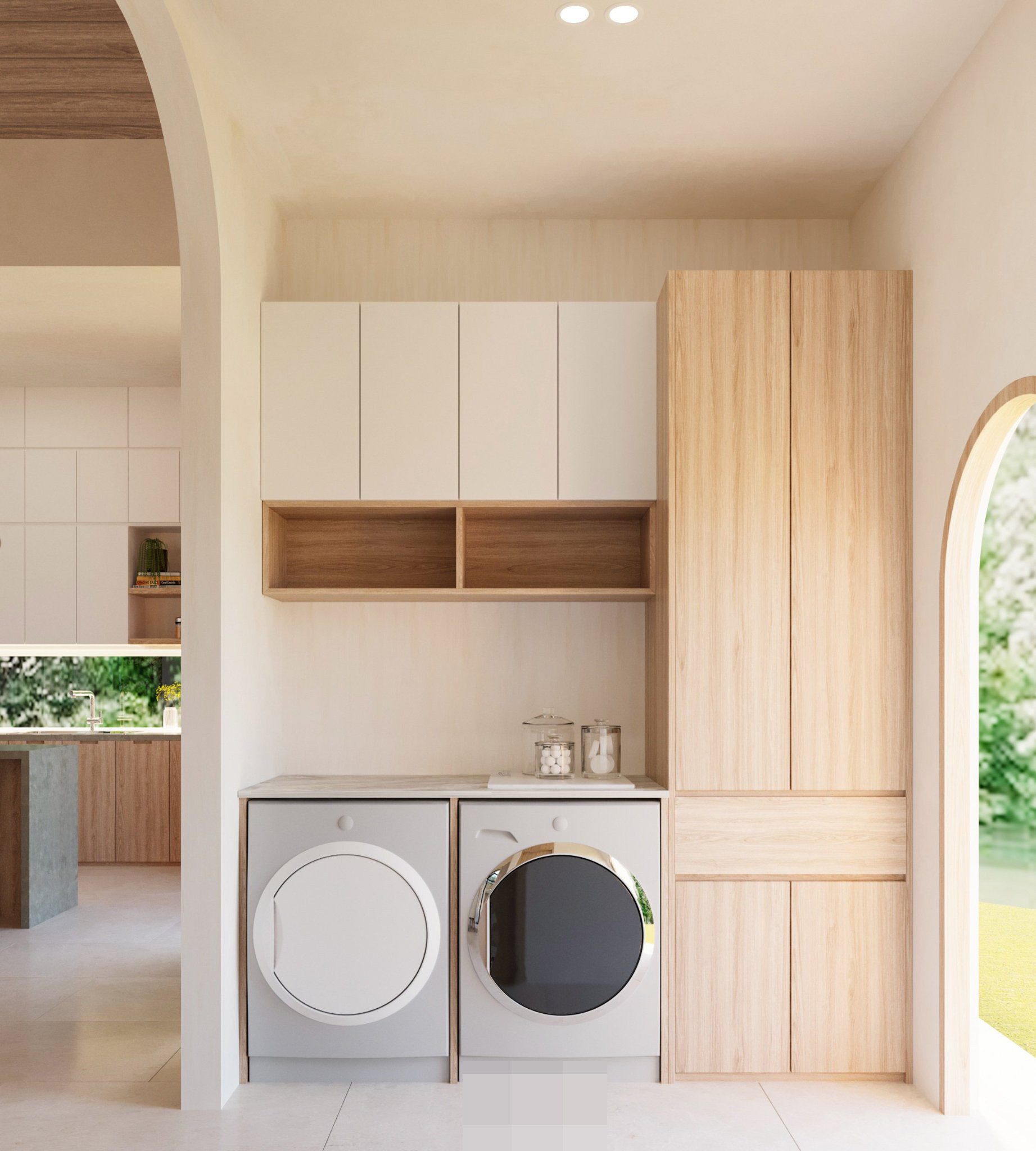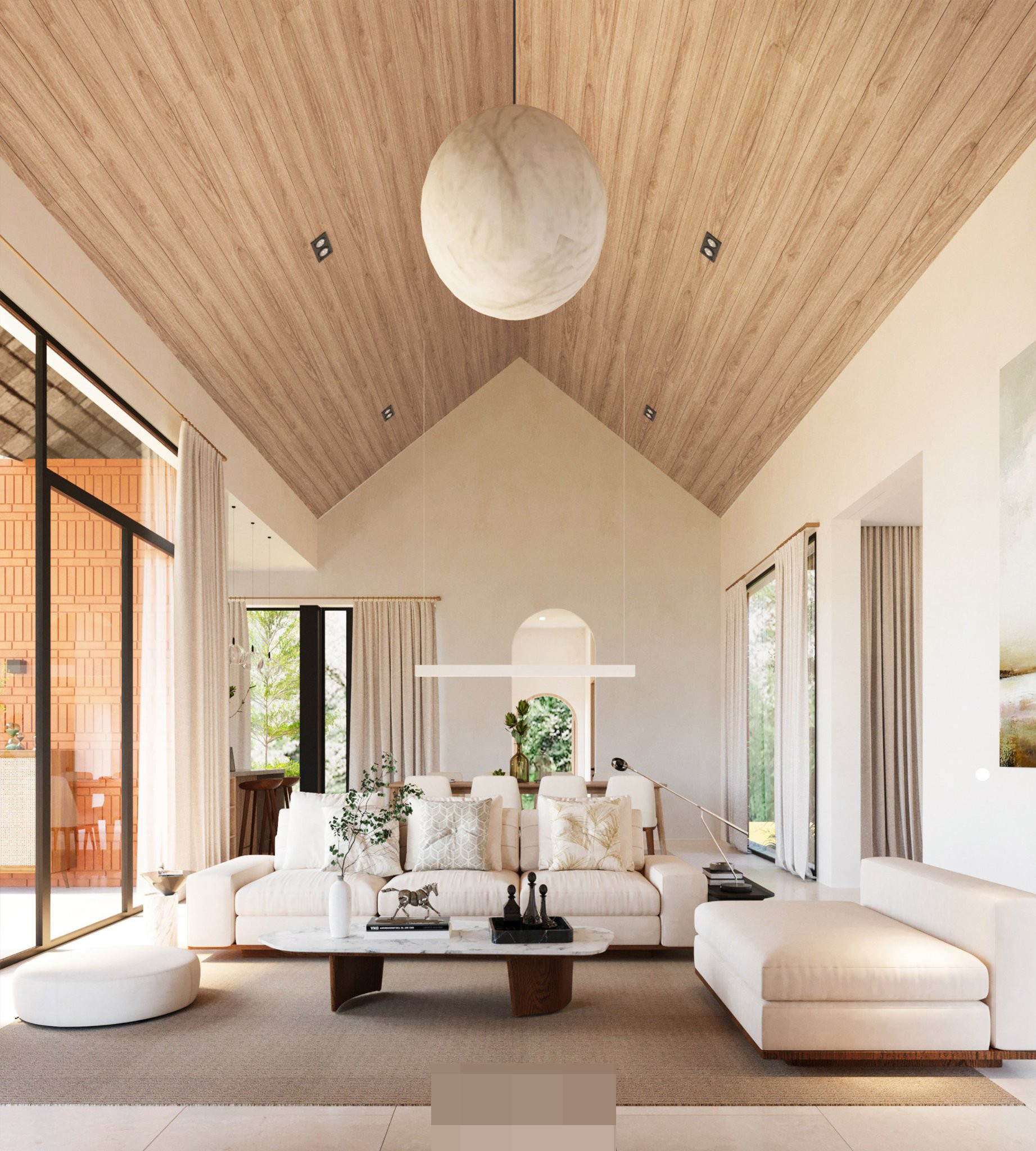 Bếp thông với phòng khách, bốn mặt đều có cửa lớn thoáng đãng. Thiết kế tối giản, giúp không gian thêm rộng rãi.