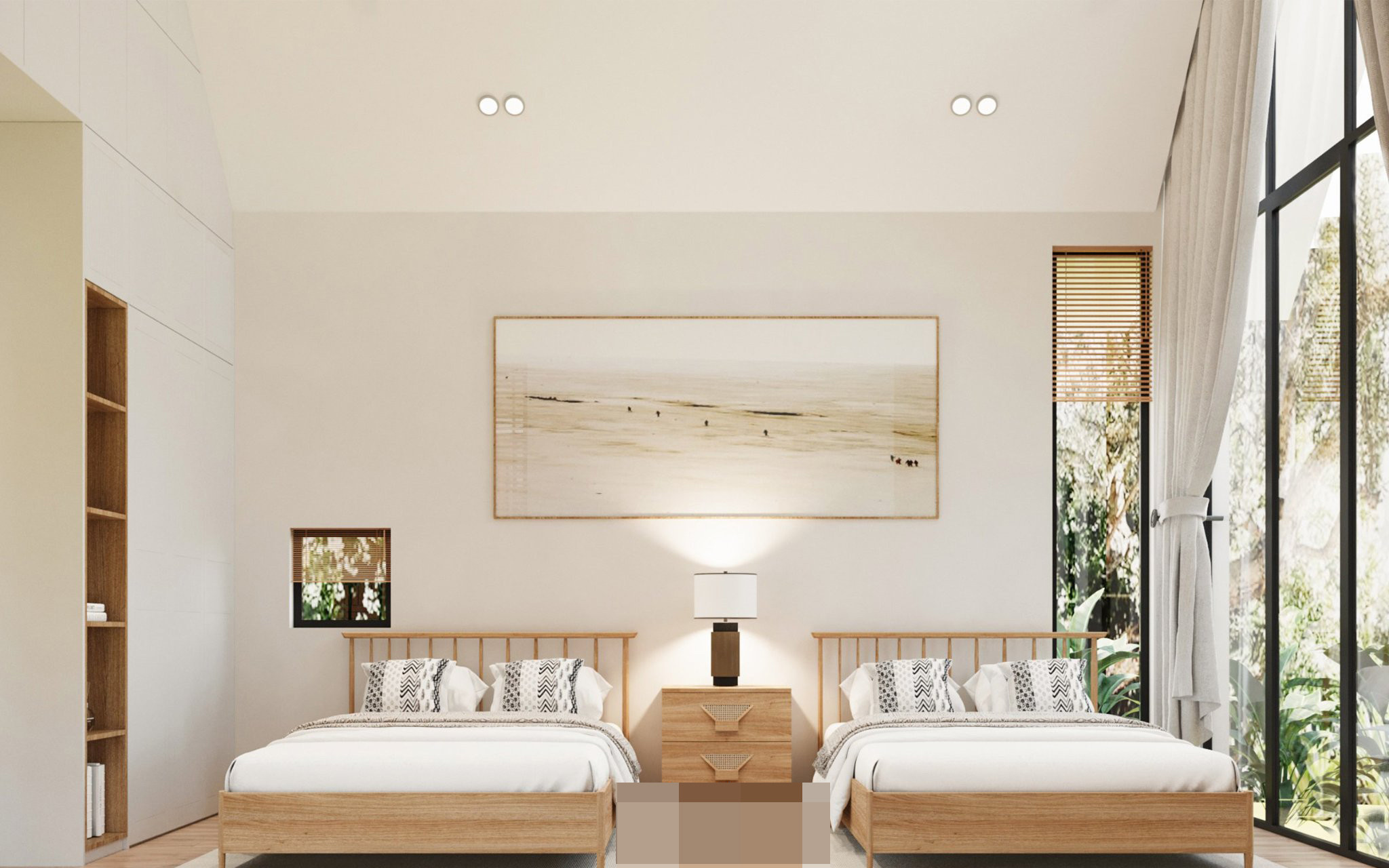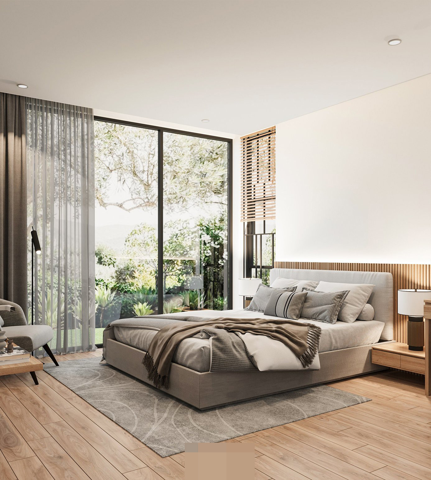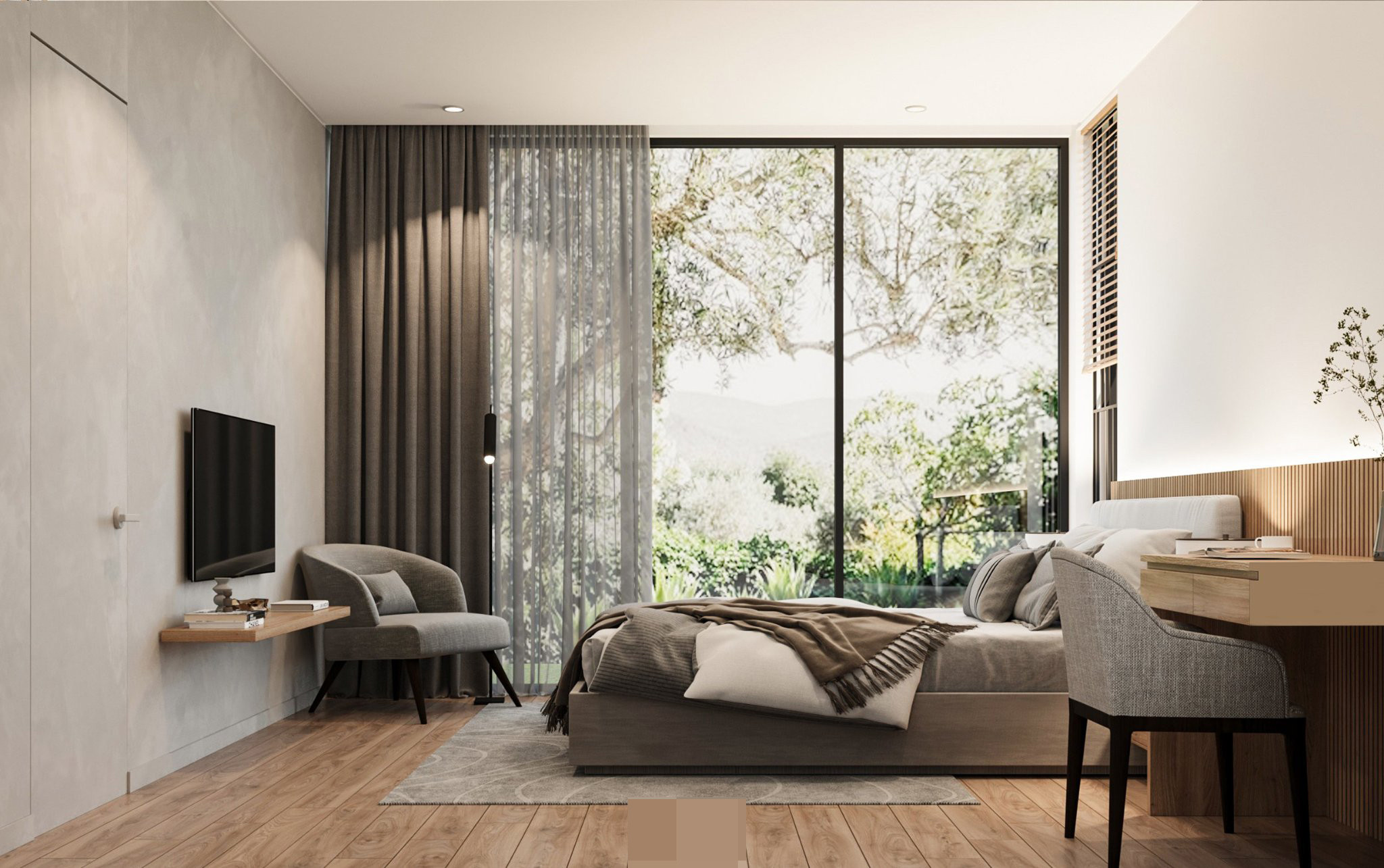 Phòng ngủ màu sắc trắng trang nhã, nhìn ra cây cối, thảm cỏ.