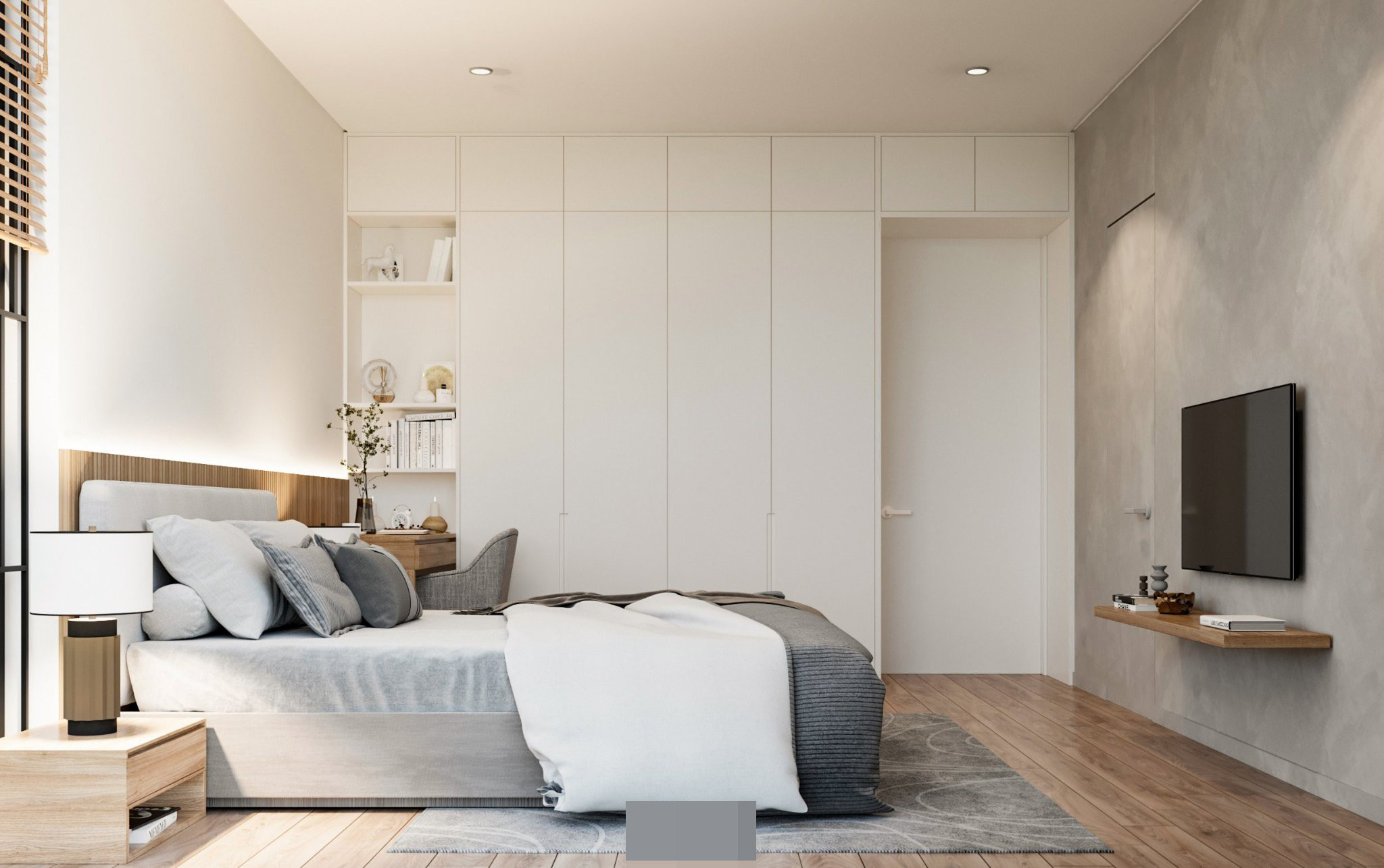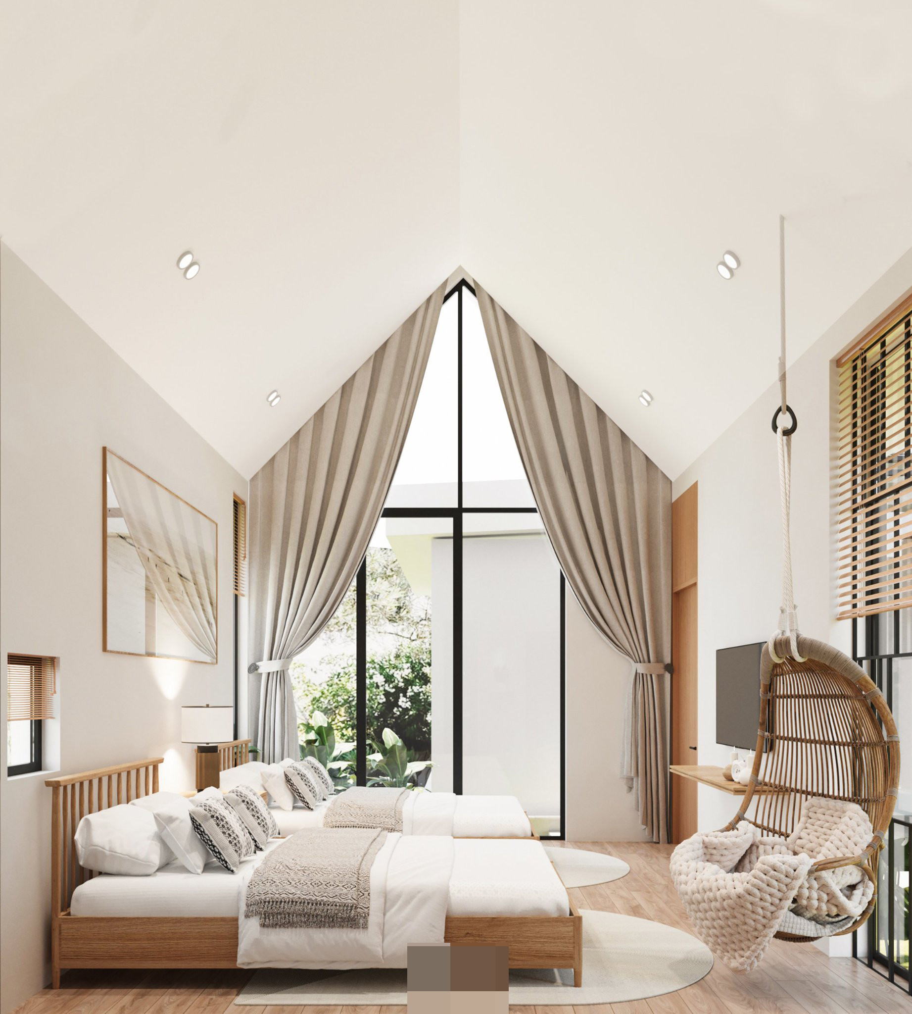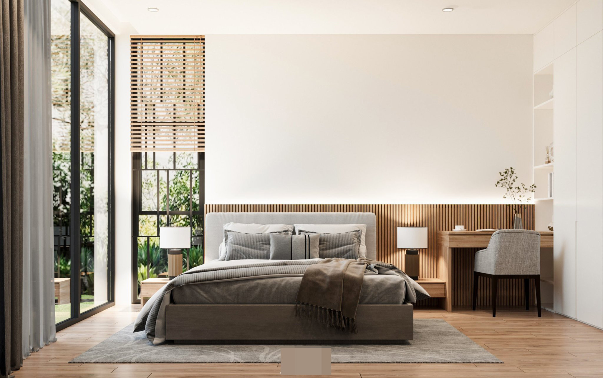 Phòng ngủ màu sắc trắng trang nhã, nhìn ra cây cối, thảm cỏ.