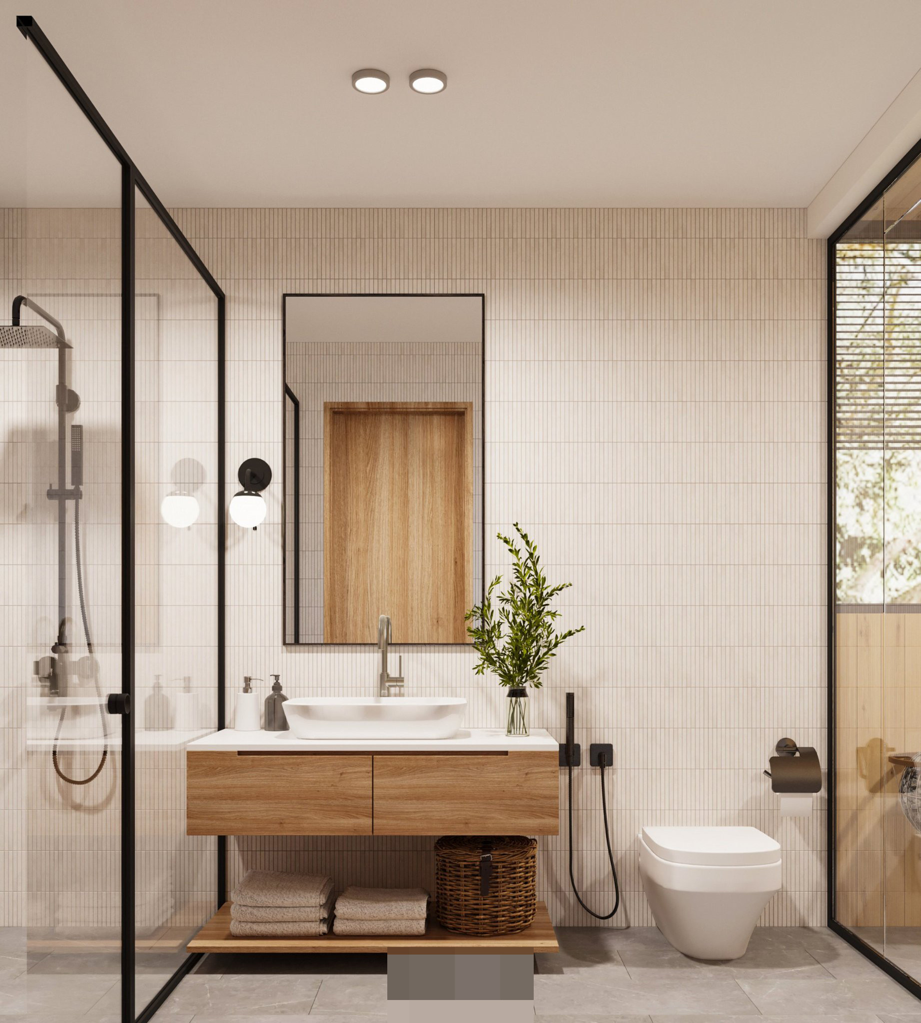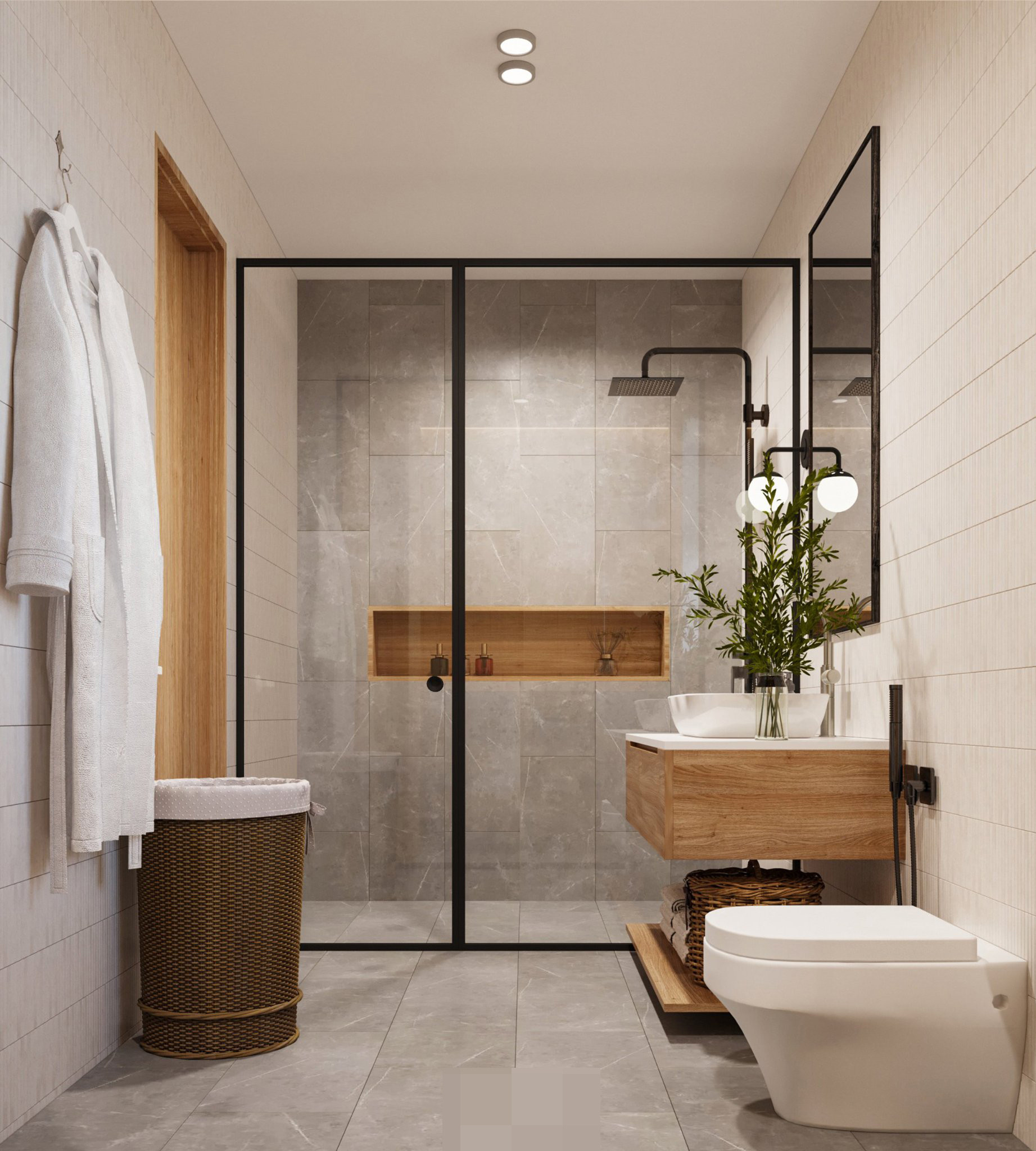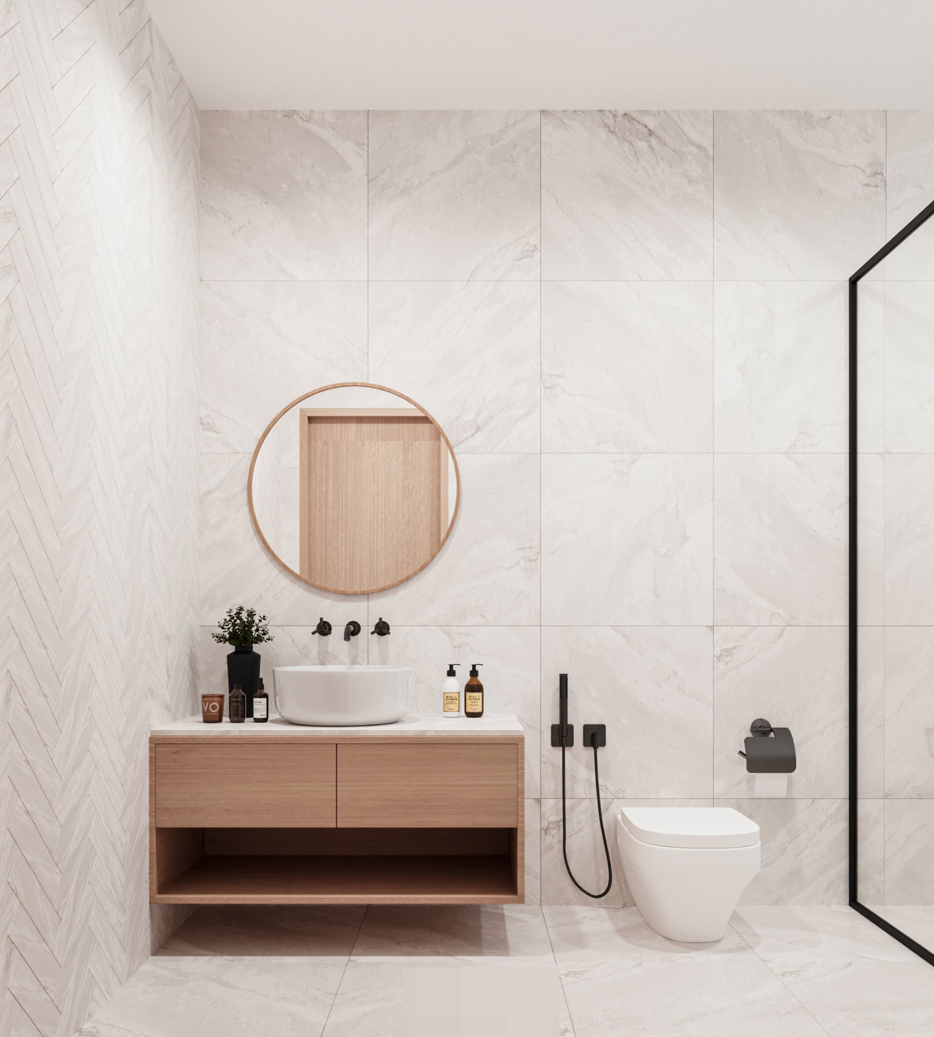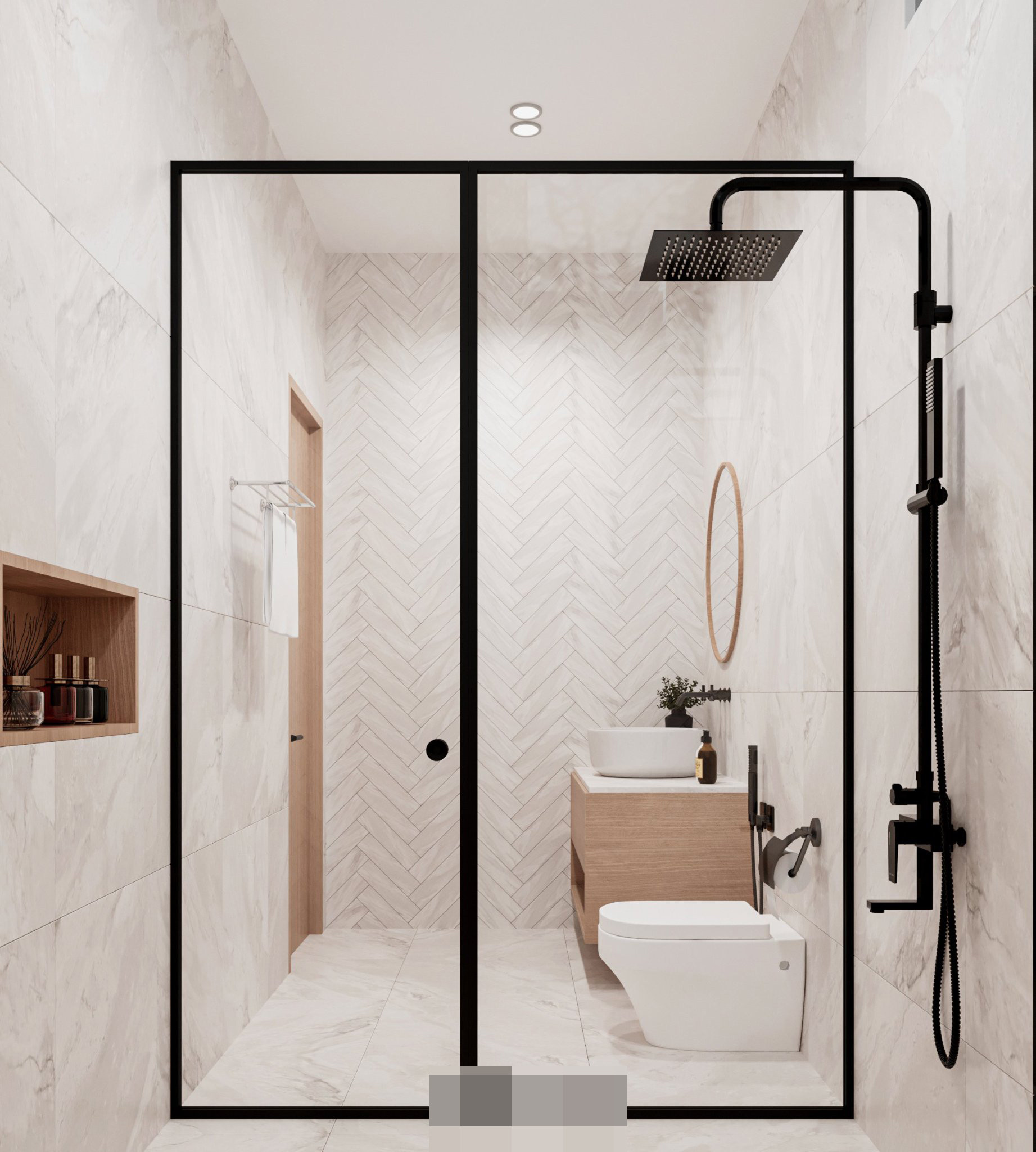 Phòng vệ sinh ốp gạch kiểu xương cá thẩm mỹ, ấn tượng.