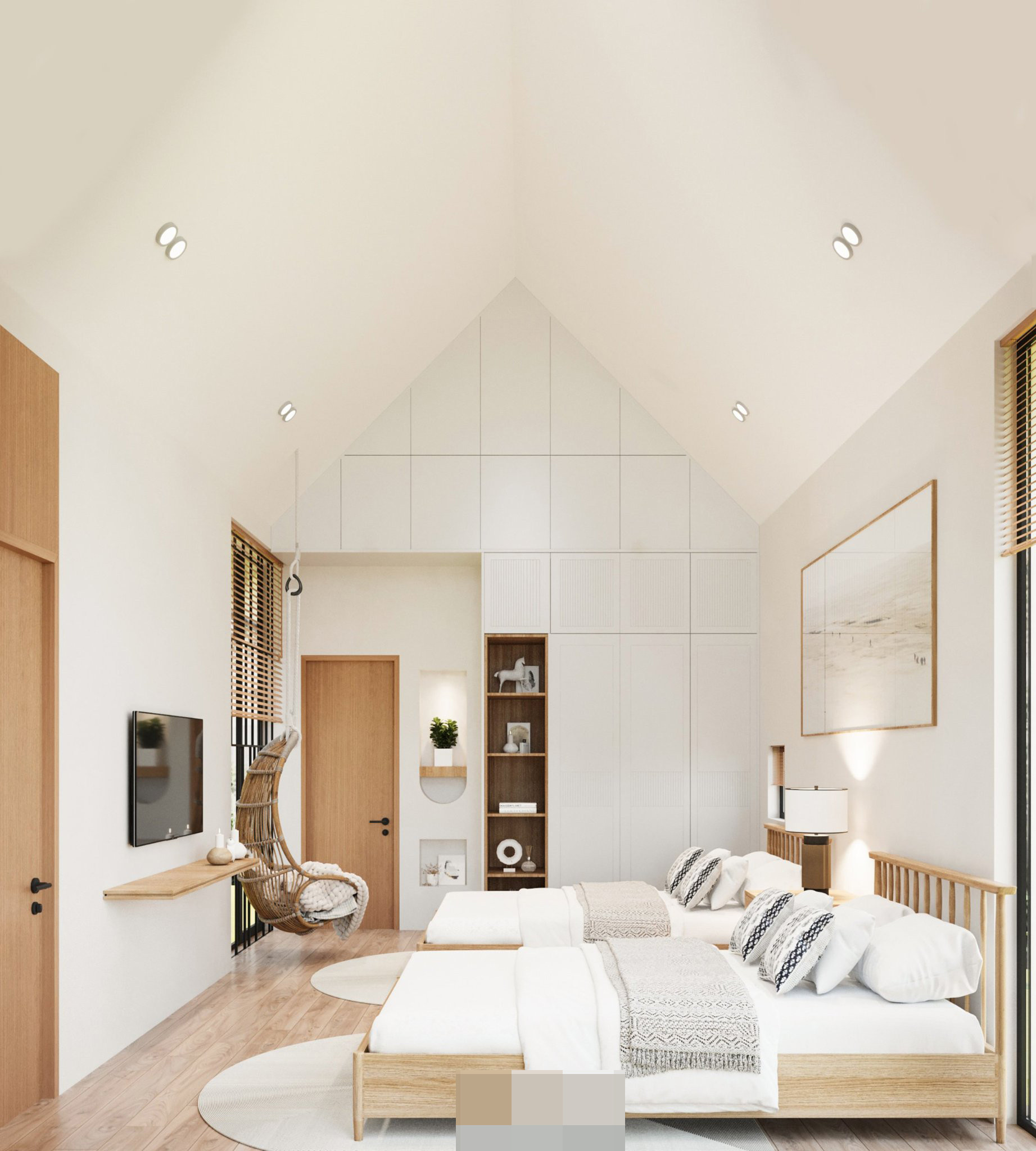 Phòng ngủ cho các con bố trí hai giường đơn, chiếc xích đu mây êm ái, mát mẻ.