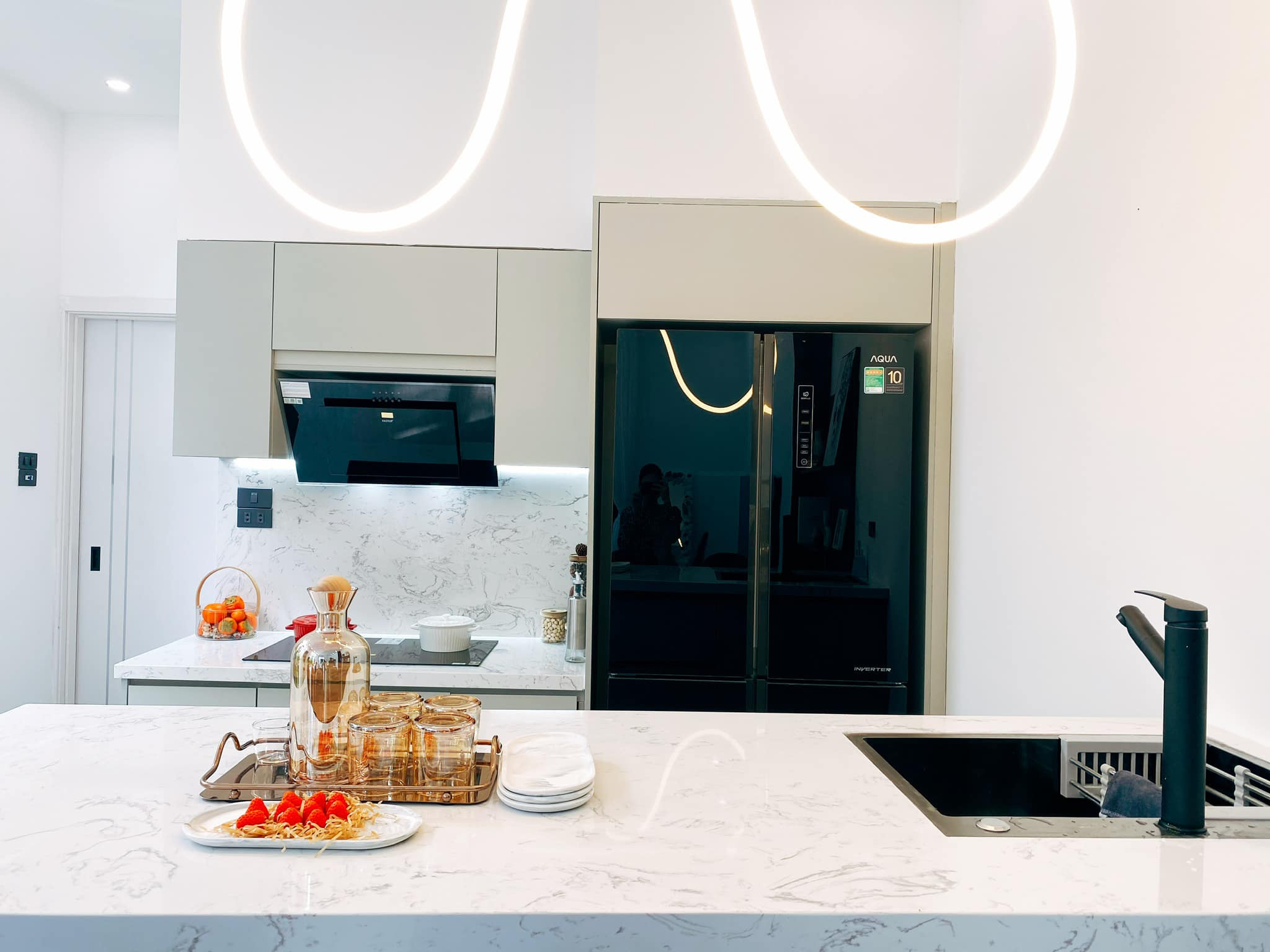 Bàn đảo dùng đá nhân tạo vân trắng dễ lau chùi, vệ sinh. Tuy nhiên, để giữ mặt bếp luôn trắng sáng theo thời gian, nữ gia chủ giữ khá cẩn thận, tránh để đồ ố màu dây ra mặt bàn.