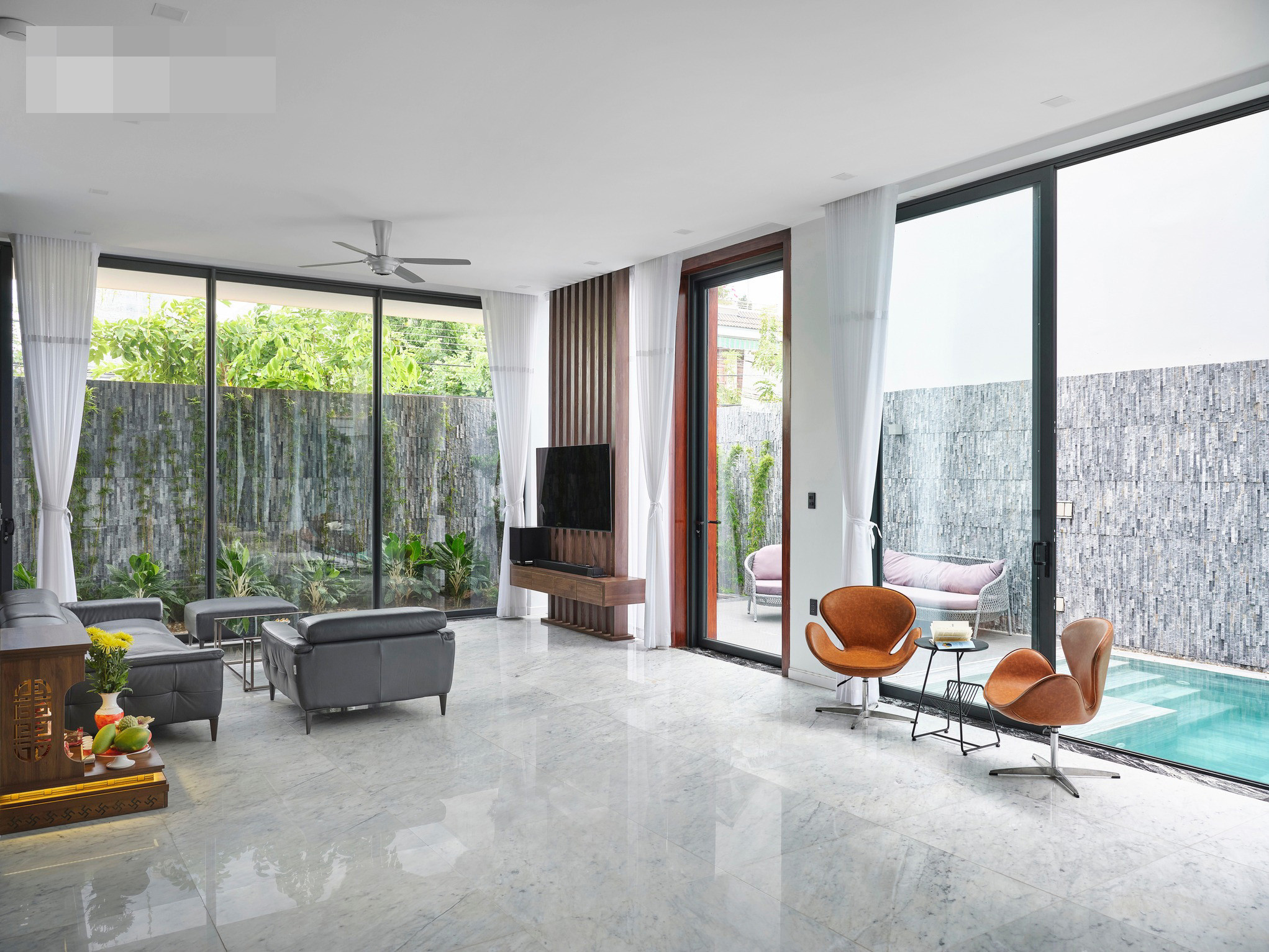 Phòng khách và bếp thiết kế không gian mở nhìn ra bể bơi, sân vườn theo kiểu villa nghỉ dưỡng.