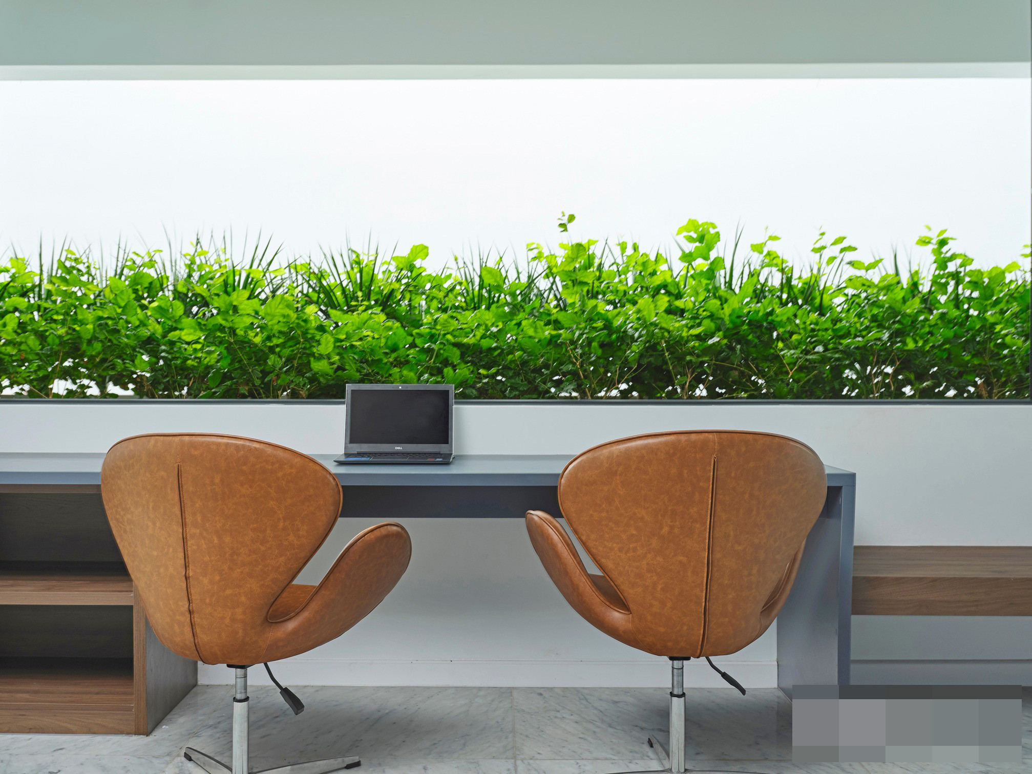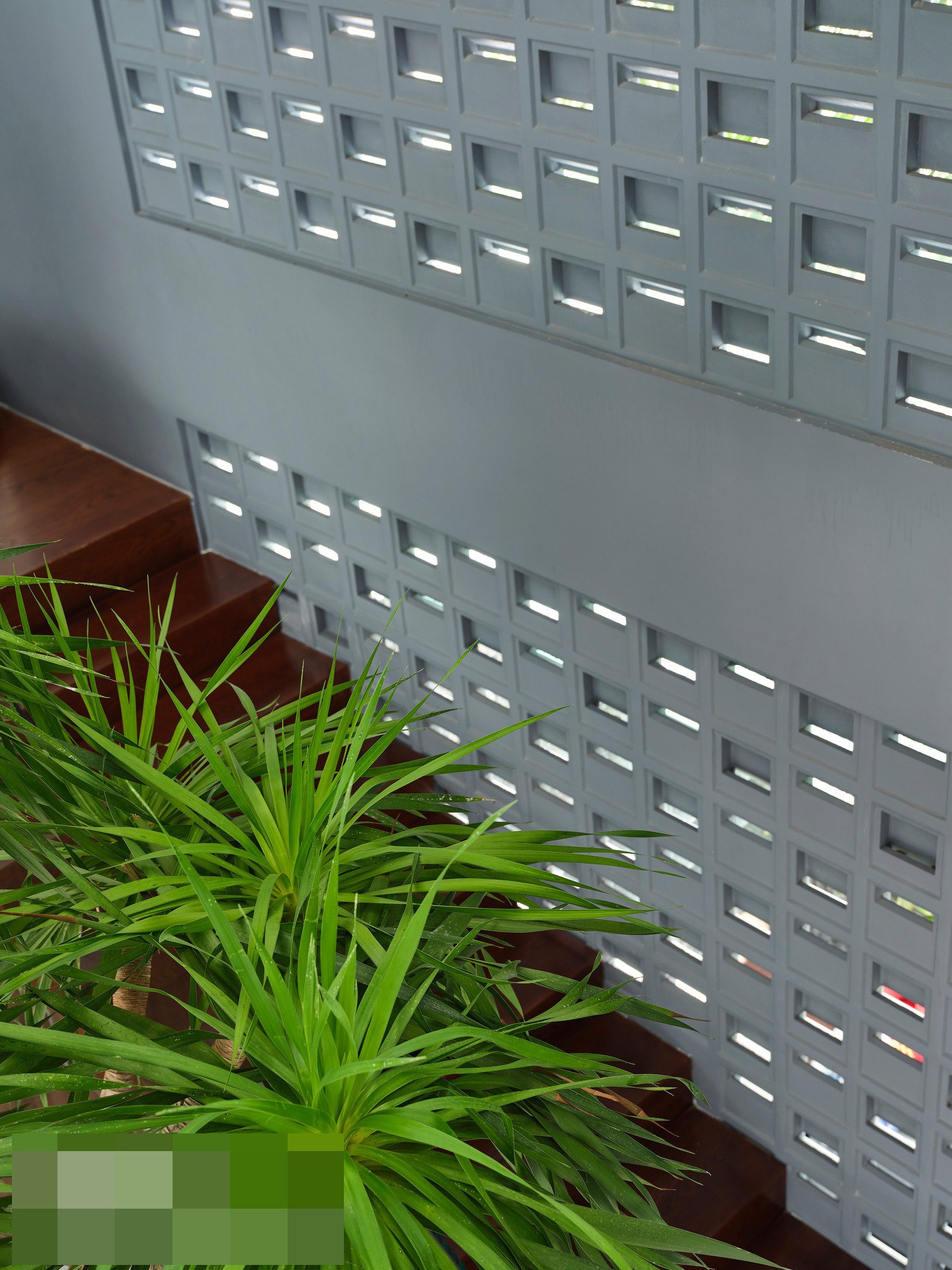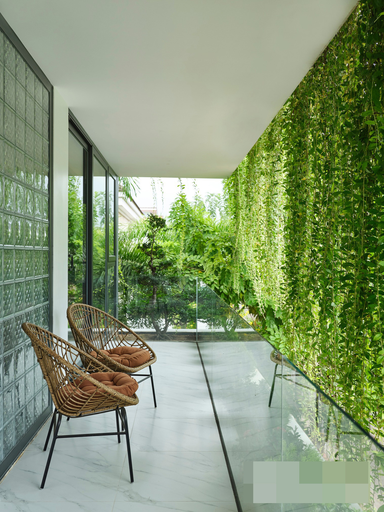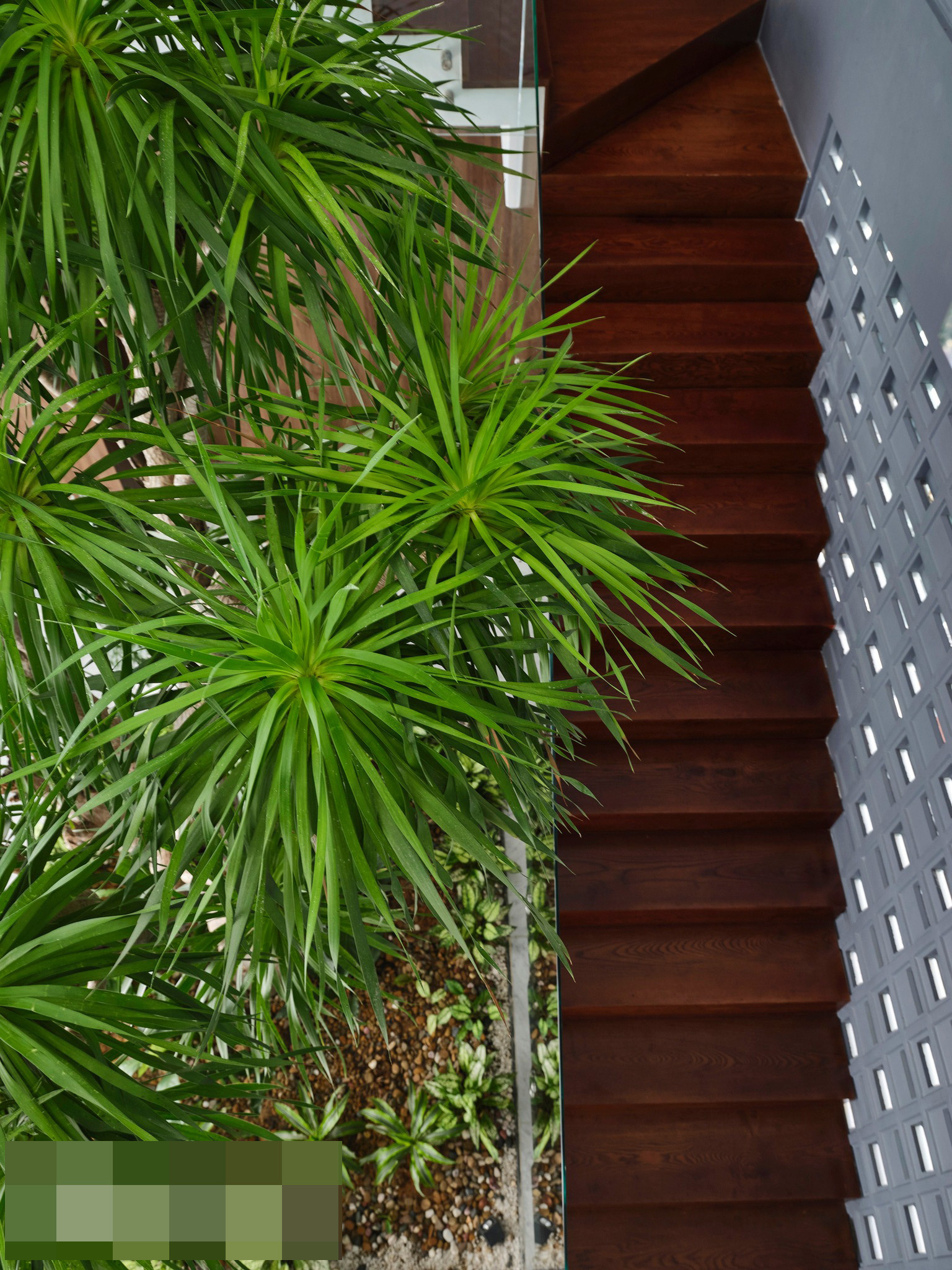 Khung cửa kính rộng mang đến tầm nhìn bao quát ra khoảng không trong trẻo. Cây thần tài núi trồng dưới giếng trời đang sinh trưởng tốt. Mảng tường phía sau xây gạch bông tạo điểm nhấn.