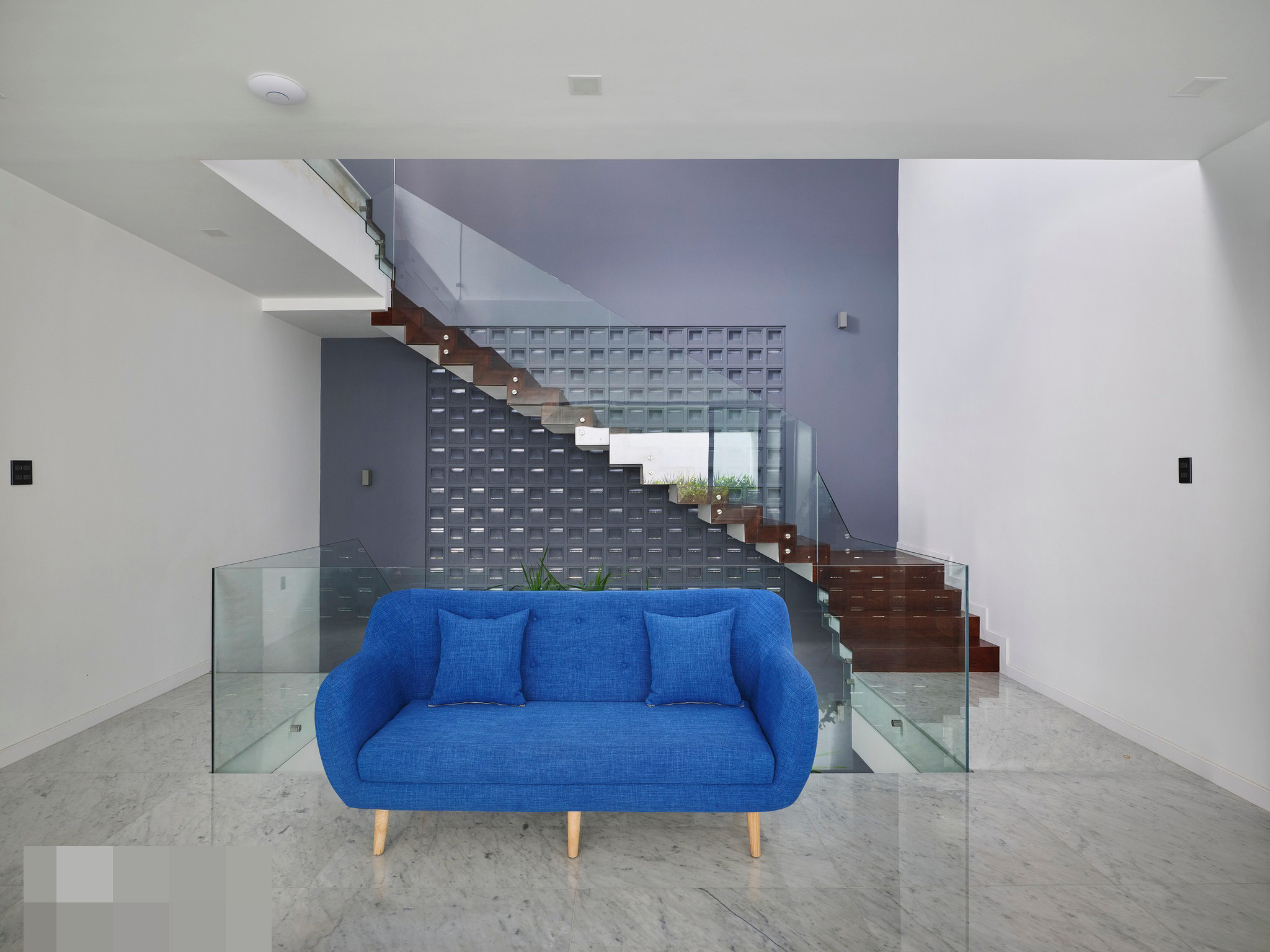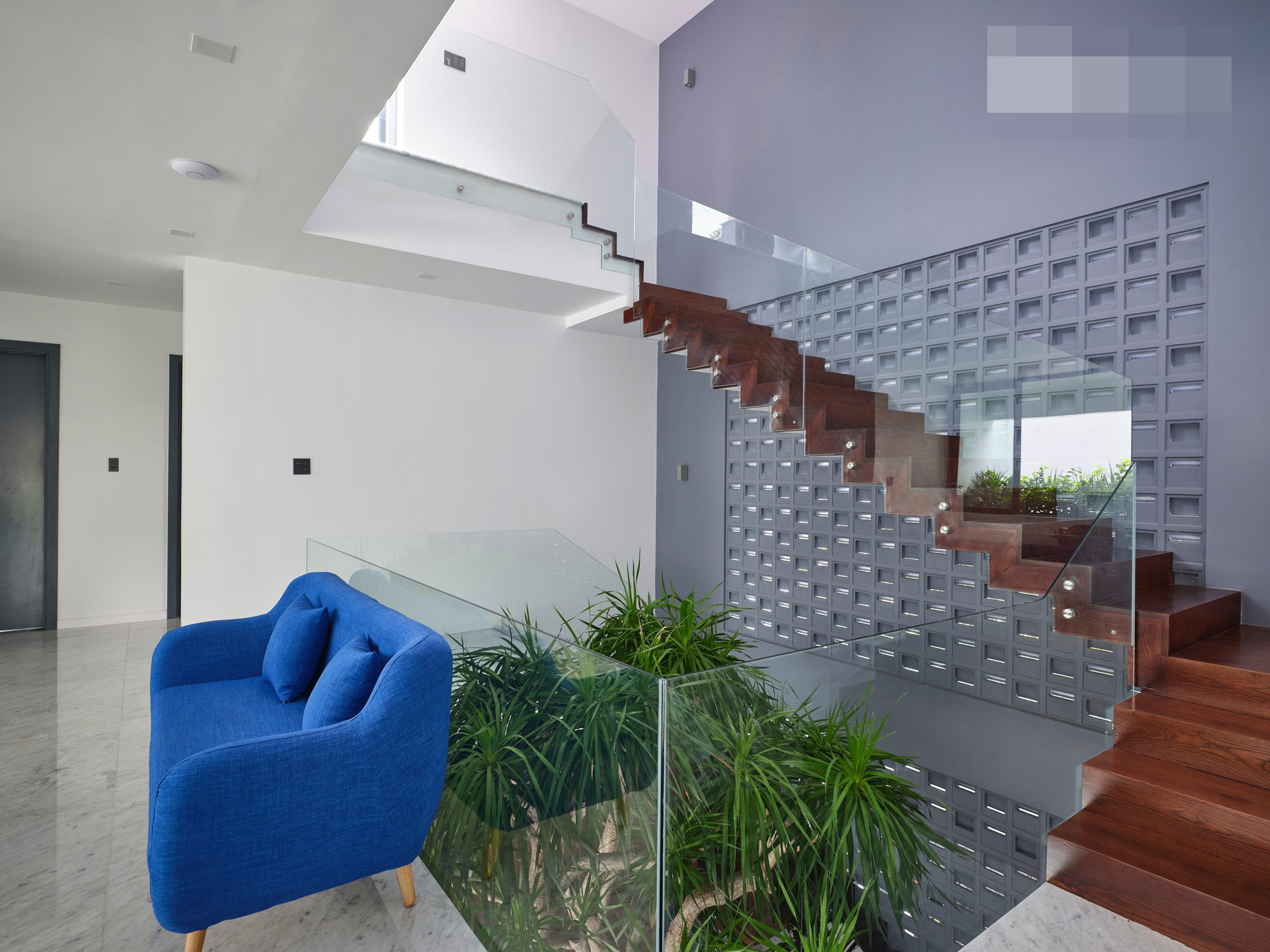 Khoảng nghỉ nhóm thiết kế đặt ghế sofa văng dài. Phần cầu thang tay vịn kính sang trọng, tinh tế.